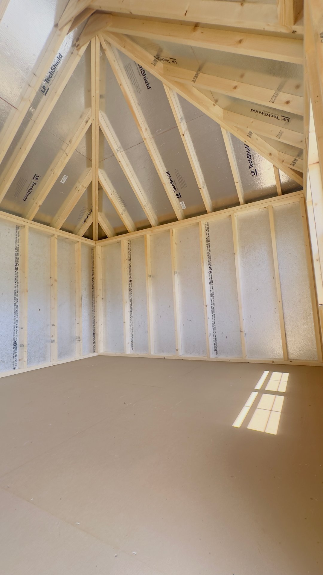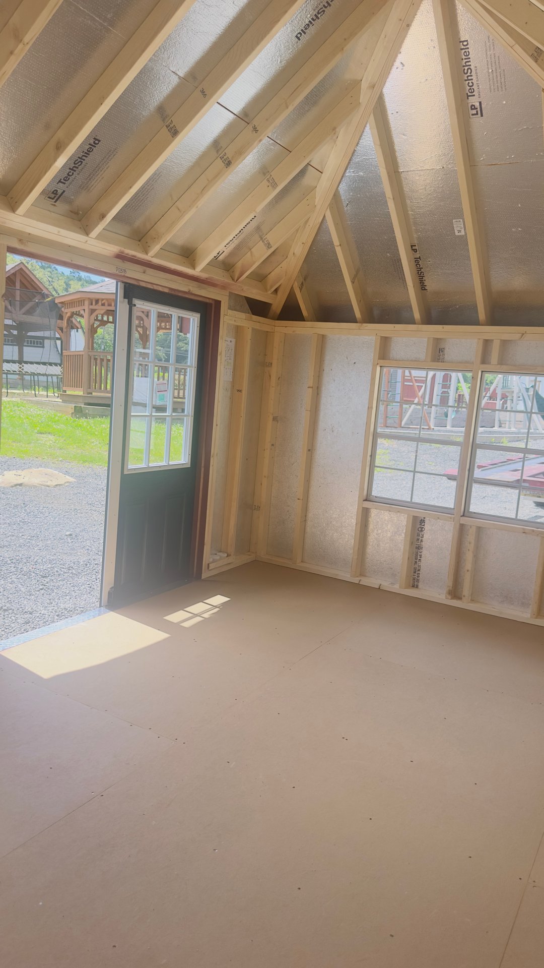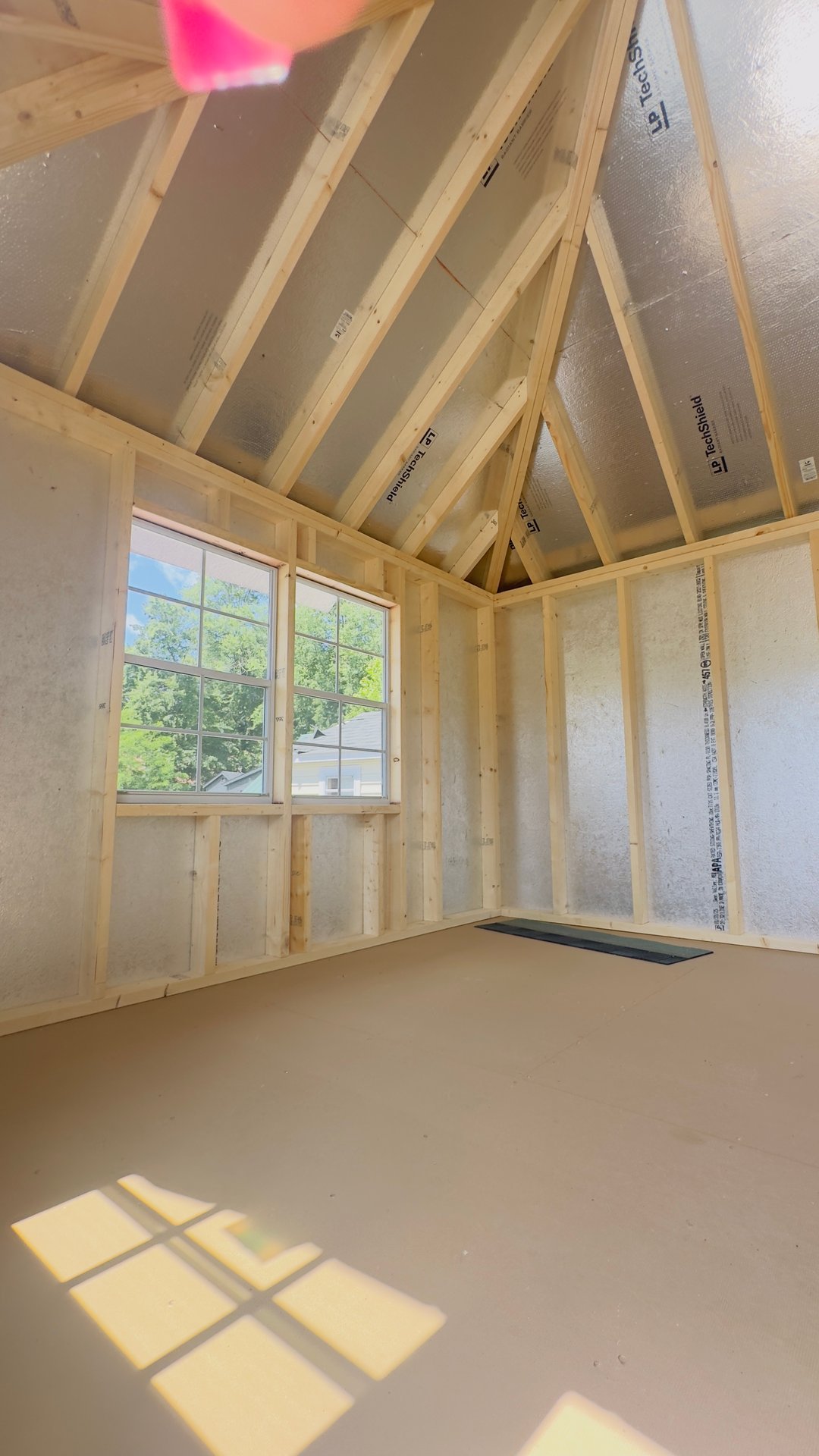 Bold and functional, this 10×16 Manchester shed features timeless red LP Smart Panel siding with crisp white trim and a sleek black architectural shingle roof. Four windows, including two upgraded 24″x36″ vertical sliders, provide generous natural light and ventilation. The upgraded fiberglass double doors include elegant 9-light inserts for a touch of sophistication and improved visibility. Z-style shutters on two window pairs add rustic flair, while a ridge vent ensures better airflow year-round. With 3/4″ LP ProStruct flooring underfoot, this shed combines classic appeal with upgraded performance for reliable, everyday use.