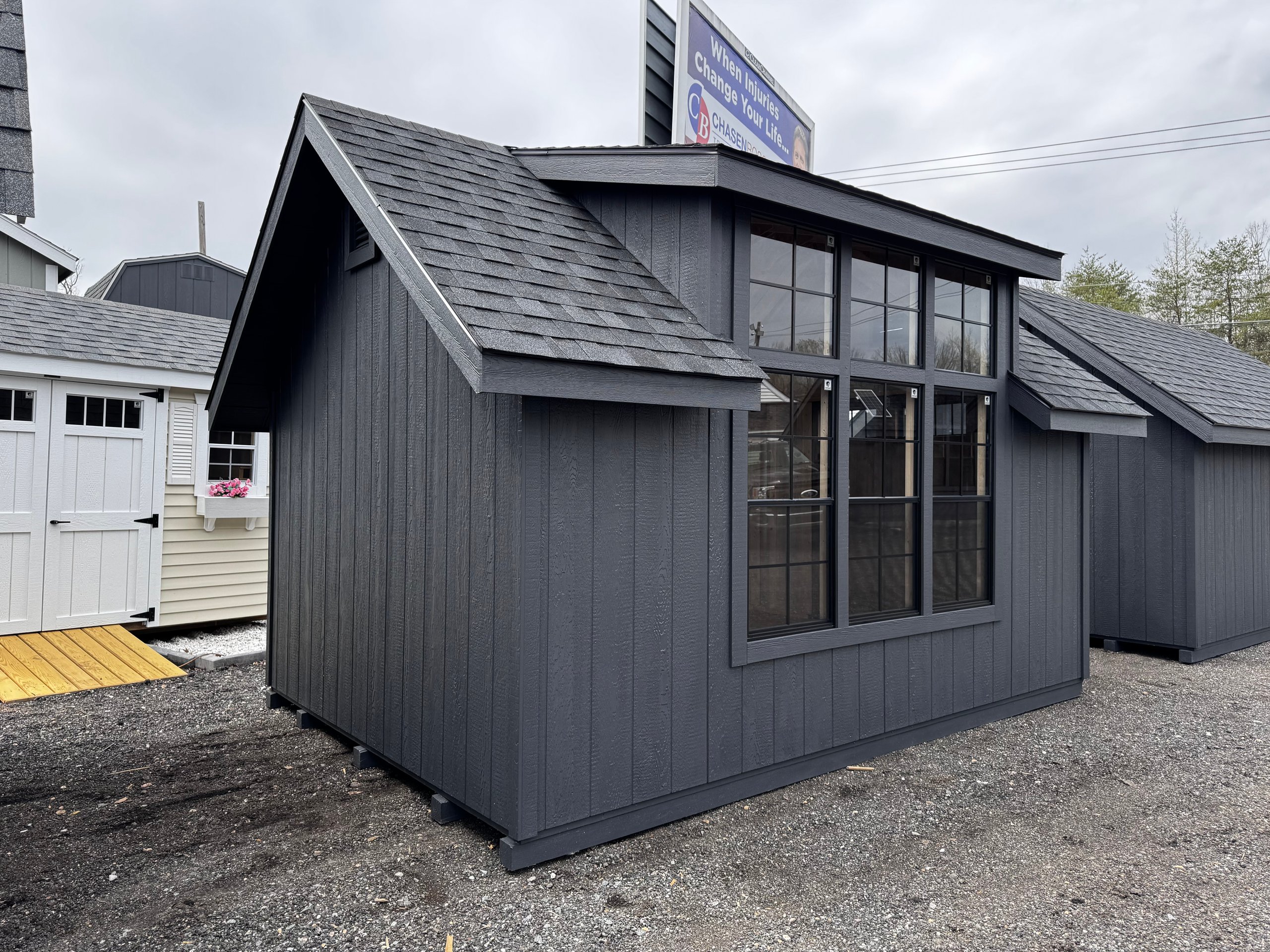 Elevate your backyard with the Victorian A-Frame 10×14 Amish-Built Storage Shed, blending timeless design with unmatched craftsmanship. Featuring LP Smart Panel siding in a striking Mopboard finish, black architectural shingles, and a modern farmhouse 3-transom dormer, this shed offers both beauty and durability. Eight 24×28 black windows and transom windows on the pine double doors provide natural light. Built with pressure-treated 2×4 framing, LP Tech Shield roof sheeting, and ¾” LP Prostruct flooring, this shed is designed to last. Whether for storage, a workshop, or a garden retreat, this elegant structure delivers function and style.