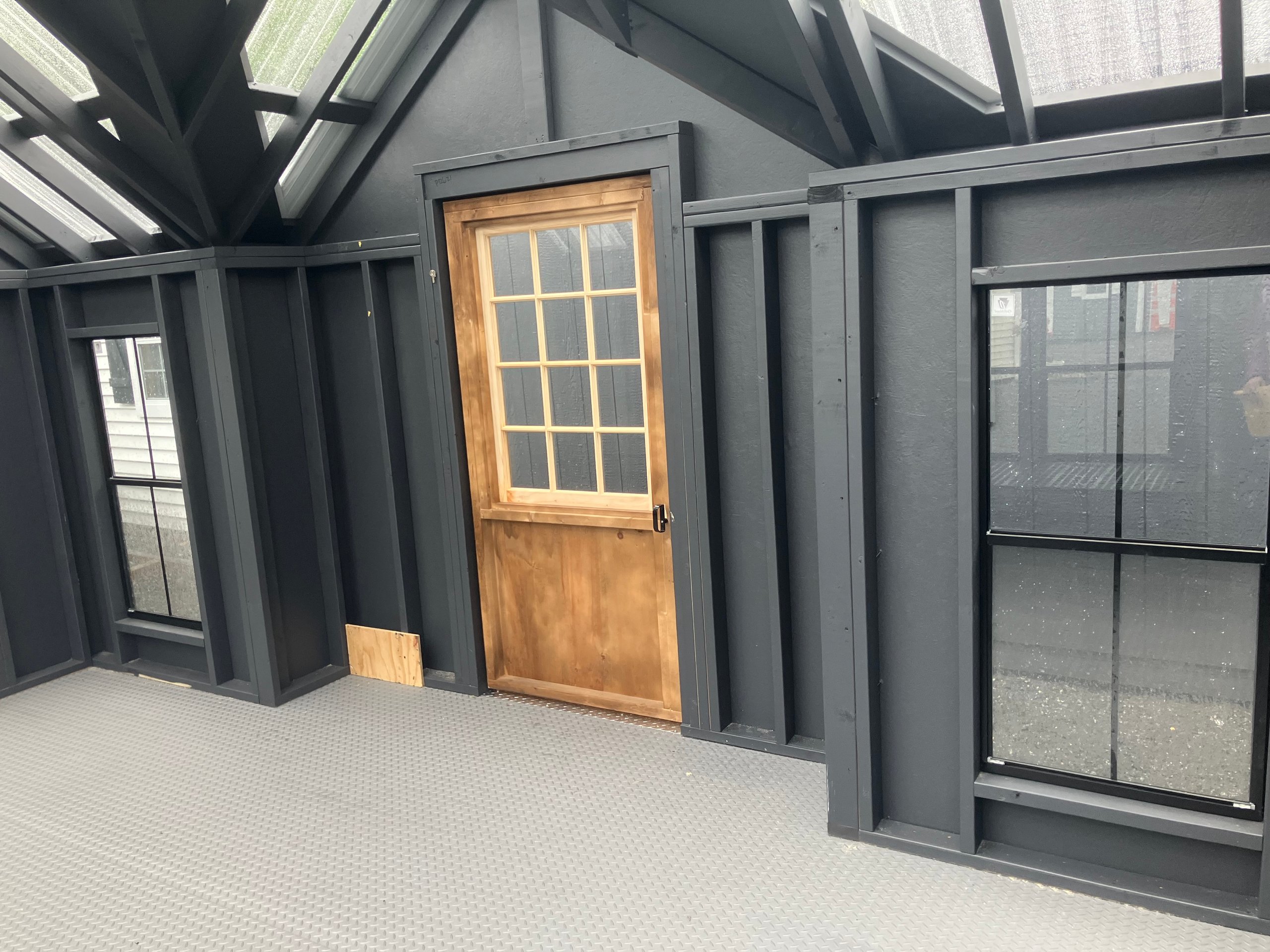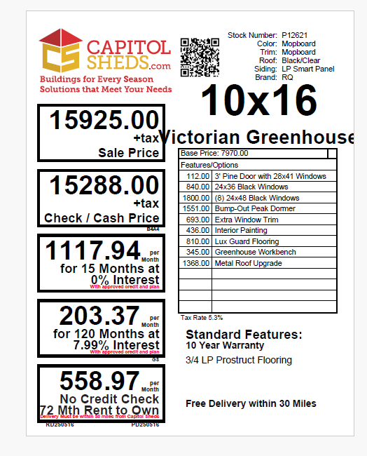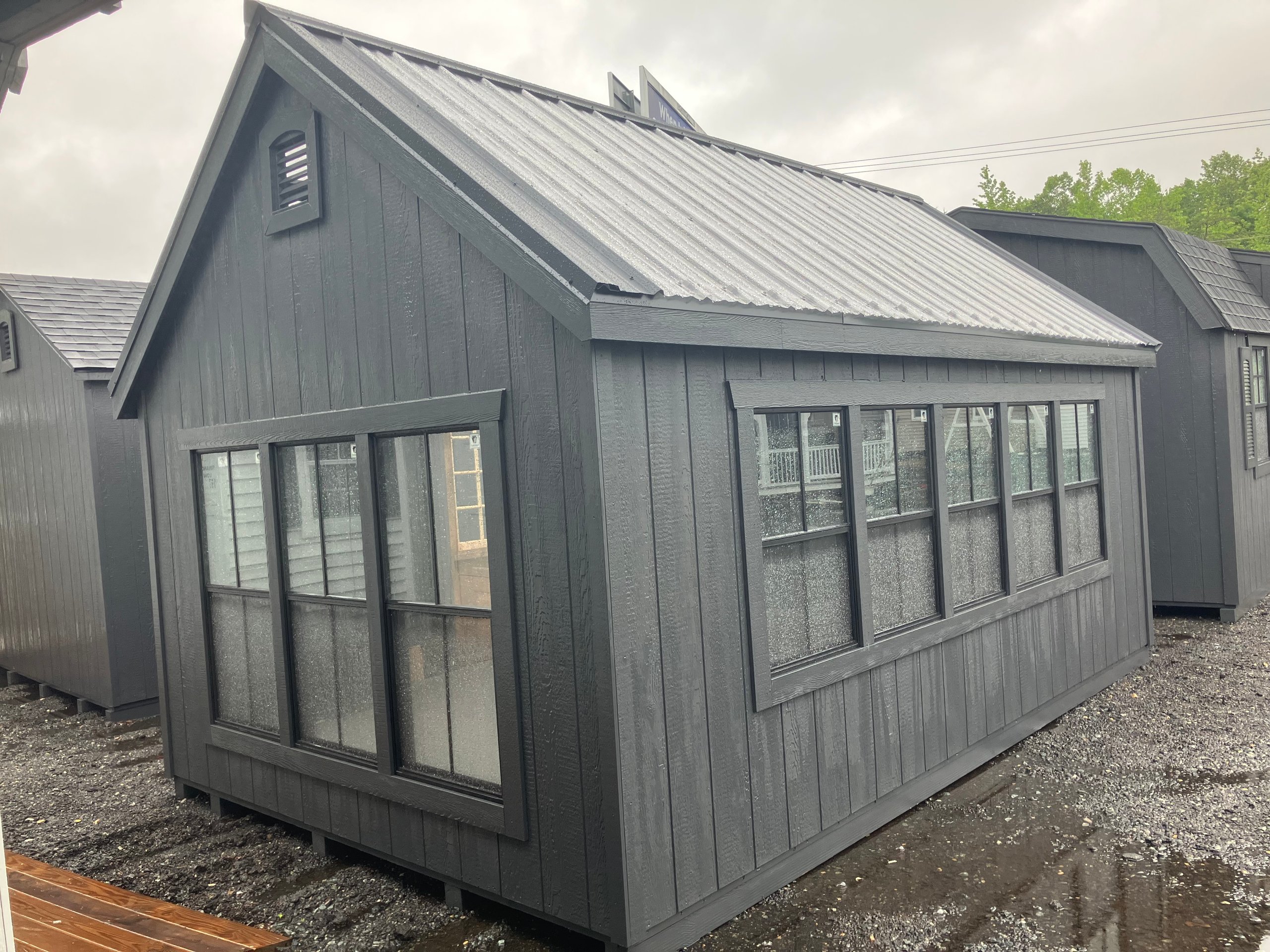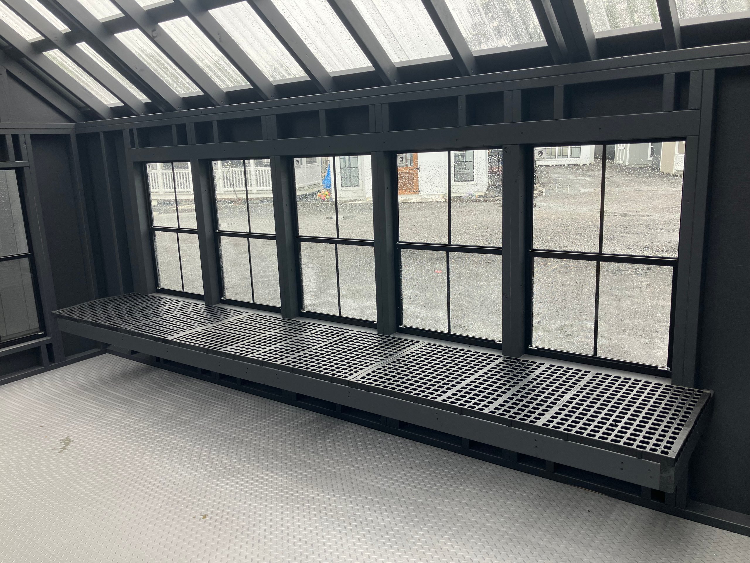 Style Name: Victorian A-Frame Size: 10×16 Siding: LP Smart Panel Main Color: Mopboard Black Trim Color: Mopboard Black Roof Color: Clear and Black Roofing: Metal Roof Roofing Underlayment: 2×4 Perlins for Metal Roof Number of Windows: 13 Number of Doors: 1 Wall Framing:  2×4 studs 16 inches on center Roof Framing: 2×4 rafters 16 inches on center Flooring:  LP Prostruct Flooring Floor Joists: Pressure Treated 2×4 joists 16 inches on center Included Upgrades: Pine Door with 28×41 Windows Black Windows Eight 24×48 Windows Bump-out Peak Dormer Interior Painting Lux Guard Flooring Greenhouse Workbench Metal Roof with Clear Roof Upgrade