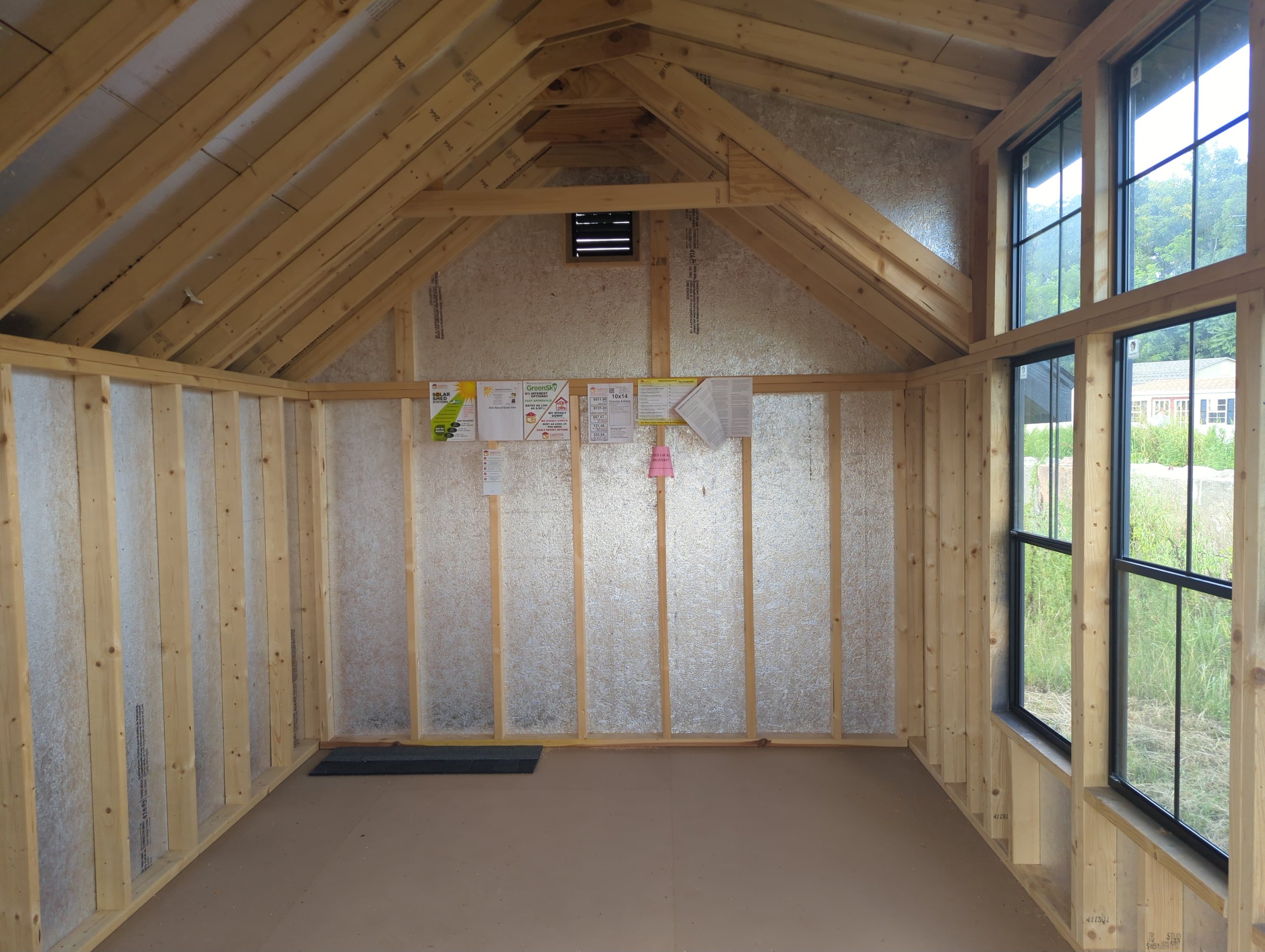 Upgrade your backyard with this Amish-built 10×14 Colonial A-Frame storage shed, designed for beauty, durability, and functionality. Featuring LP Smart Panel siding in classic Mopboard with matching trim, a black dimensional shingle roof, and premium LP ProStruct flooring, this shed is built to last. Six black-frame windows, a charming wall dormer, and elegant transom double doors enhance both style and natural light. Sturdy 2×4 construction 16″ on center, LP Tech Shield roof sheathing, and pressure-treated floor joists ensure superior strength. Perfect for use as a garden shed, workshop, or storage building, this timeless design combines curb appeal with exceptional craftsmanship.