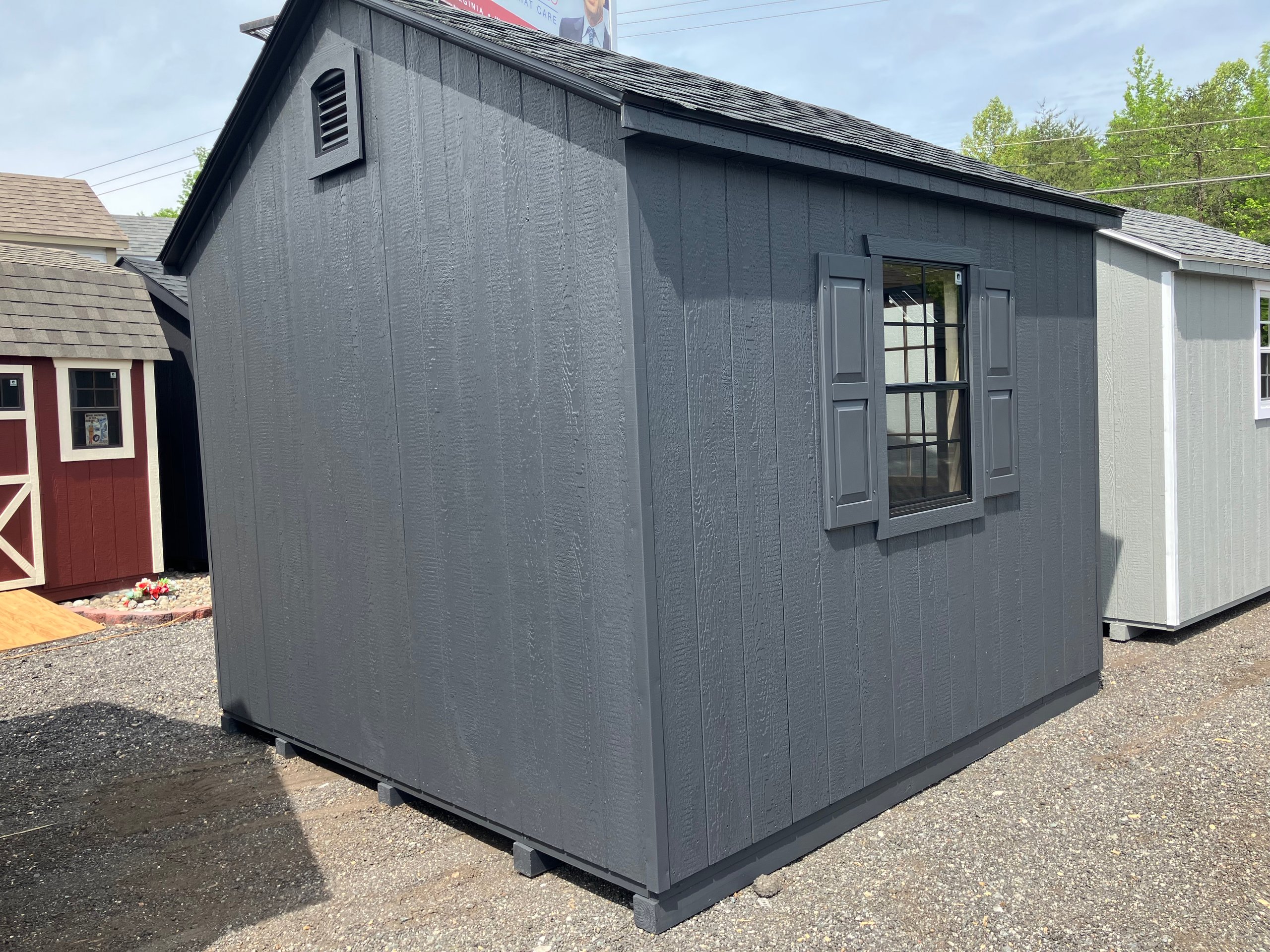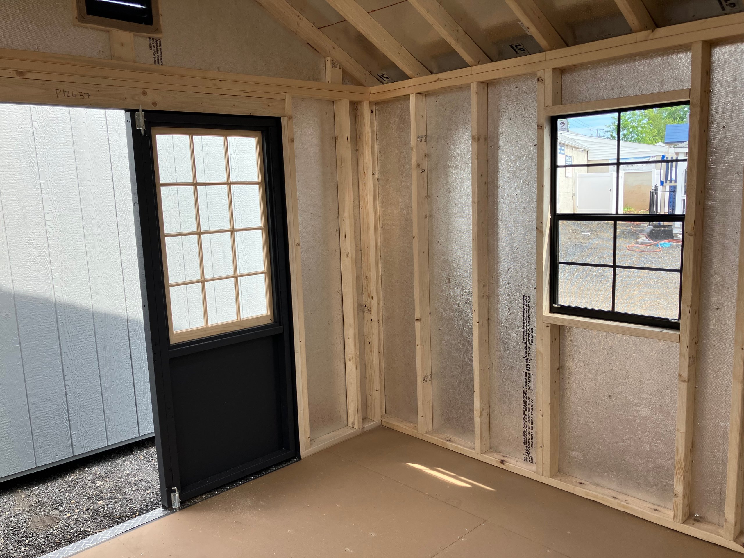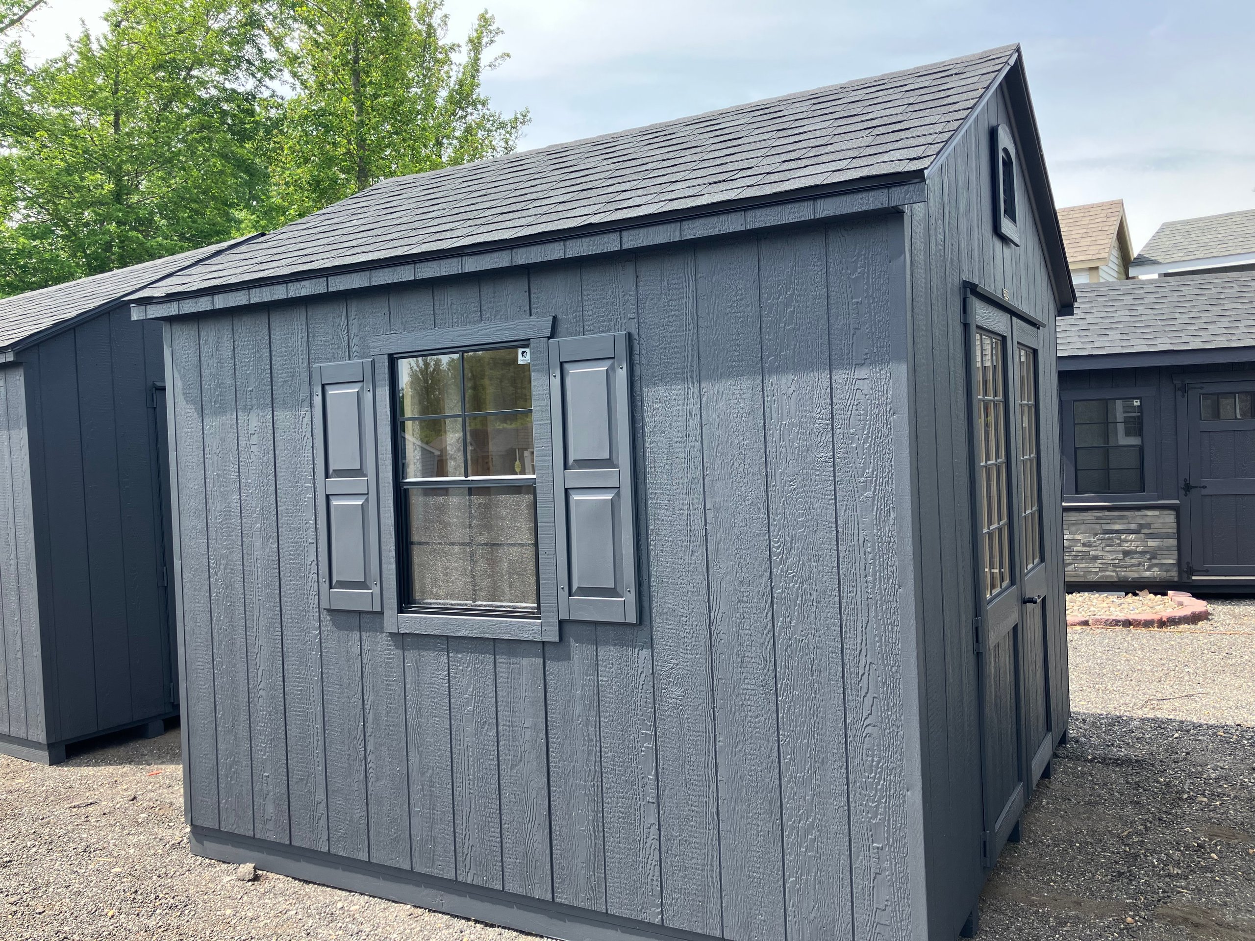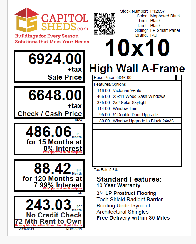 Crafted for durability and style, this Amish-built A-Frame shed is both functional and elegant. Its 10×10 structure features Mopboard Black LP Smart Panel siding, black trim, and a sleek black roof with architectural shingles and roof felt underlayment. Inside, sturdy 2×4 wall and roof framing ensure long-lasting support, complemented by LP Tech Shield sheeting and LP Prostruct flooring. Enjoy upgraded touches like Victorian vents, a solar skylight, and a 5′ double door for easy access. Two wood sash windows with black trim complete the modern yet timeless look. Perfect for secure, stylish storage that lasts.