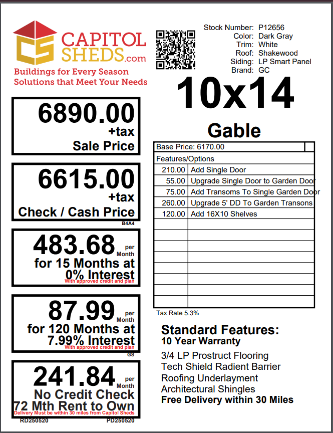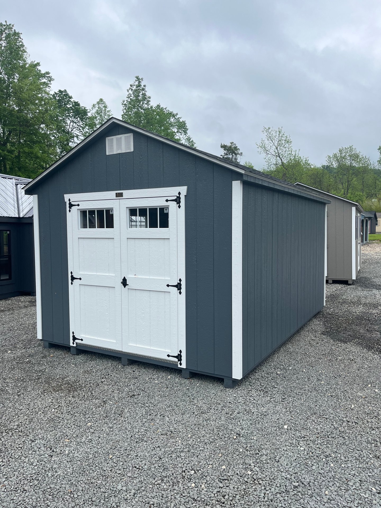 Crafted with Dark Gray LP Smart Panel siding and clean White trim, this 10×14 Gable shed blends utility and elevated design. Featuring two upgraded 5′ garden-style double doors with transoms and a transom-enhanced single garden door, it allows light to pour in while providing versatile access. Two windows and dual 16″x10′ shelves add to its functionality. The Shake-Wood roof offers a warm contrast and houses durable 3/4″ LP ProStruct flooring beneath. Whether used as a workshop, garden station, or storage hub, this shed offers refined looks and thoughtful upgrades that bring both form and function to your space.