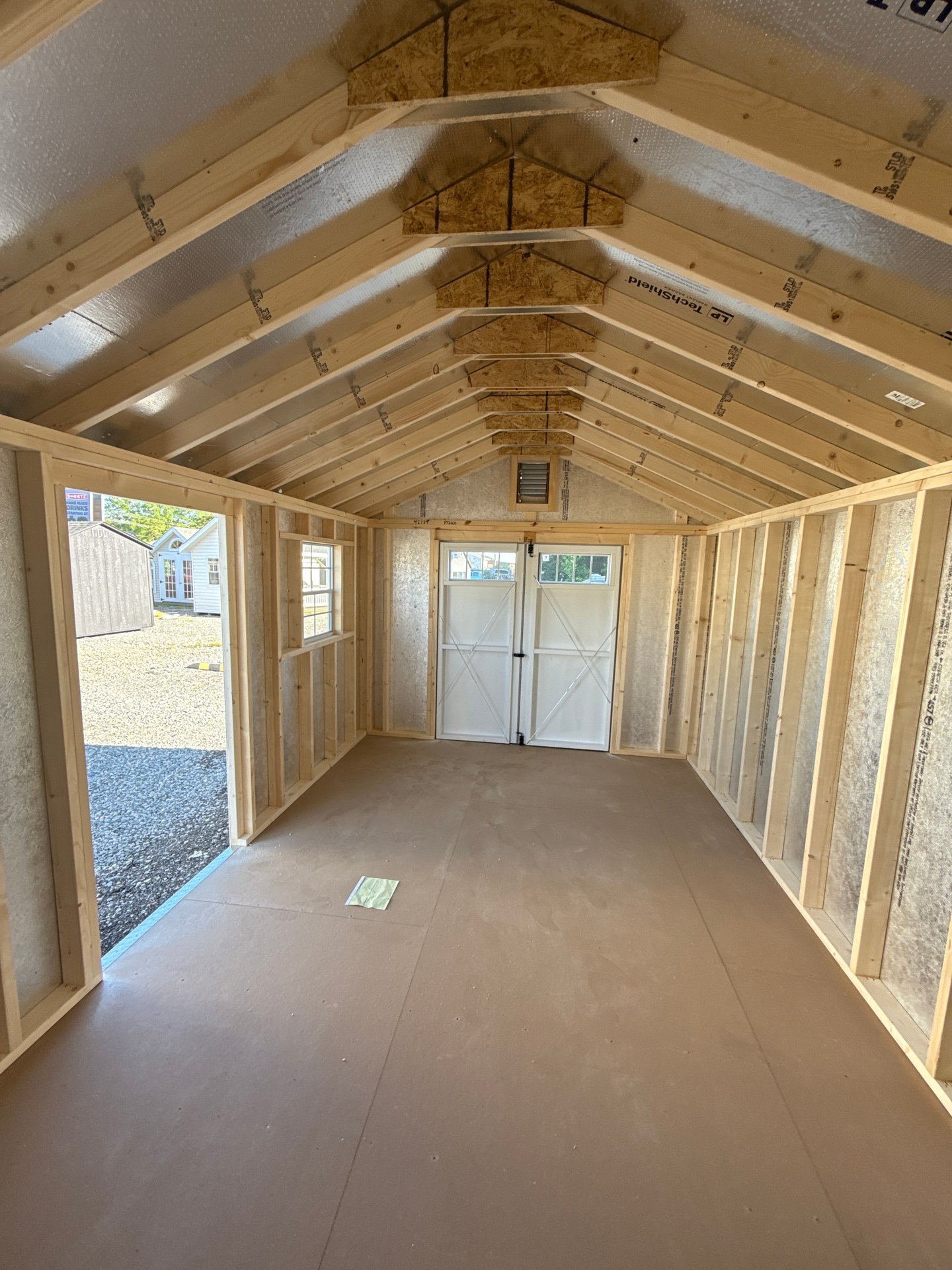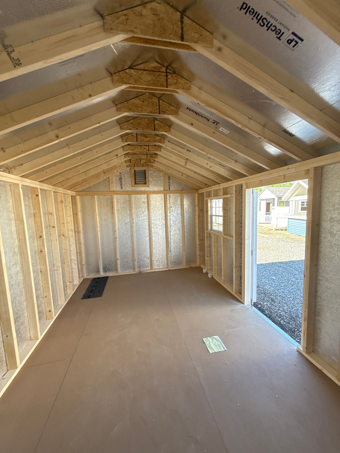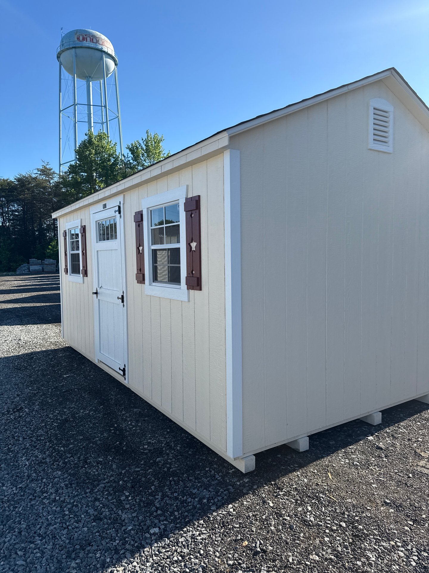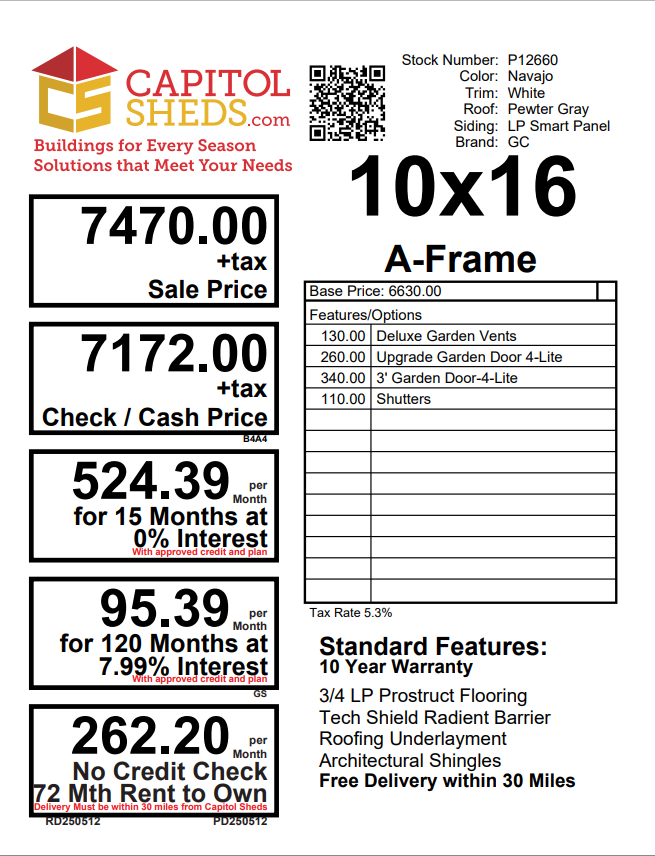 This 10×16 A-Frame shed is designed for those who value both function and curb appeal. Featuring Navajo LP SmartPanel siding, bright white trim, and a Pewter Gray architectural shingle roof, it offers a clean, polished look. The upgraded garden doors with charming 4-lite windows enhance the shed’s exterior while allowing natural light inside. Two windows with shutters and deluxe garden vents ensure proper airflow and visual interest. Built with 2×4 framing, LP Tech Shield roof sheeting, LP Prostruct flooring, and pressure-treated joists, this shed delivers durability and storage space you can rely on year-round.