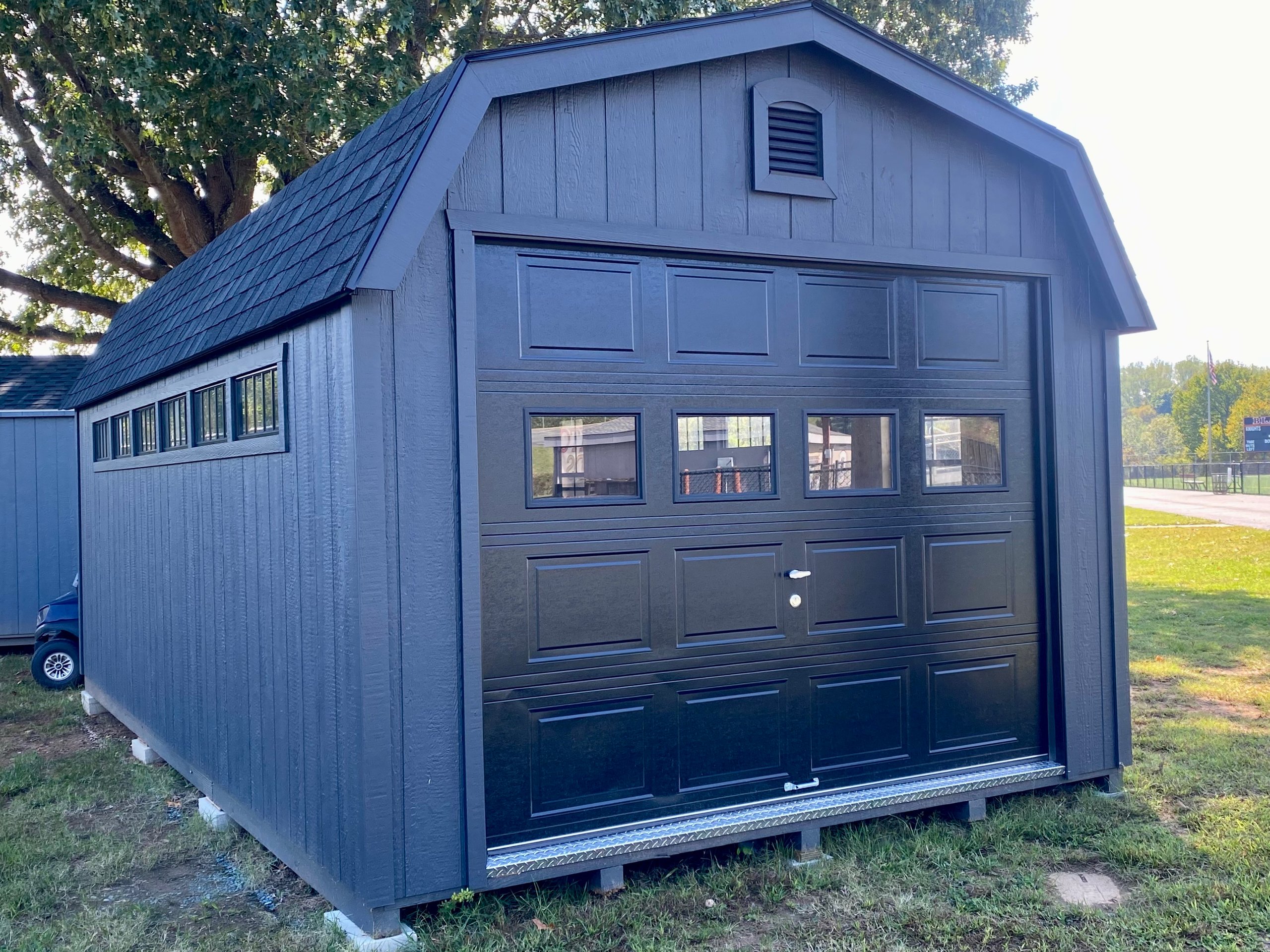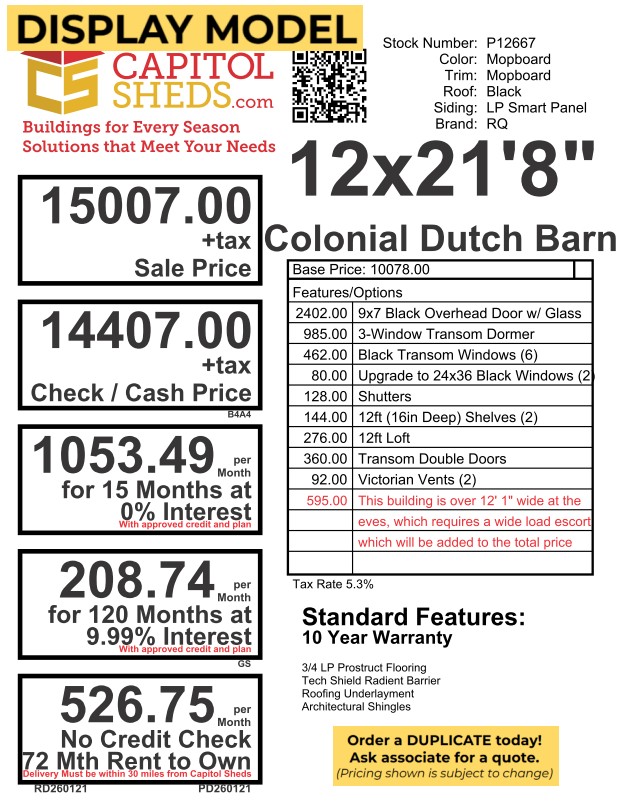 This 12×21’8″ Colonial Dutch Barn Garage offers classic style with serious functionality. Finished in LP Smart Panel siding with Mopboard color-matched trim, it features a bold black architectural shingle roof with LP Tech Shield sheeting for added durability and efficiency. Built with 2Ă—4 wall studs and rafters spaced 16 inches on center, plus pressure-treated 2Ă—4 floor joists 8 inches on center, this structure is designed for strength. Upgrades include a 9×7 black overhead door with glass, transom doors, a 12ft loft, 12ft deep shelving, black windows, a transom dormer, and Victorian vents—perfect for storage, parking, or workspace use.