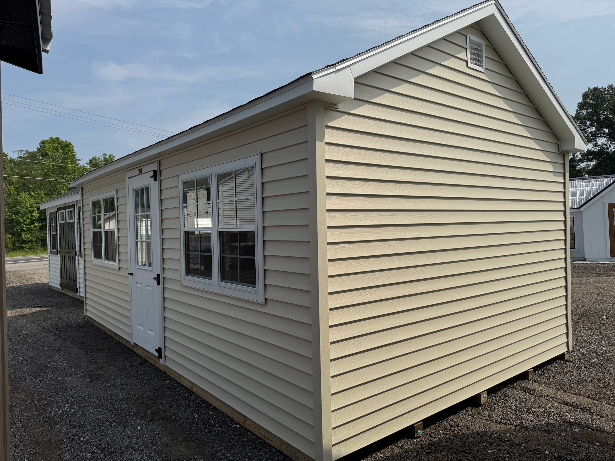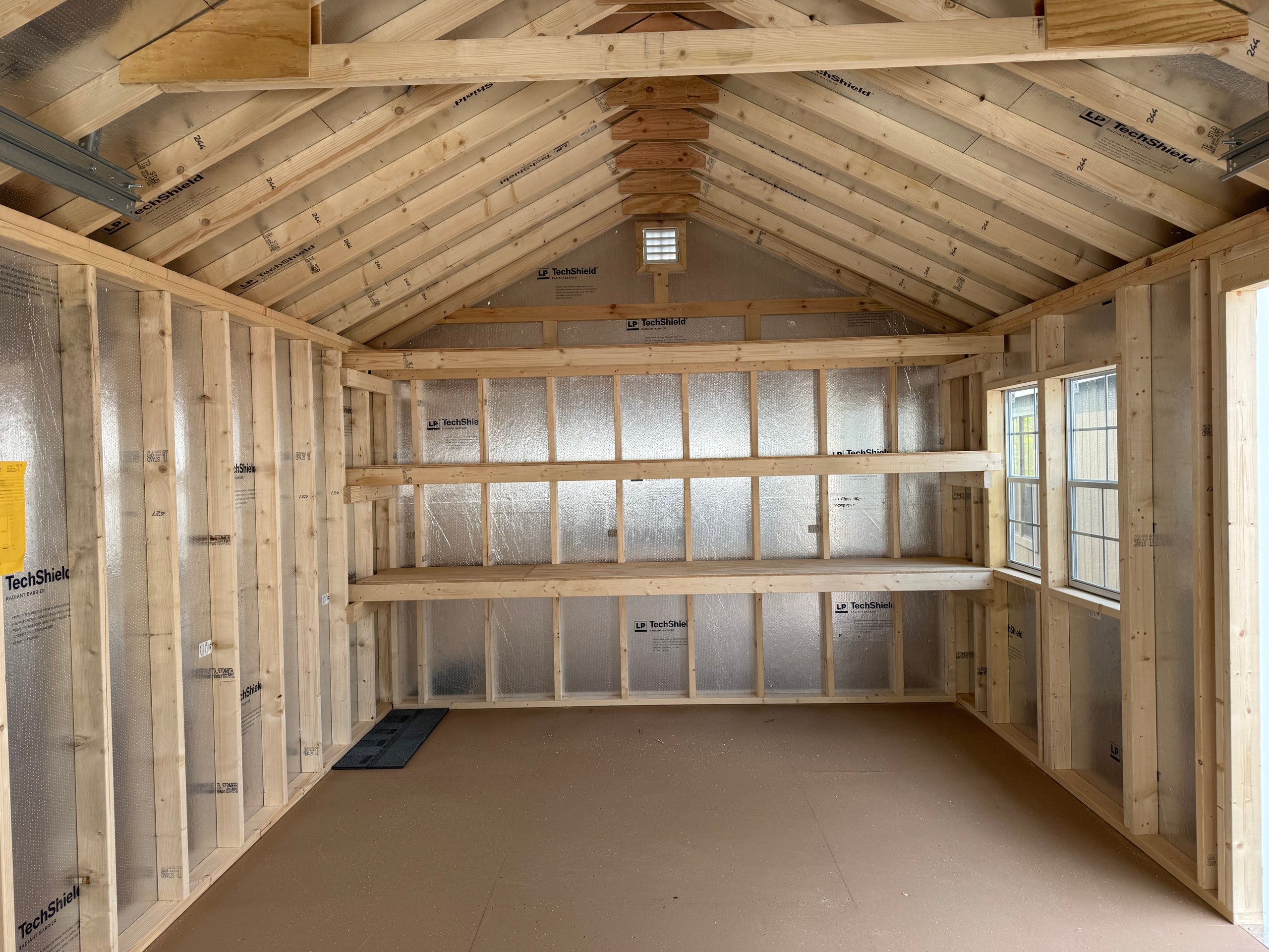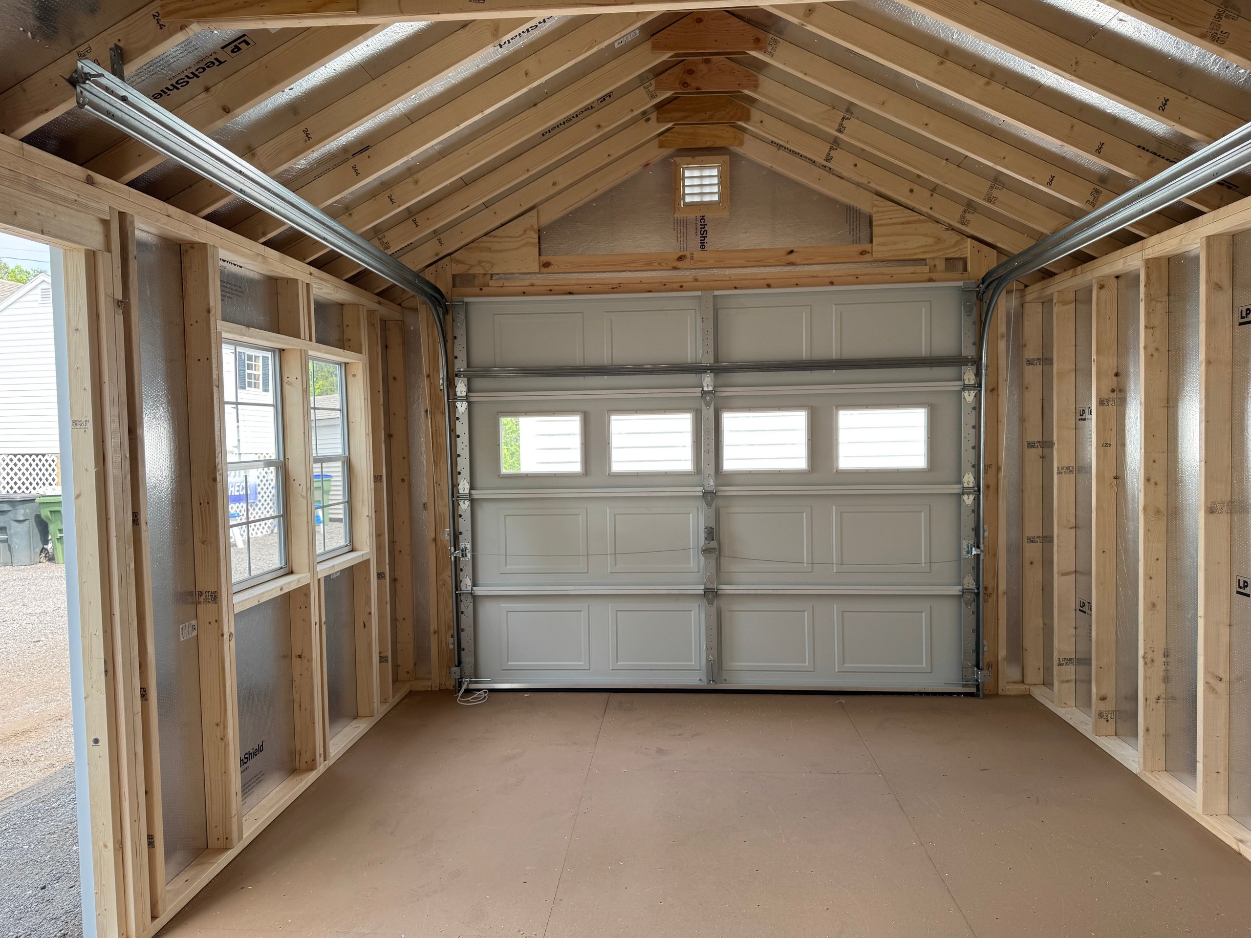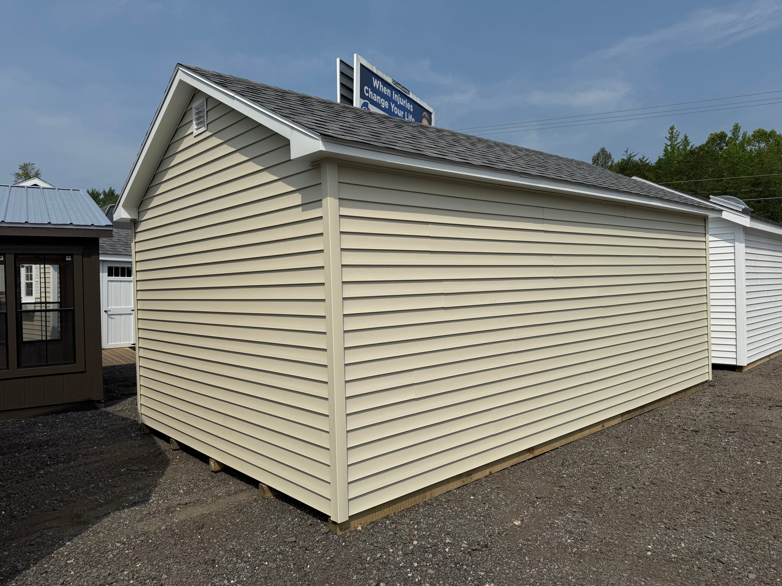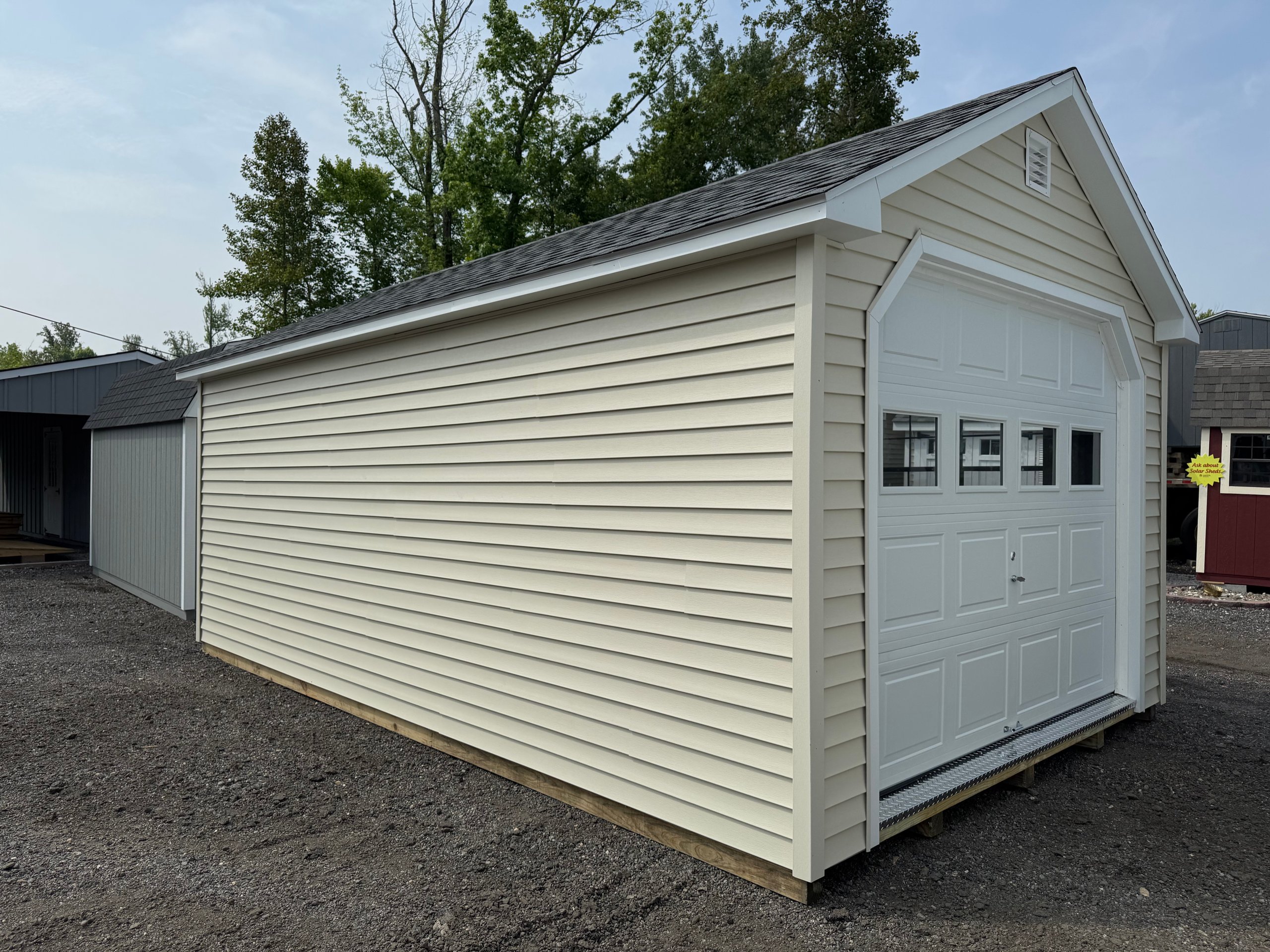 This 12×20 A-frame delivers clean garage functionality with polished curb appeal. Finished in Almond Vinyl Traditional siding, White trim, and Virginia Slate shingles, it features four windows—two standard upgraded and two added 24×36 units—for excellent natural light. Default double doors were removed, leaving two entry points: a full 9×7 garage door with glass and a 3′ fiberglass door with 9-lite insert. Inside, three tiers of built-in shelving provide ready storage. Built with 2×4 framing 16″ on center, Tech Shield roof sheathing, and Prostruct flooring, this structure offers practical access, storage, and workspace versatility.