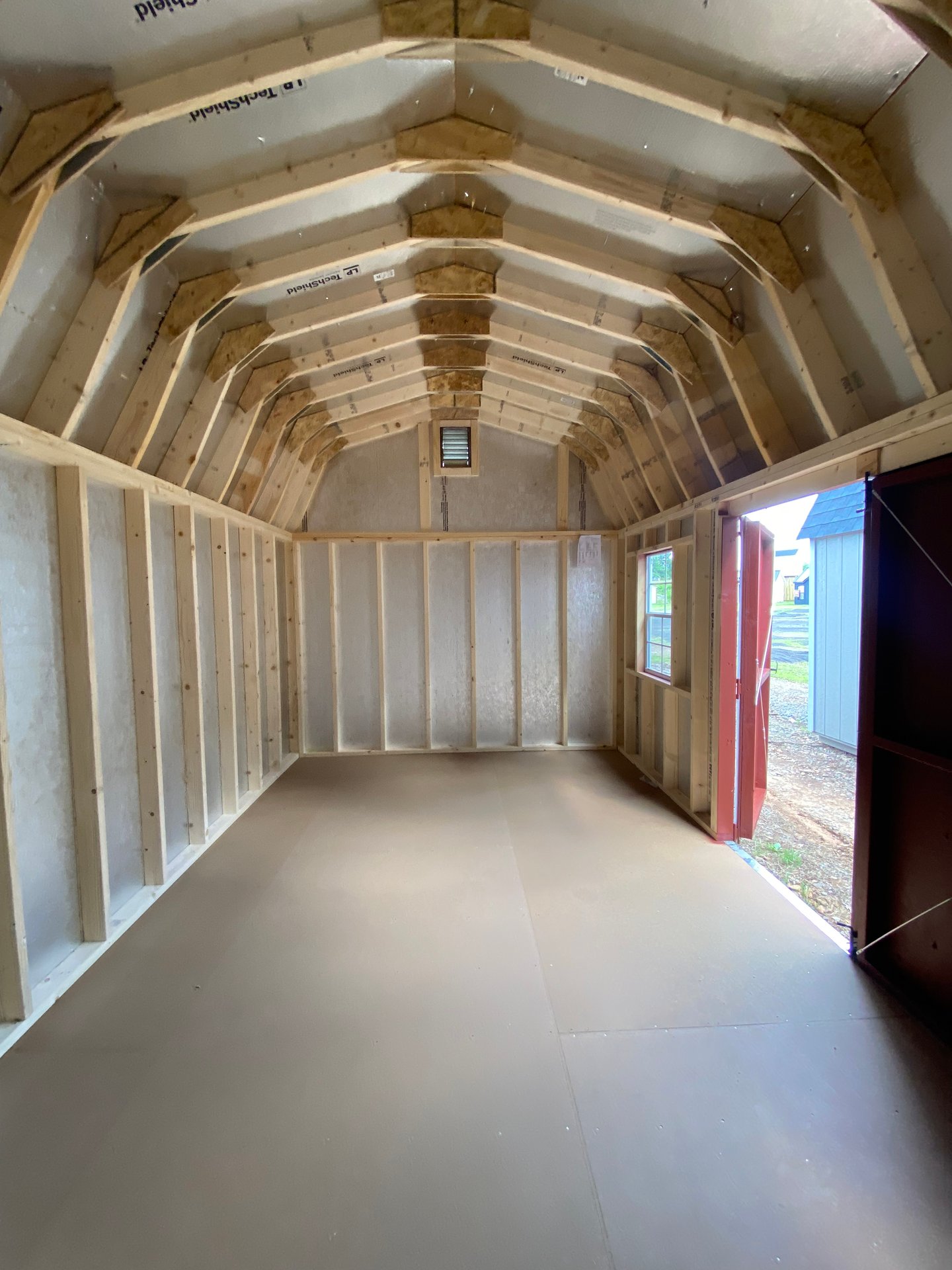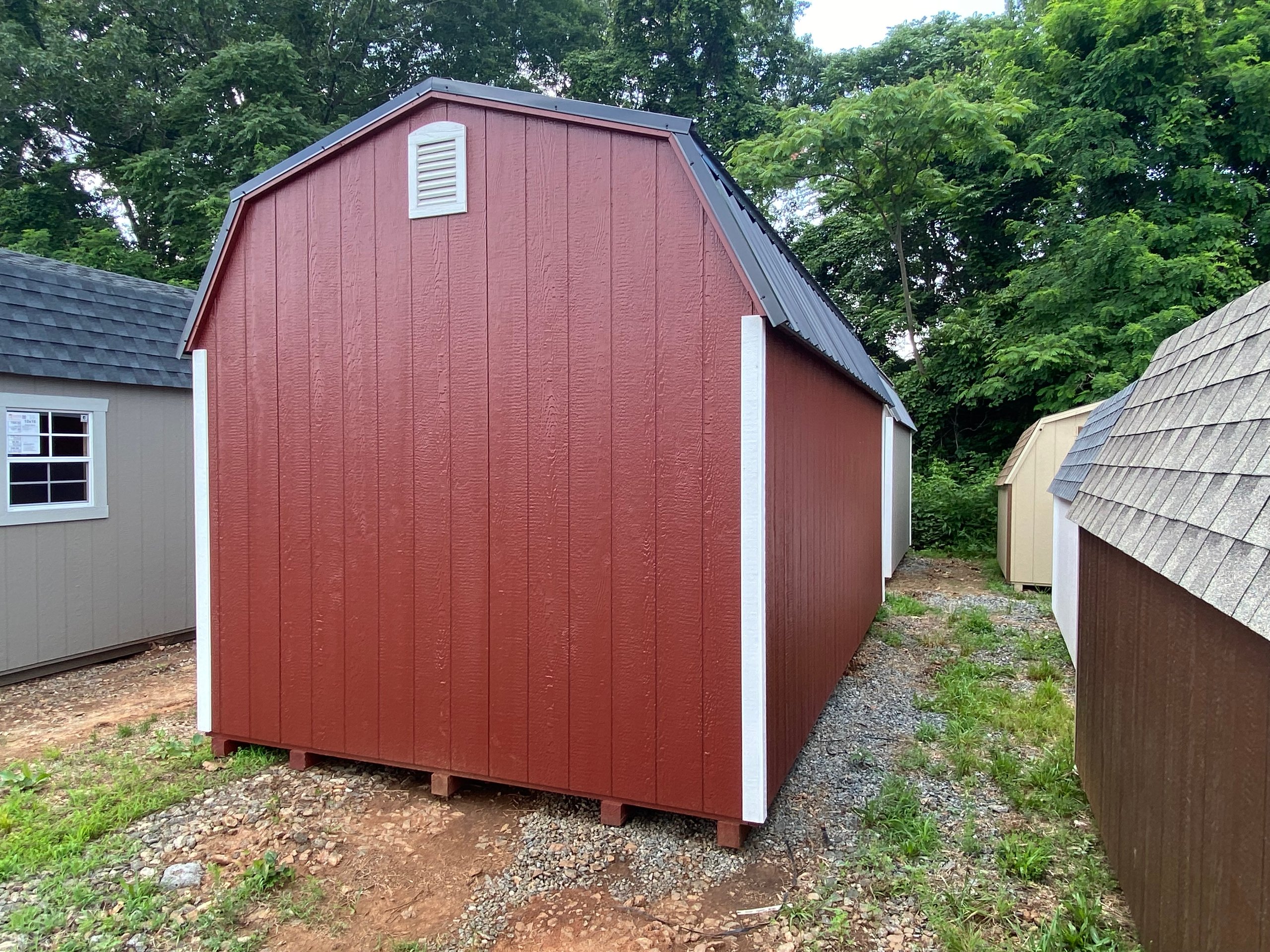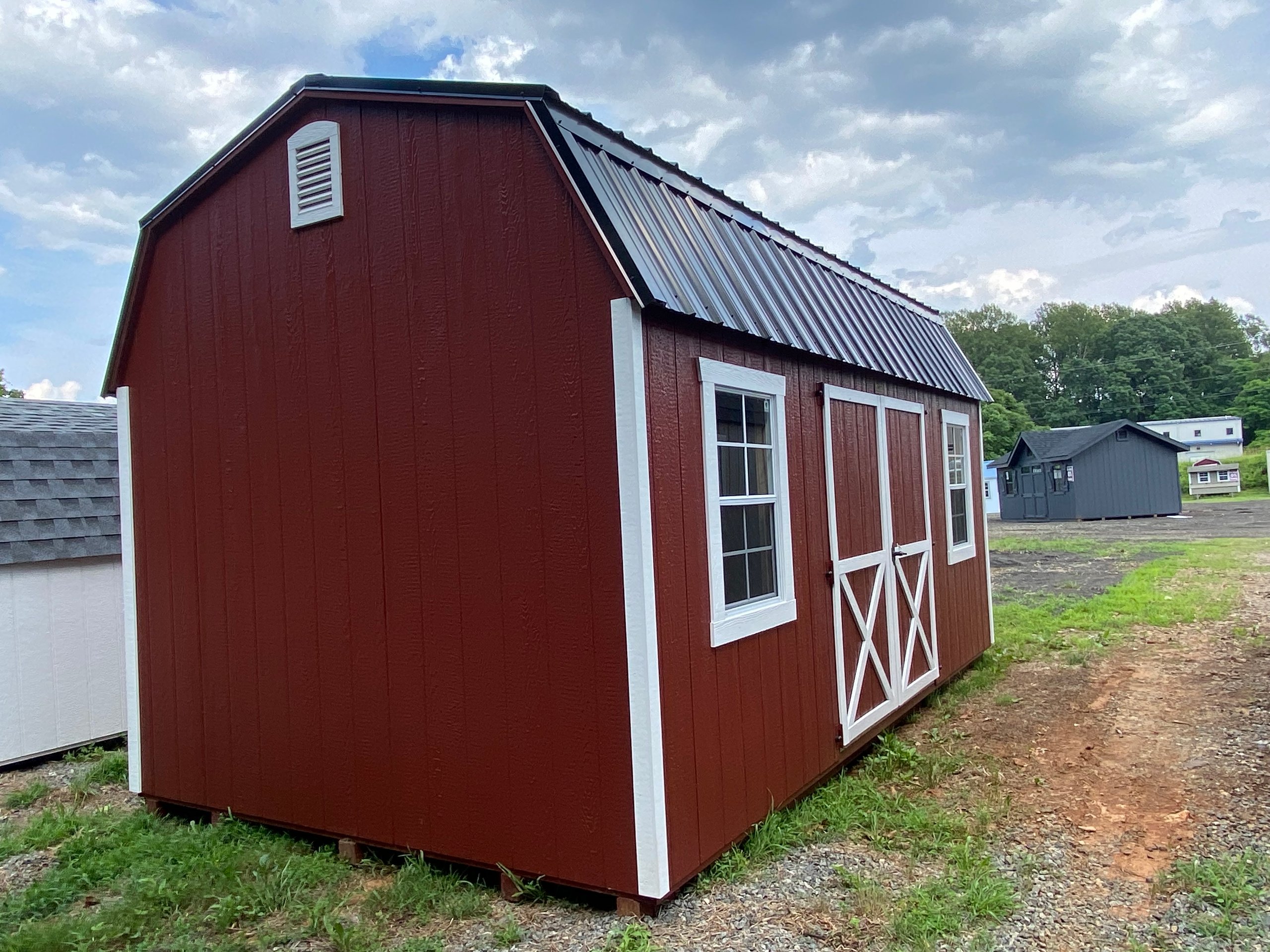 Style Name: Dutch Barn Size: 10×18 Siding: LP Smart Panel Main Color: Red Trim Color: White Roof Color: Black Roofing: Metal Roofing Underlayment: Roof Felt Paper Number of Windows: 2 Number of Doors: 2 Wall Framing: 2×4 studs 16 inches on center Roof Framing: 2×4 rafters 16 inches on center Roof Sheeting: LP Tech Shield Flooring: LP T&G Prostruct Flooring Floor Joists: Pressure Treated 2×4 joists 12 inches on center   Included Upgrades: