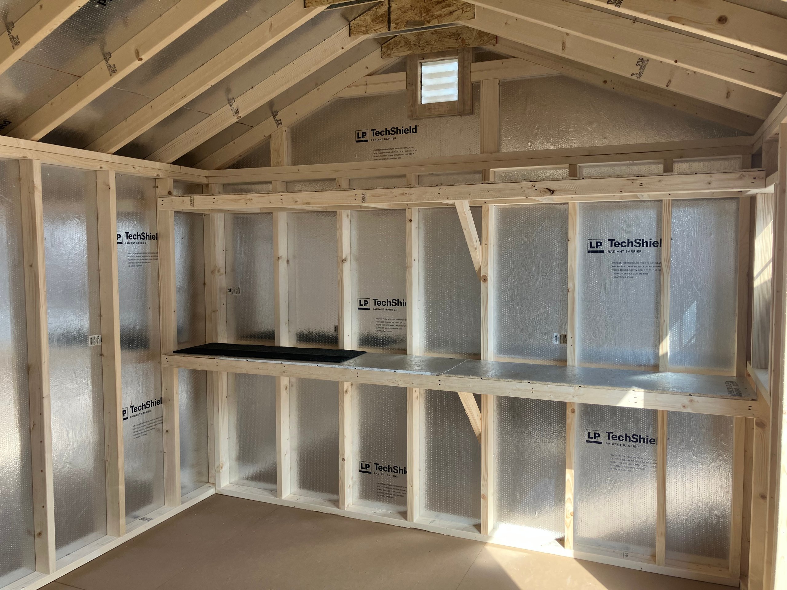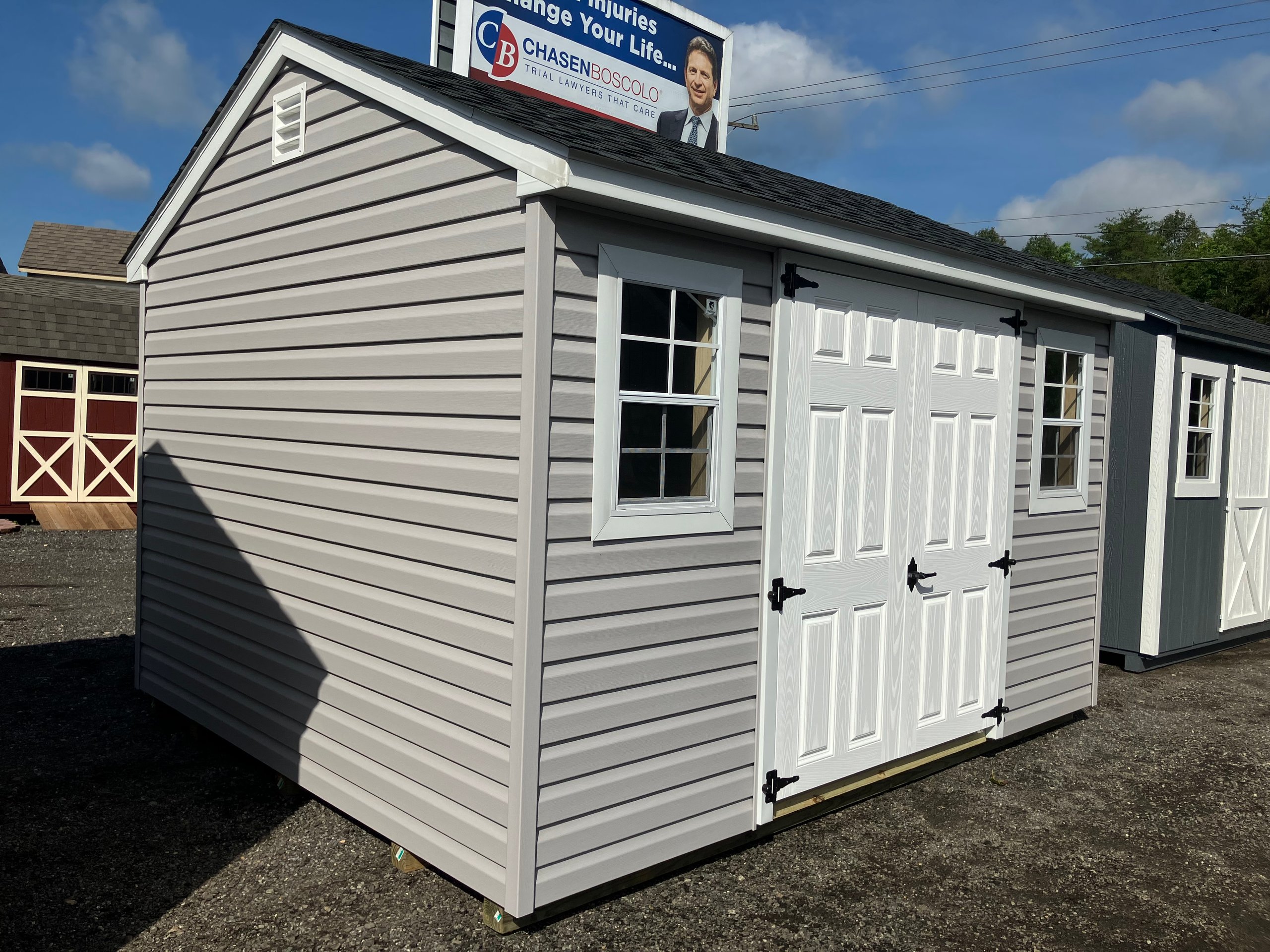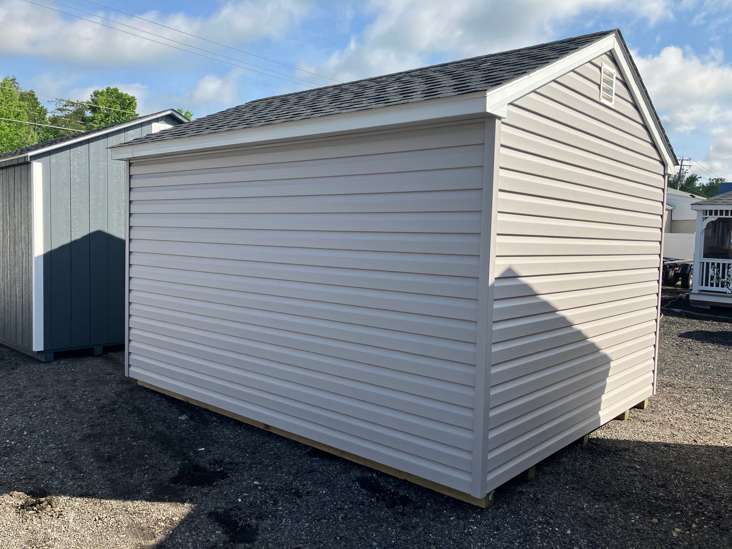 This 10×12 A-frame stands out with Pewter Vinyl Dutch Lap siding, White trim, and a Charcoal architectural shingle roof. It includes two windows and standard double doors for natural light and easy entry. Inside, two full-length 16″×10′ shelves are mounted along the interior walls, offering built-in vertical storage ideal for bins, tools, or seasonal décor. Built with 2×4 studs spaced 16” on center, LP Tech Shield roof sheathing, and Prostruct flooring, this shed blends functionality and durability with a modern exterior finish.