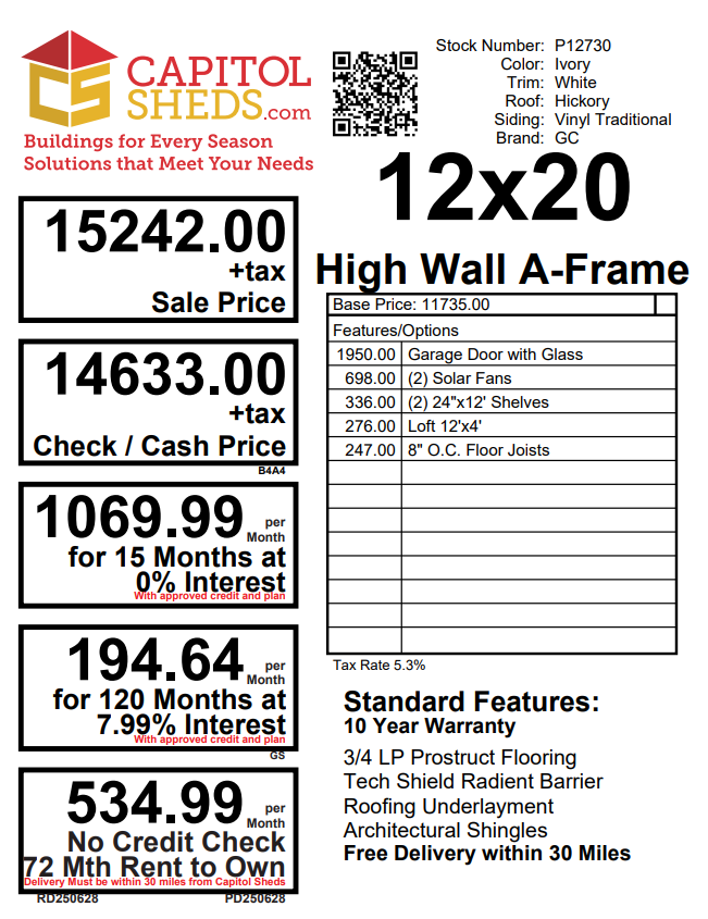 The 12×20 High Wall A-Frame shed is a spacious and durable solution for storage or workspace needs. Featuring ivory vinyl siding, white trim, and a hickory roof with architectural shingles, it combines modern aesthetics with long-lasting reliability. Upgrades include a garage door with glass for added style and accessibility, two solar fans for ventilation, and a loft for extra storage. Inside, two 24″x12’ shelves and enhanced 8” on-center floor joists provide exceptional stability and organization. Built with 2×4 framing, LP Prostruct flooring, and LP Tech Shield roof sheeting, this shed is a premium choice for functionality and elegance.