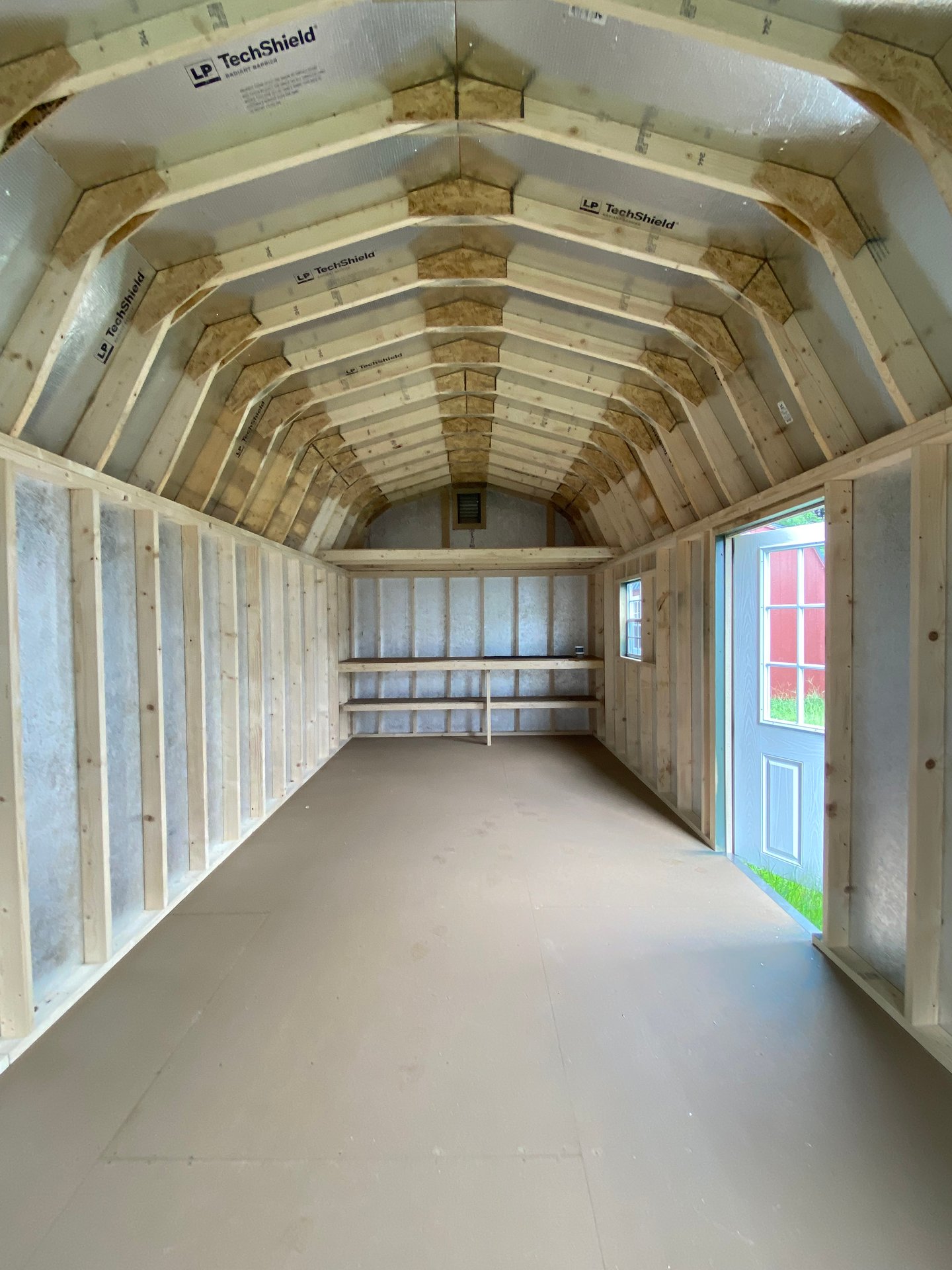 This 10×25 Dutch Barn combines timeless barn styling with practical upgrades for everyday use. Its exterior features durable LP SmartPanel siding in Avocado with Clay trim, topped by architectural shingles in Charcoal over roof felt paper for added protection. Built with 2×4 wall studs and rafters 16″ on center, LP Tech Shield roof sheeting, and LP T&G Prostruct flooring on pressure‑treated 2×4 joists 12″ on center, this barn is made to last. Three 9‑Lite fiberglass doors and two windows provide light and access, while the 4×10 loft, 10′ workbench, and garden vents create a functional, versatile interior space.