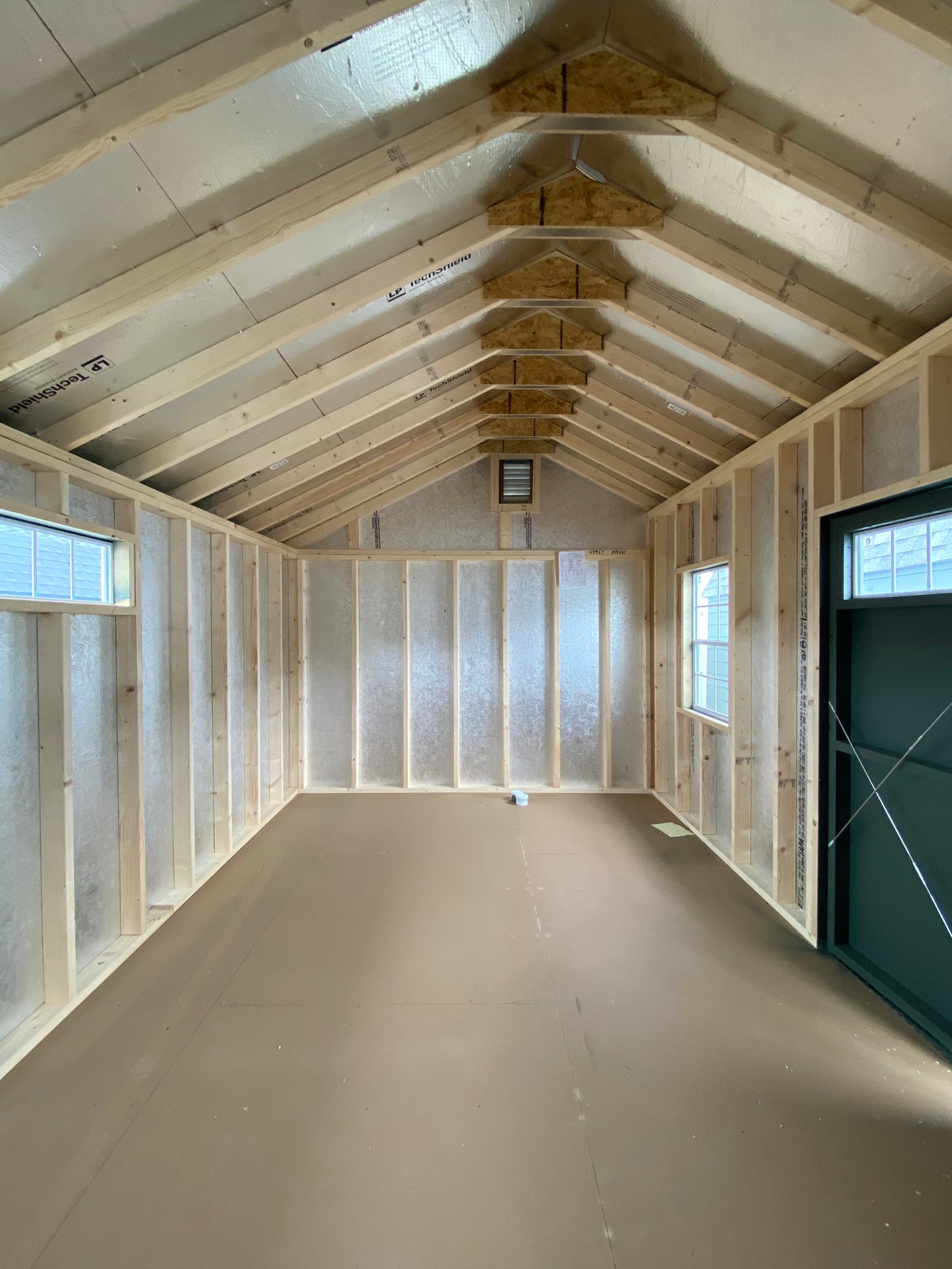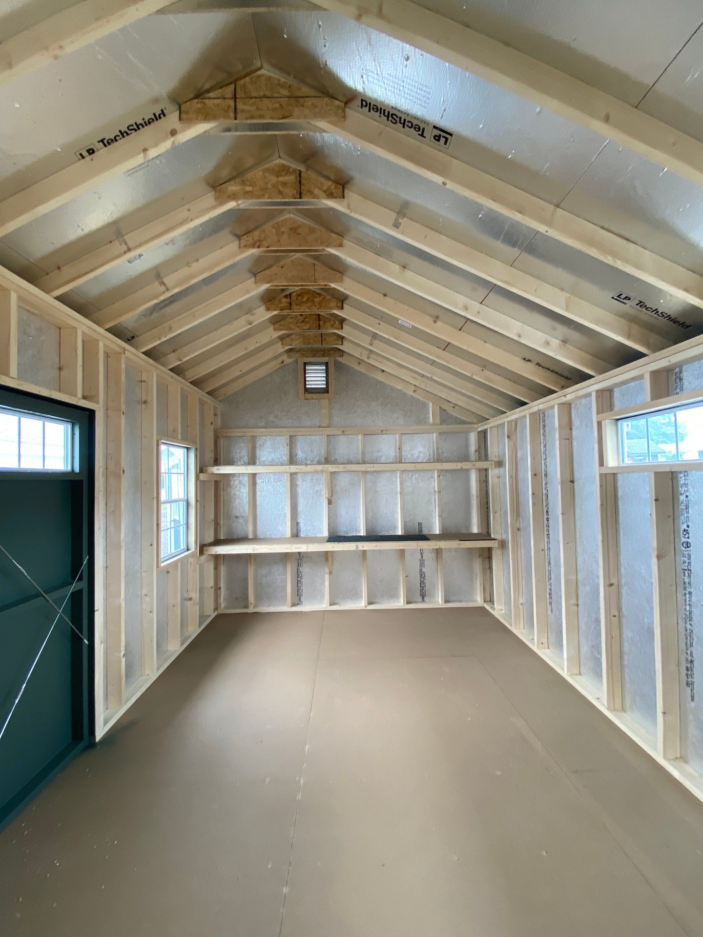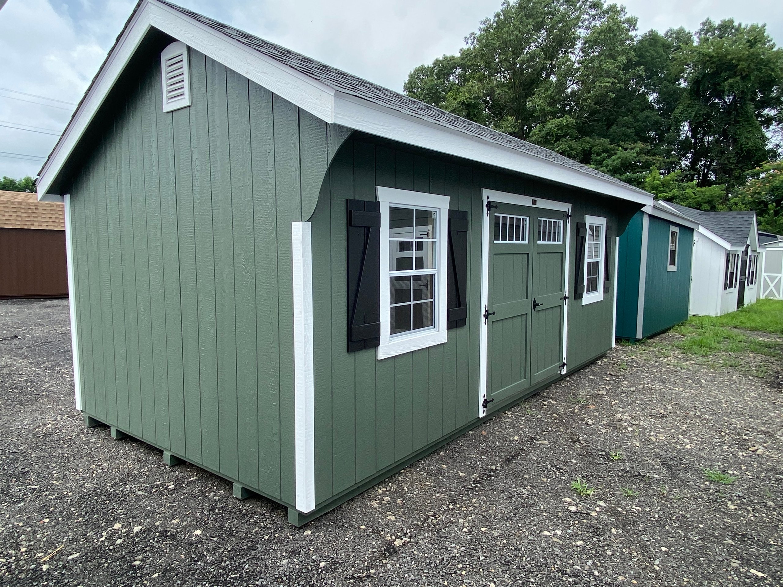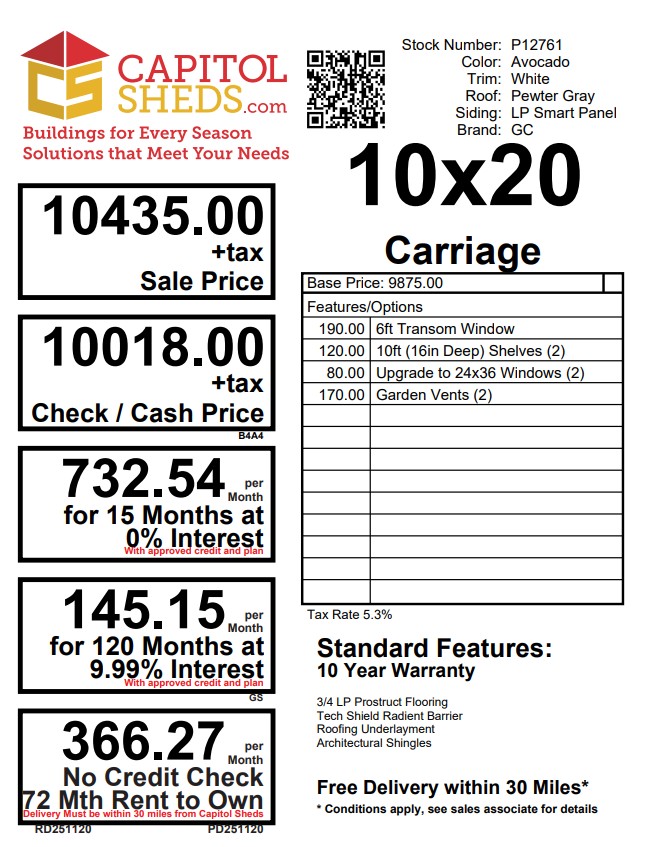This 10×20 Carriage shed delivers charm and functionality with a classic barn‑inspired design. Its LP Smart Panel siding is painted in a rich Avocado with crisp white trim, creating a striking contrast. Architectural shingles in Pewter, installed over roof felt paper, provide long‑lasting weather protection. Built with 2×4 wall studs and rafters 16″ on center, LP Tech Shield roof sheeting, and durable LP T&G Prostruct flooring on pressure‑treated 2×4 joists 12″ on center, it’s crafted to endure. Two windows, transom‑topped double doors, integrated 16″x10′ shelves, and garden vents make this shed both practical and stylish, perfect for organized storage.