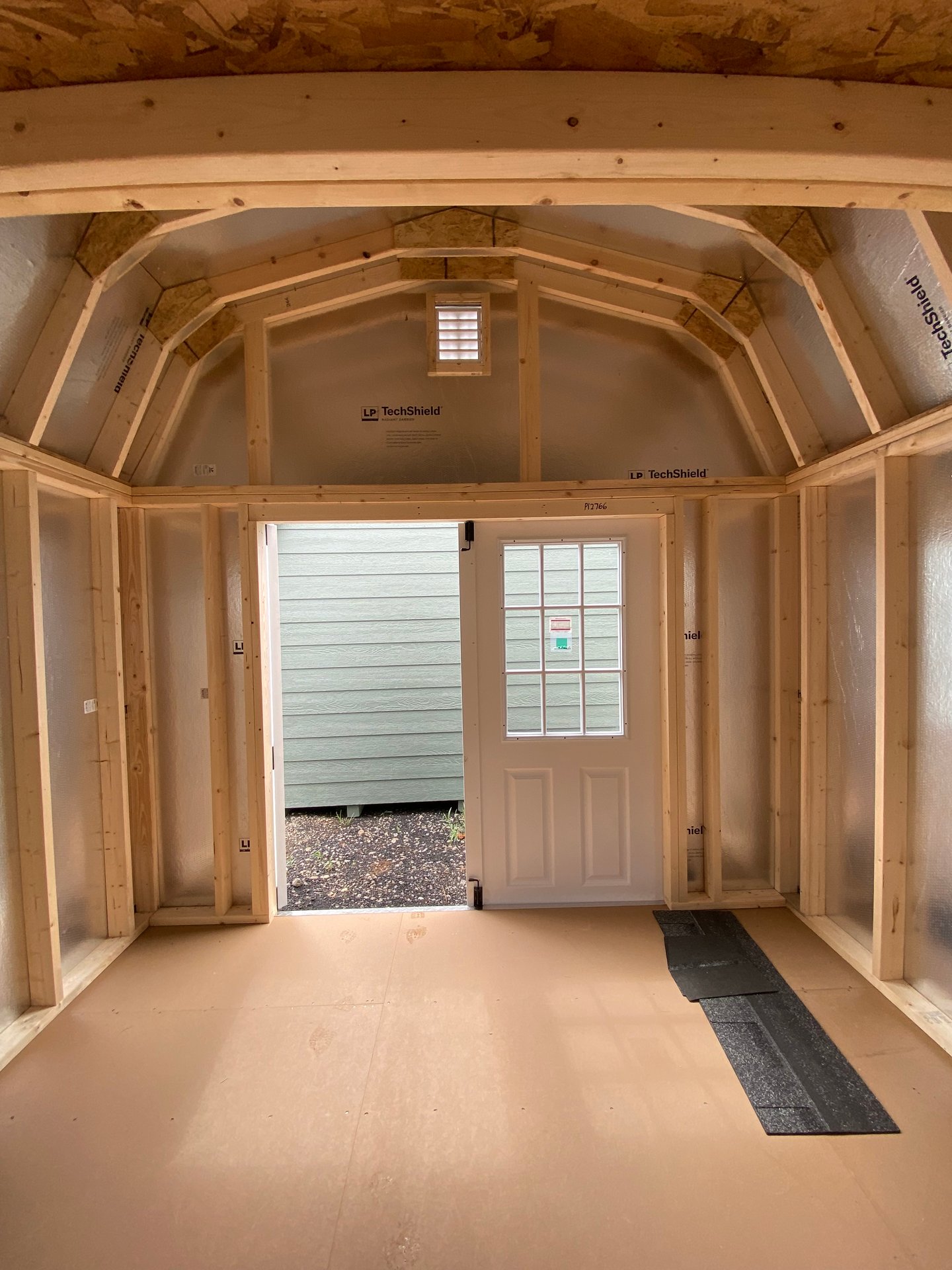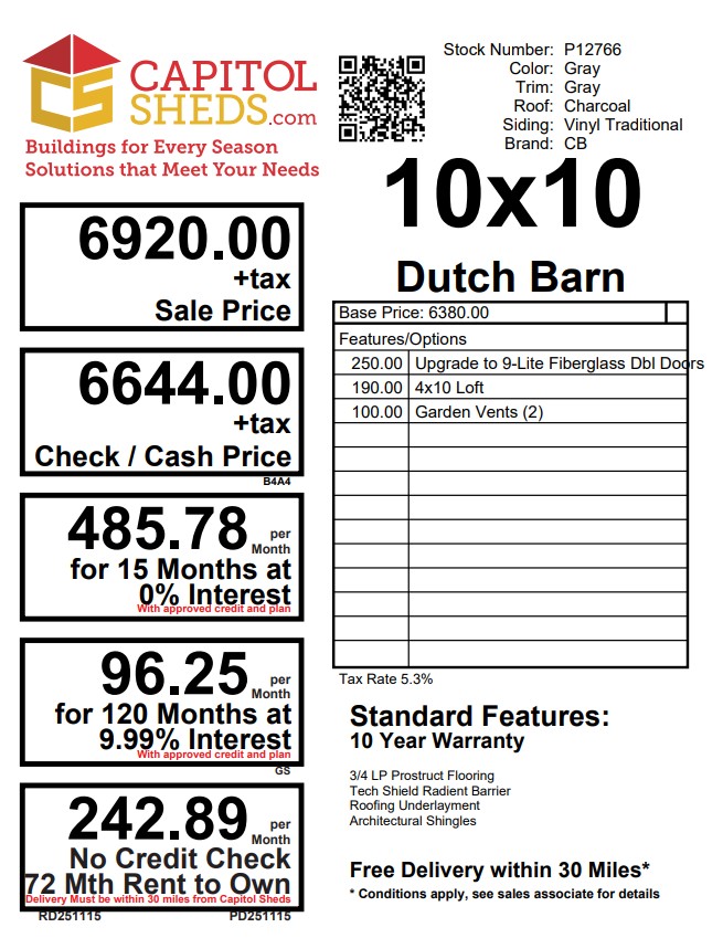 Style Name: Dutch Barn Size: 10×10 Siding: Traditional Vinyl Main Color: Gray Trim Color: Gray Roof Color: Charcoal Roofing: Architectural Shingles Roofing Underlayment: Roof Felt Paper Number of Windows: 2 Number of Doors: 2 Wall Framing: 2×4 studs 16 inches on center Roof Framing: 2×4 rafters 16 inches on center Roof Sheeting: LP Tech Shield Flooring: LP T&G Prostruct Flooring Floor Joists: Pressure Treated 2×4 joists 12 inches on center   Included Upgrades: