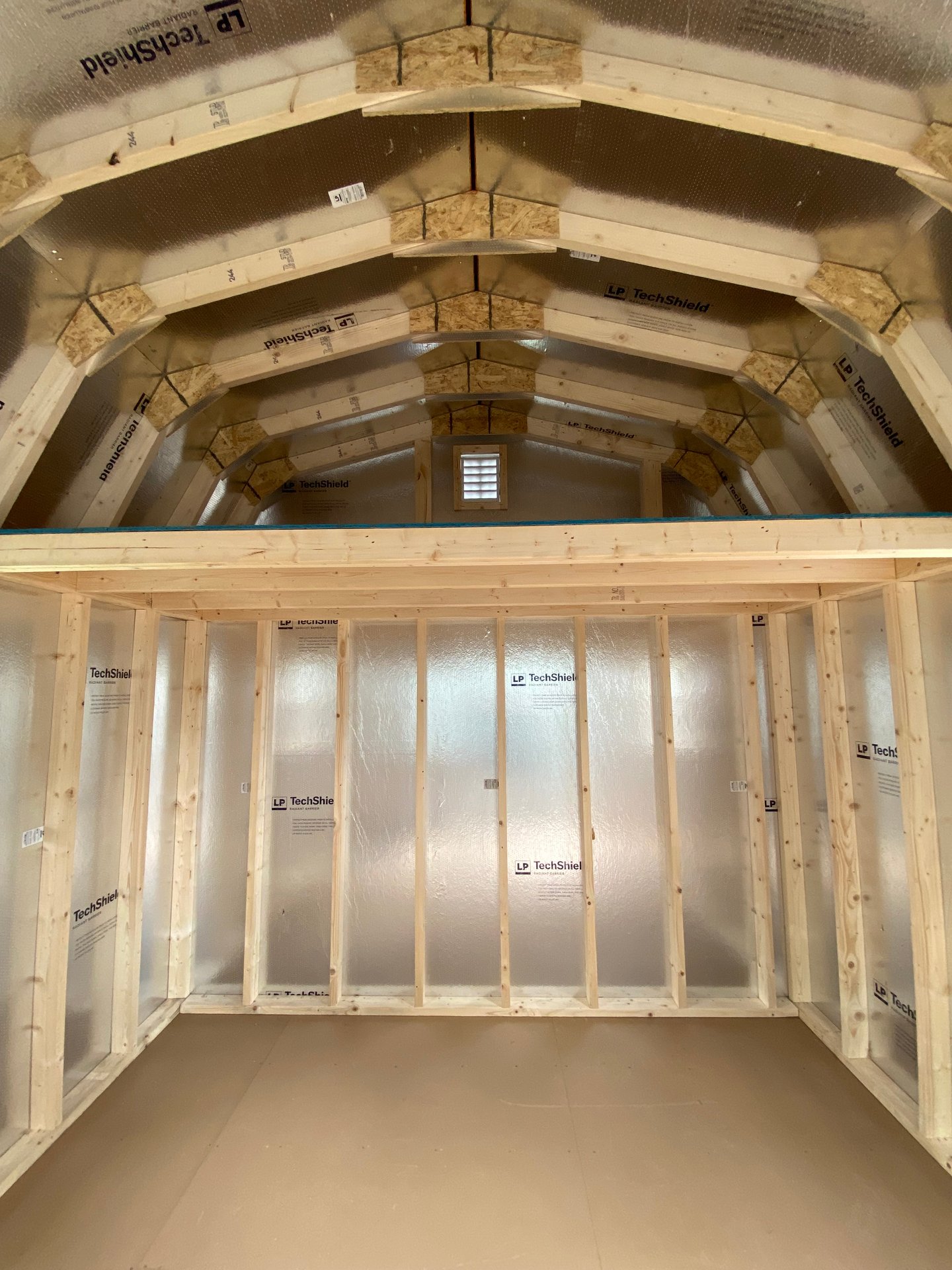 This 10×10 Dutch Barn combines classic styling with durable construction. Finished in low‑maintenance traditional gray vinyl siding with matching trim, it features a bold charcoal roof with architectural shingles over roof felt paper. Built with 2×4 wall studs and rafters 16″ on center, LP Tech Shield roof sheeting, and LP T&G Prostruct flooring on pressure‑treated 2×4 joists 12″ on center, this barn is made to last. Two windows provide natural light, while elegant 9‑lite fiberglass double doors offer a refined entry. Inside, a 4×10 loft expands your storage options, and garden vents improve airflow for a well‑designed, functional space.