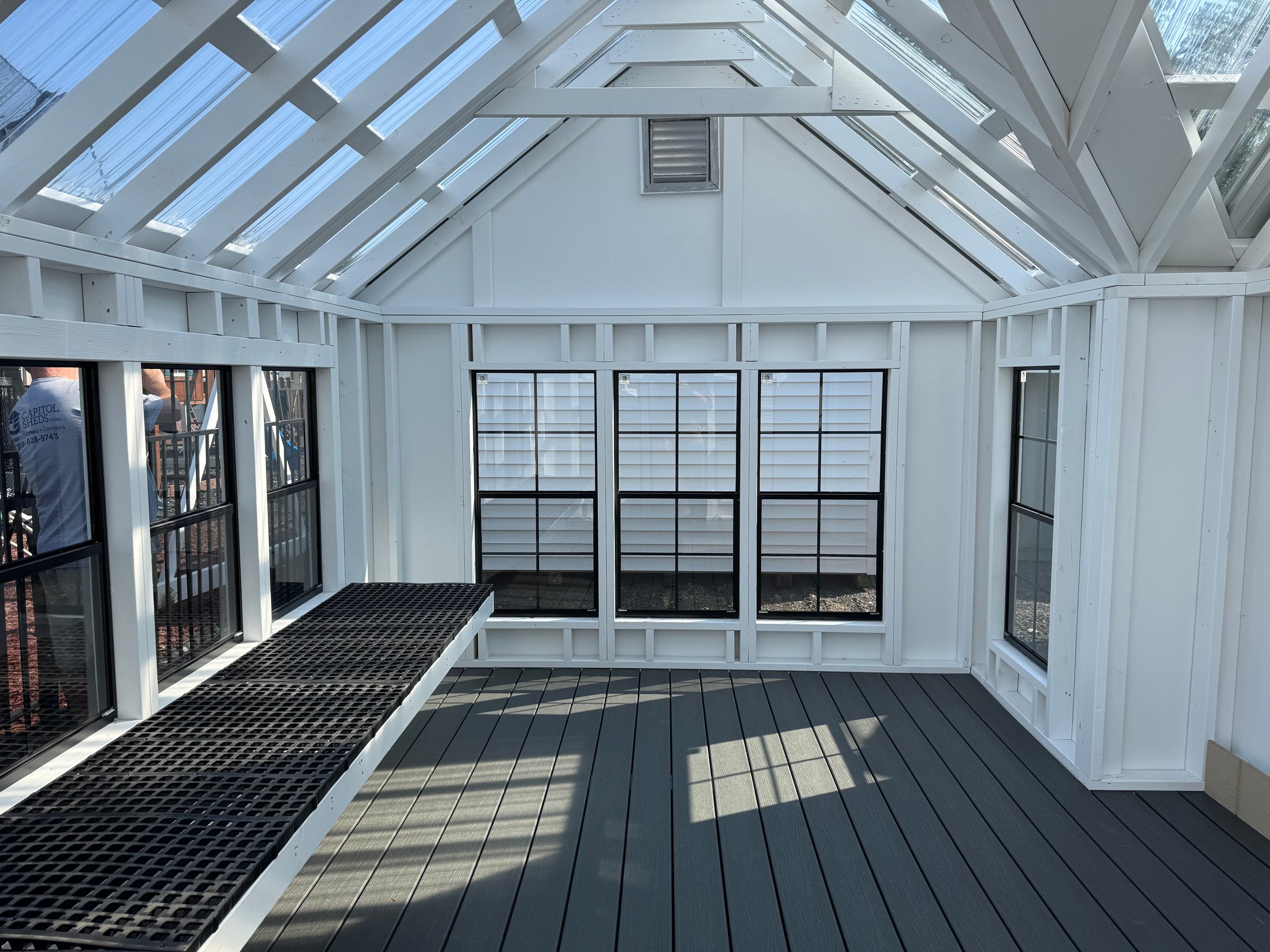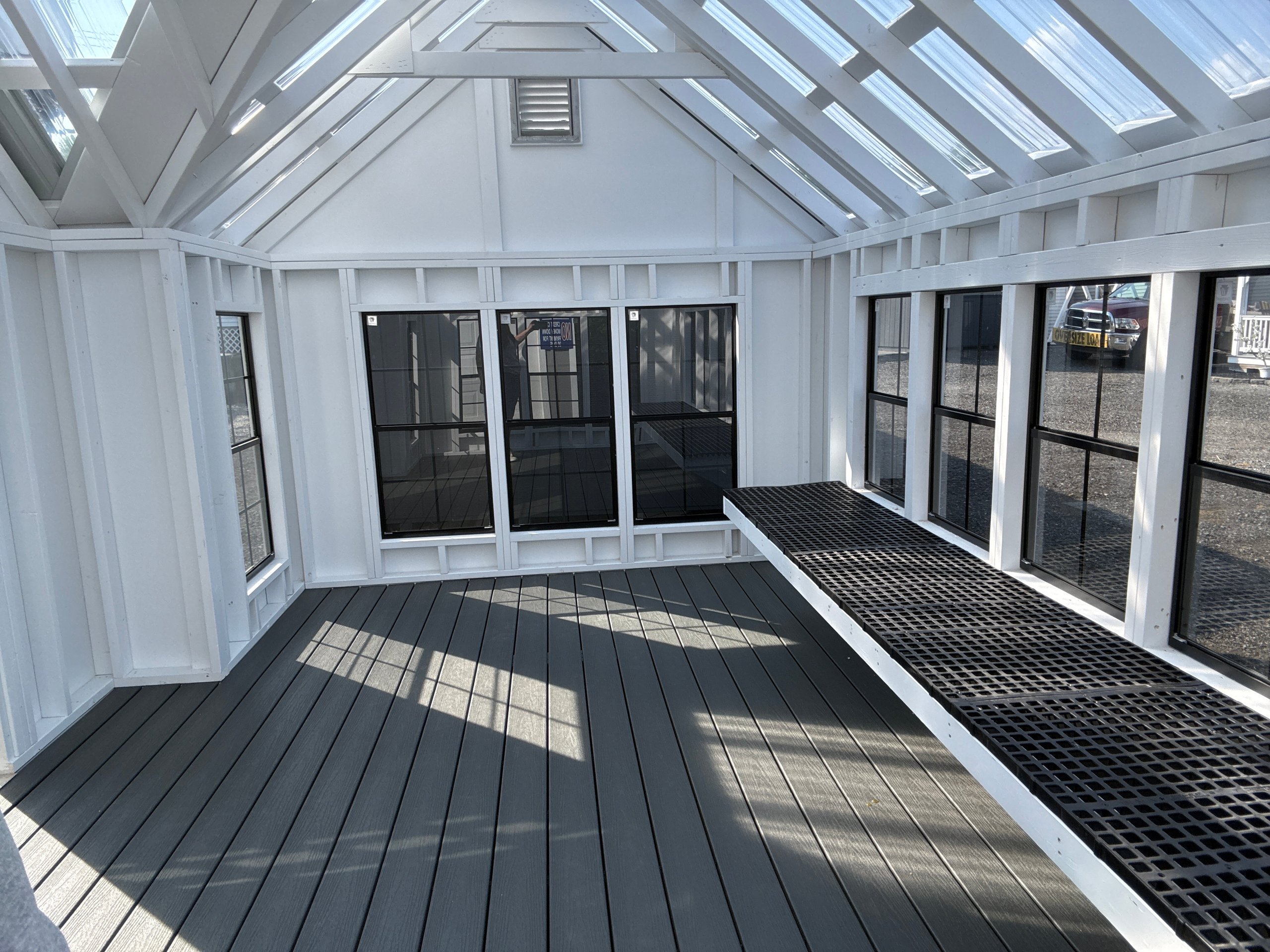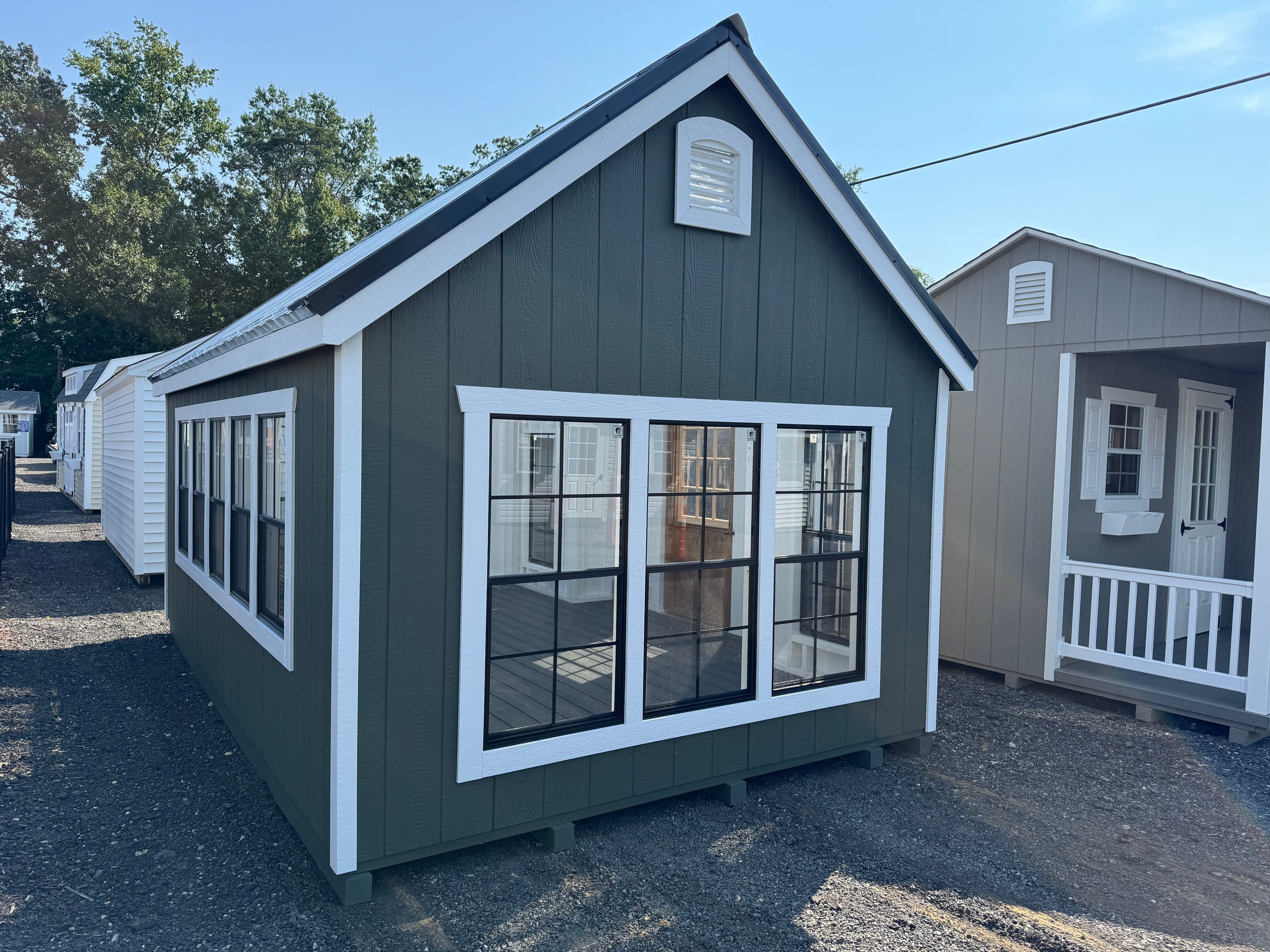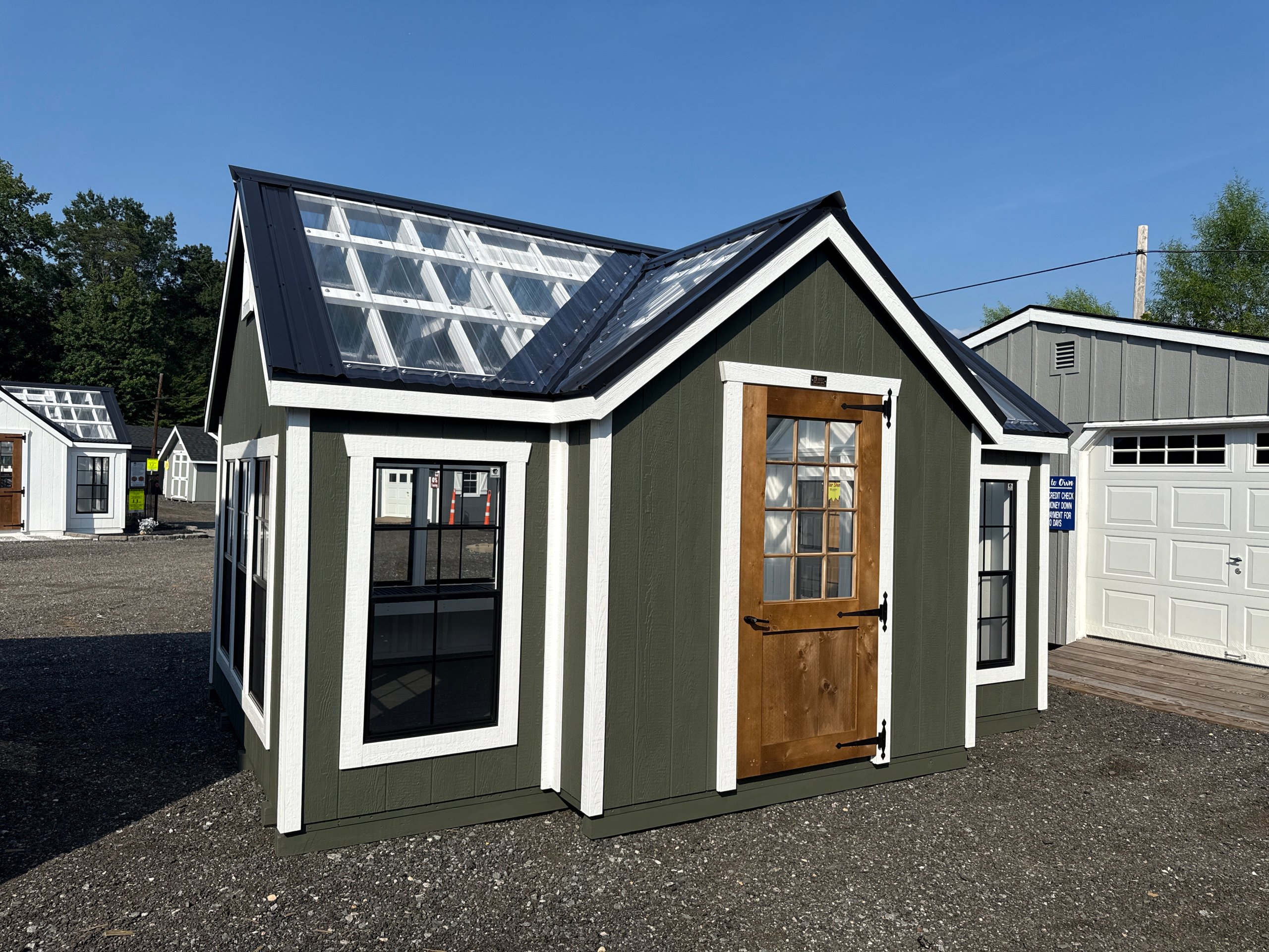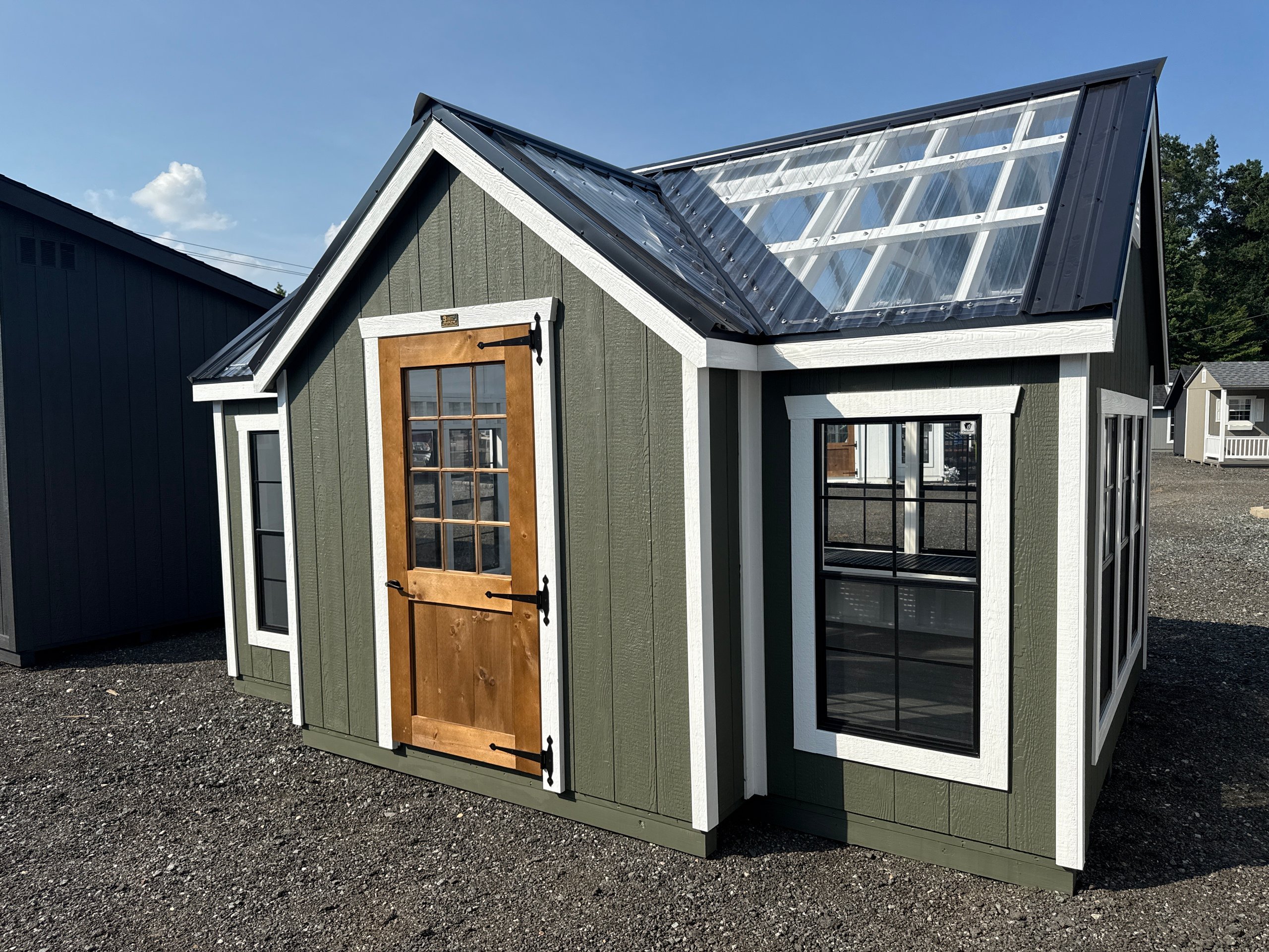 This 10×16 Victorian Greenhouse merges romantic design with heavy-duty construction and standout utility. Painted in Avocado with white trim and topped with a Clear metal roof, this greenhouse includes eight 24×48 black windows, five 24×36 black windows, and a transom pine entry door for sunlight-rich interior space. Trex decking offers weatherproof flooring, while metal roof and dormer upgrades improve longevity and ventilation. Features like a bumpout dormer, greenhouse workbench, window trim, and dual interior paints enhance both form and function. With TechShield radiant barrier, LP ProStruct flooring, and engineered framing, it delivers a refined, year-round gardening experience.