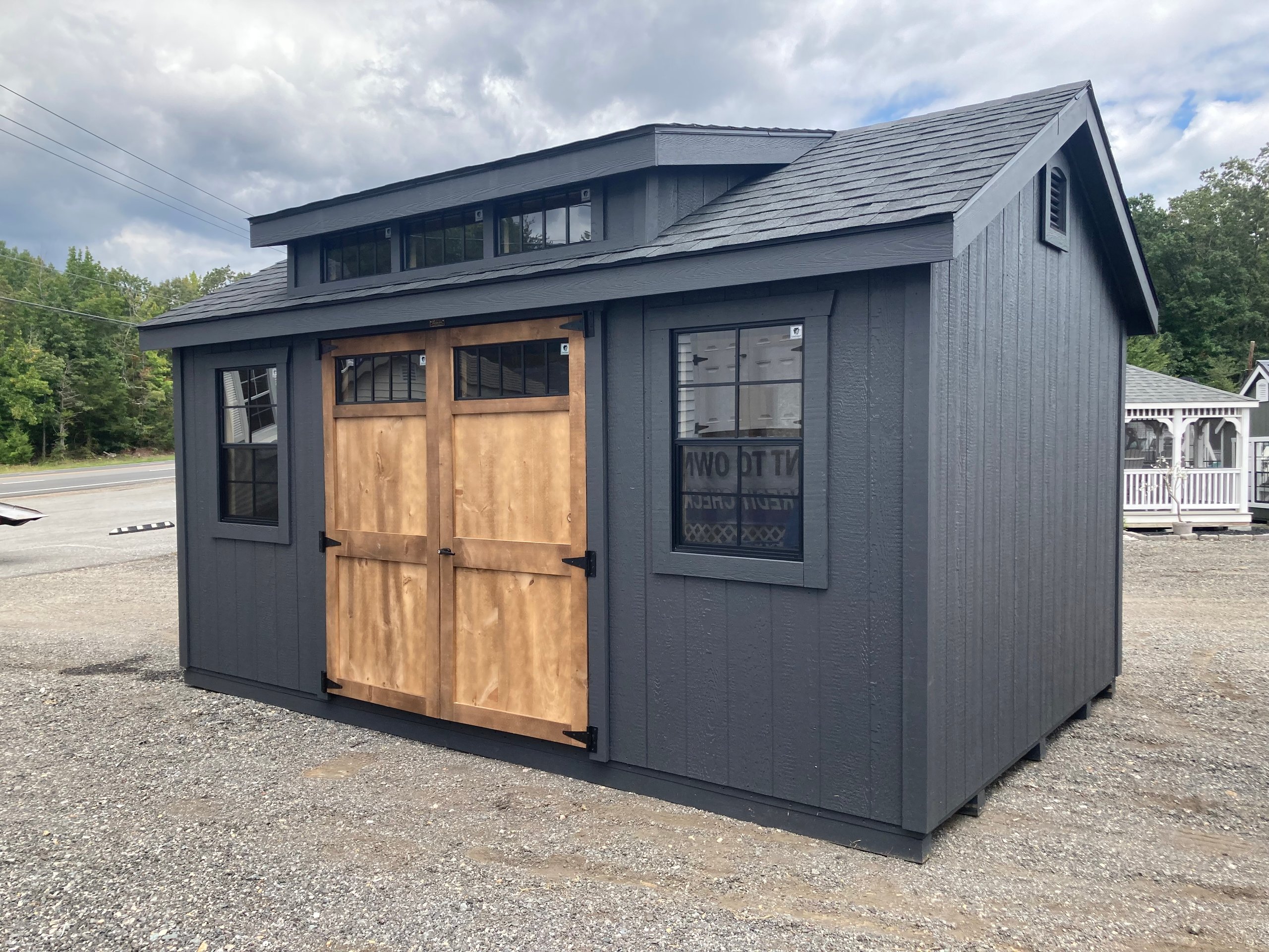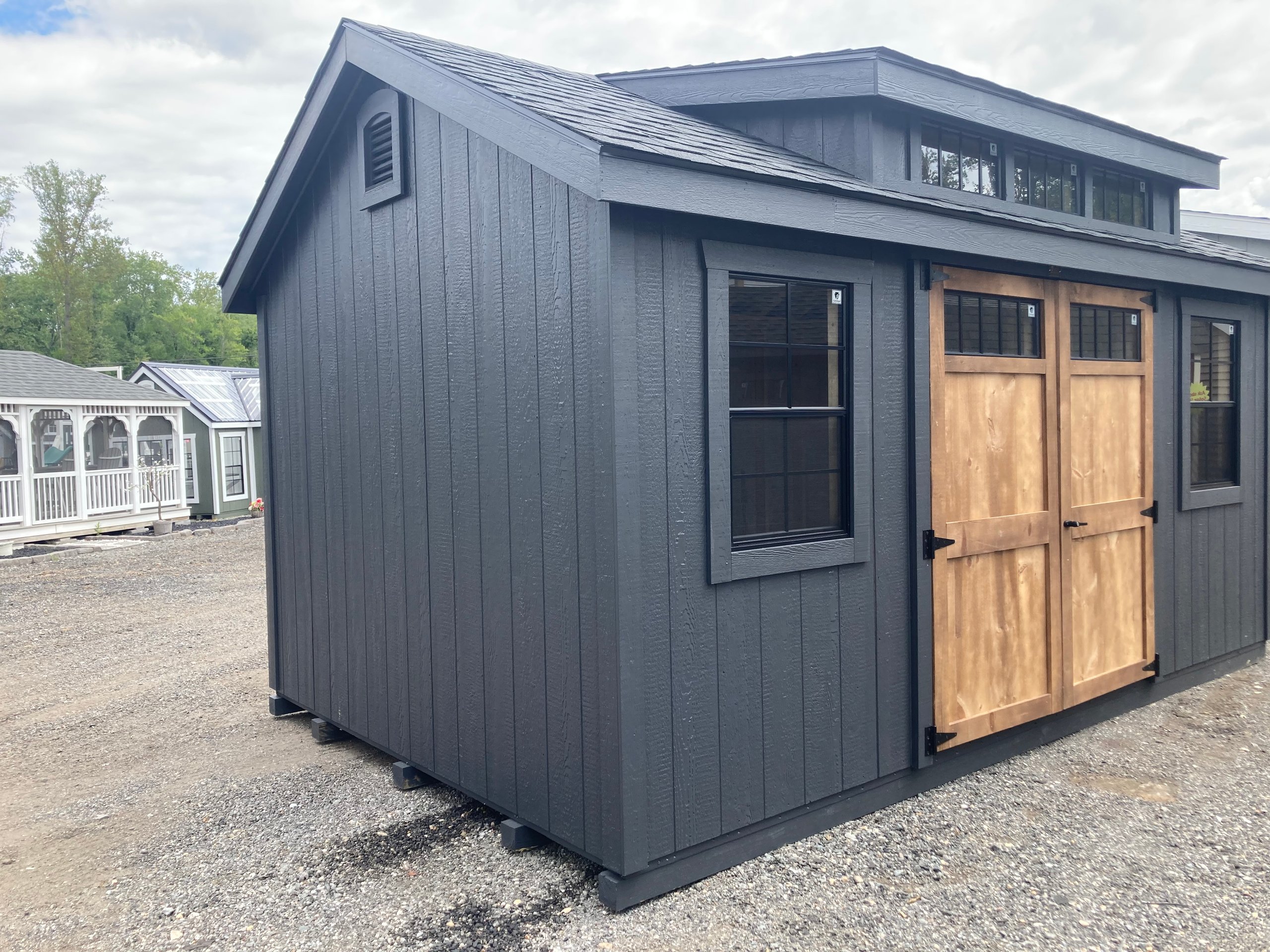 Bring timeless charm and durability to your backyard with this 10×16 Colonial A-Frame Amish-built storage shed. Designed with precision and strength, it features LP Smart Panel siding, LP ProStruct flooring, and pressure-treated floor joists for long-lasting performance. The classic Mopboard siding and trim pair beautifully with the black dimensional shingle roof, enhanced by a three-transom dormer and Victorian vents for added elegance. Upgraded 6′ pine double doors with transom windows and large 24×36 windows with black grids provide both style and natural light. Built with 2×4 framing throughout, this shed is as sturdy as it is stunning—perfect for storage or a backyard retreat.