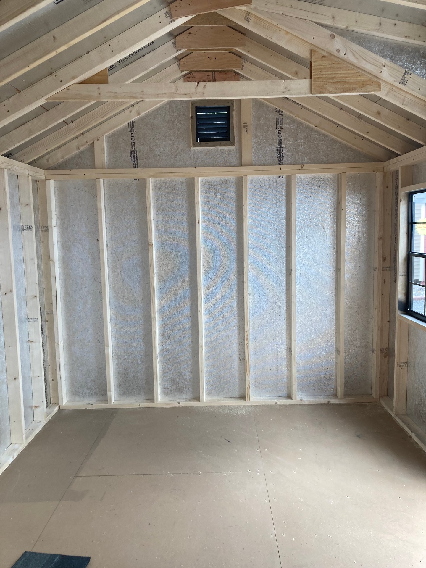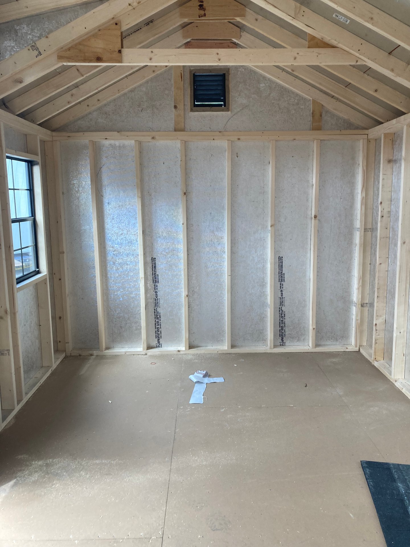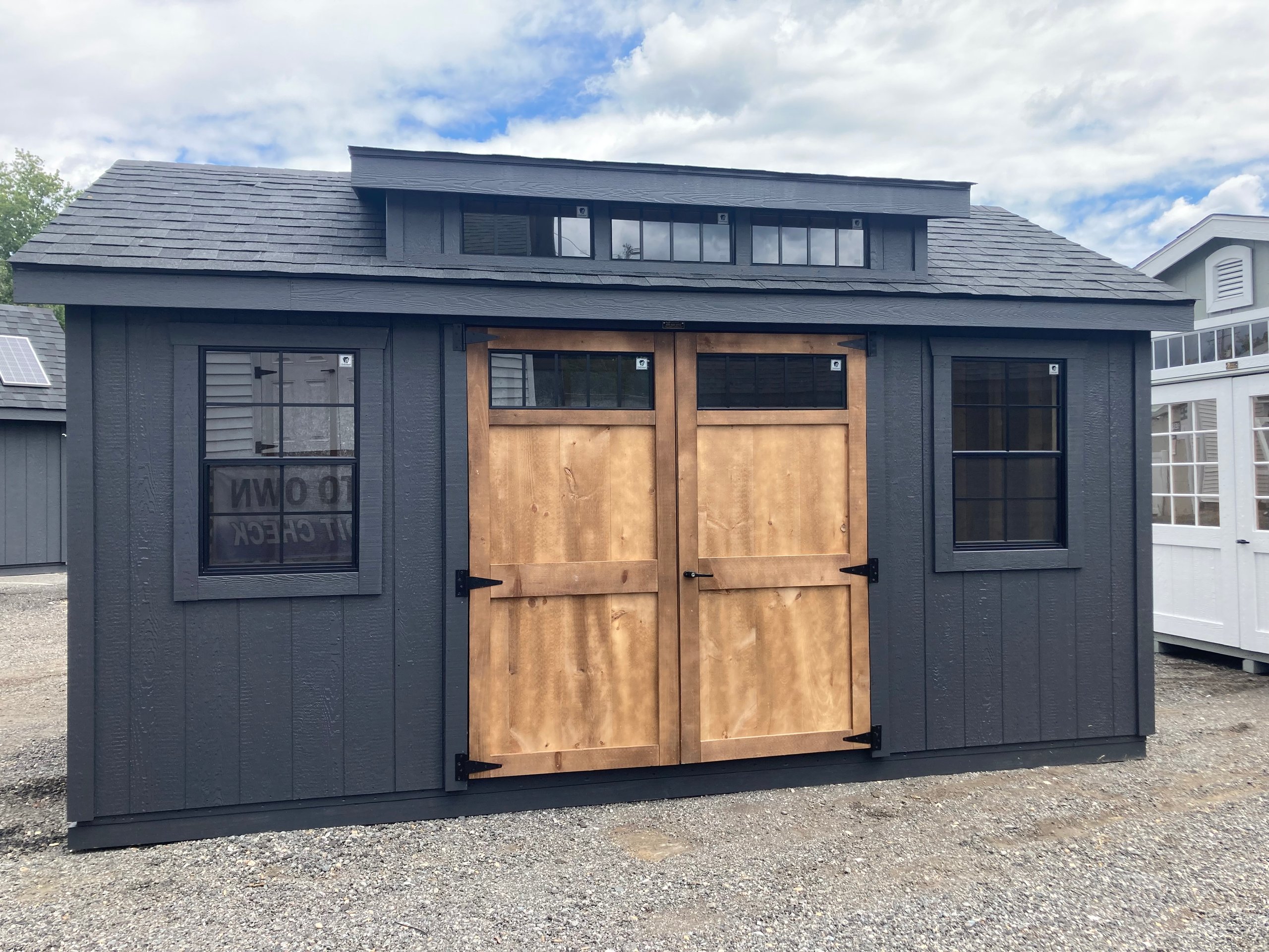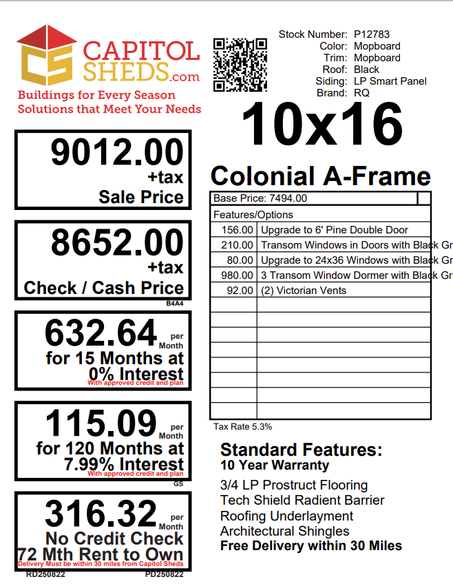 Style Name: Colonial A-Frame Size: 10×16 Siding: LP Smart Panel Main Color: Mopboard Trim Color: Mopboard Roof Color: Black Roofing: Dimensional Shingles Roofing Underlayment: Roof Felt Number of Windows: 2 Number of Doors: 1 Wall Framing: 2×4 studs 16 inches on center Roof Framing: 2×4 rafters 16 inches on center Roof Sheeting: LP Tech Shield Flooring: LP Prostruct Flooring Floor Joists: Pressure Treated 2×4 joists 12 inches on center Included Upgrades: Upgraded to 6′ Pine Double Door Transom Windows in Double Door with Black Grids Upgrade to 24×36 Windows with Black Grids 3 Transom Dormer with Black Grids in Windows Two Victorian Vents