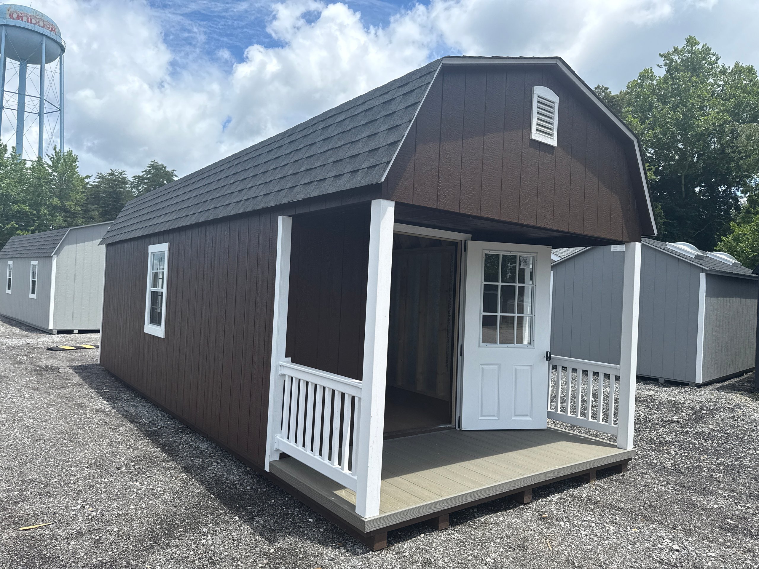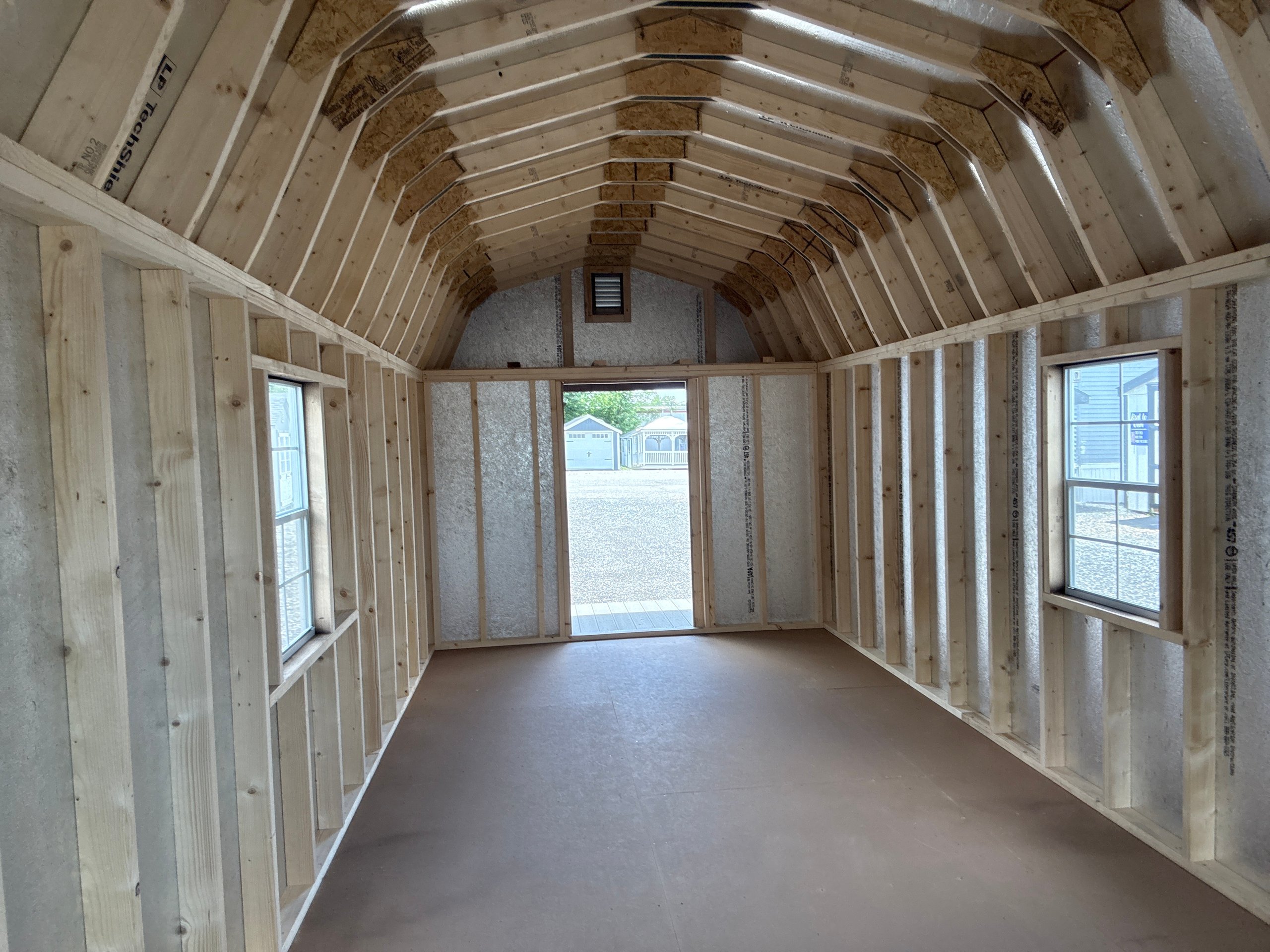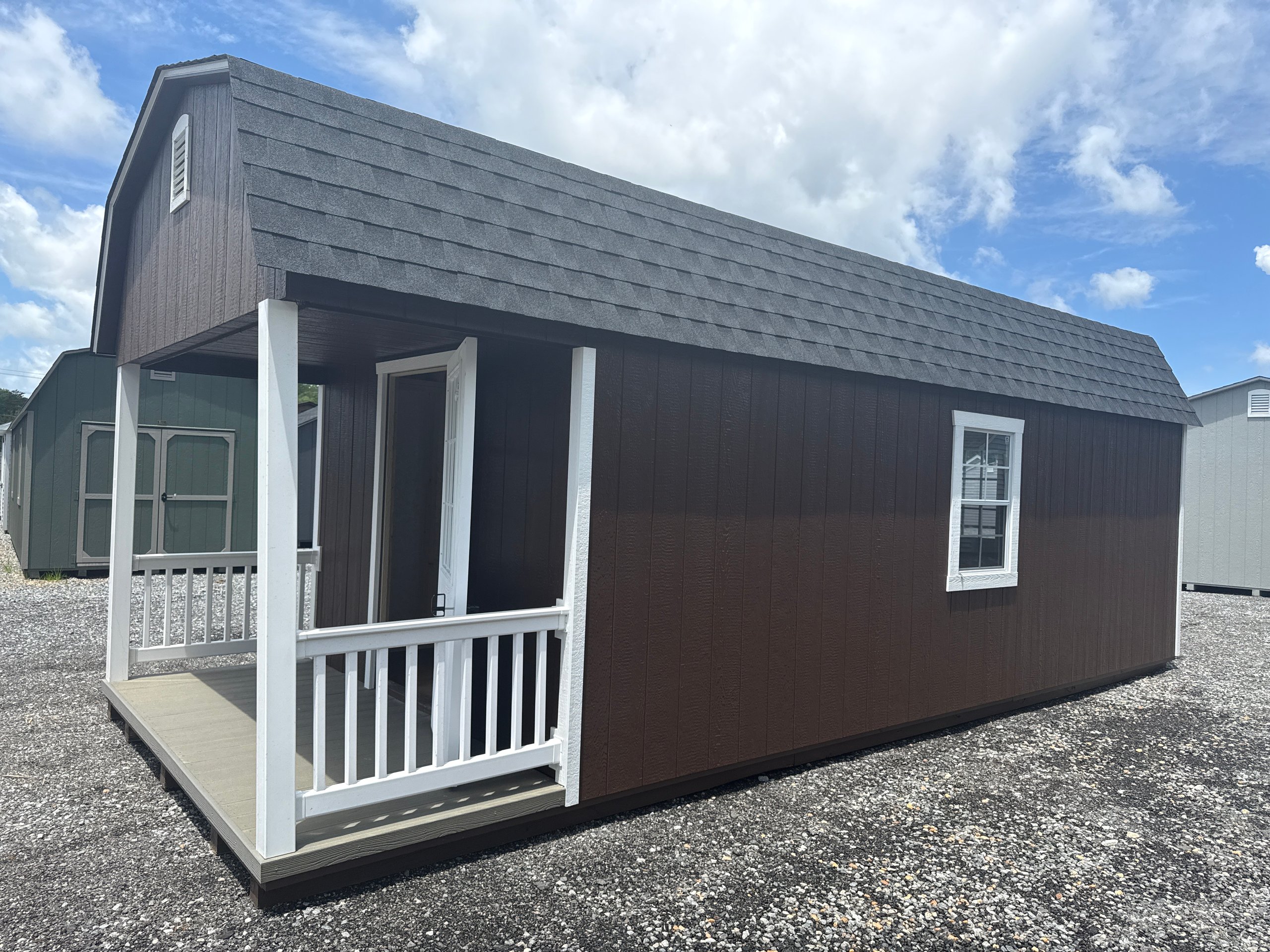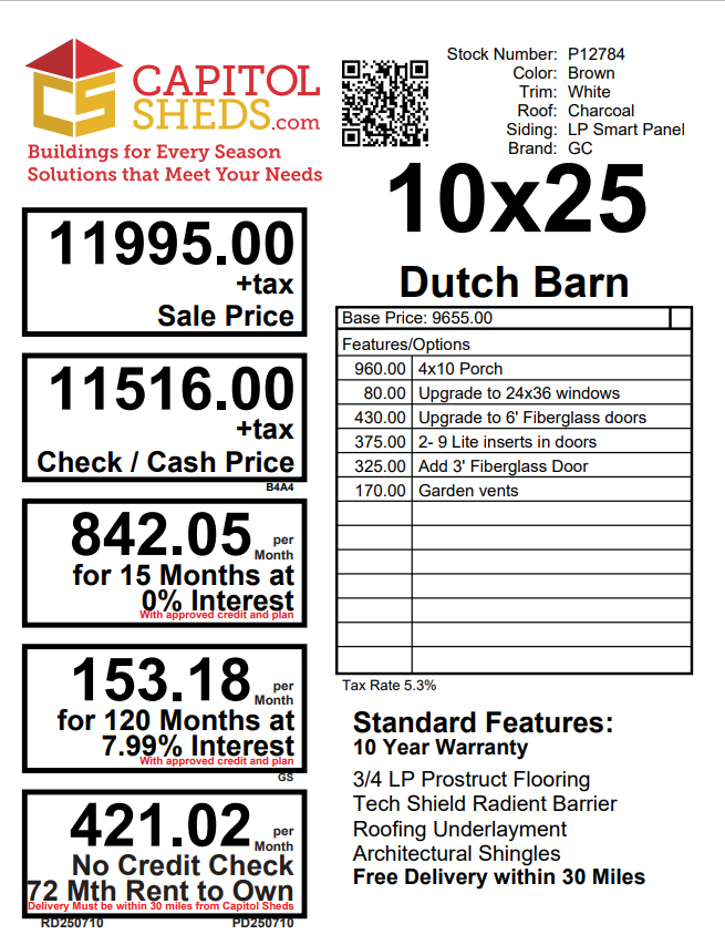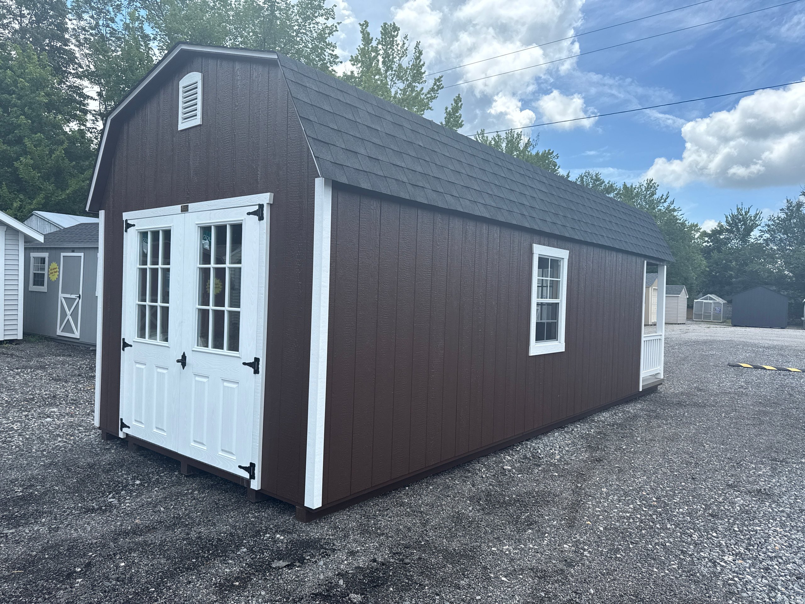 Introducing the Traditional Dutch Barn -A masterpiece of craftmanship by the Amish artisans. This 10×25 Dutch Barn is built to endure, offering exceptional quality and functionality for all your storage needs. The Dutch Barn siding provides superior durability while exuding timeless elegance in Brown, complemented by pristine White. The Charcoal colored dimensional shingles protect your belongings from the elements ensuring long-lasting reliability. With 3-doors for easy access, the interior boasts 2×4 stud wall framing, 2×4 rafter roof framing, and LP Tech Shield roof sheeting for added strength. The LP Prostruct Flooring, coupled with pressure-treated 2×4 floor joists ensures stability and longevity. invest in the Dutch Barn for a storage solution that’s built to last.