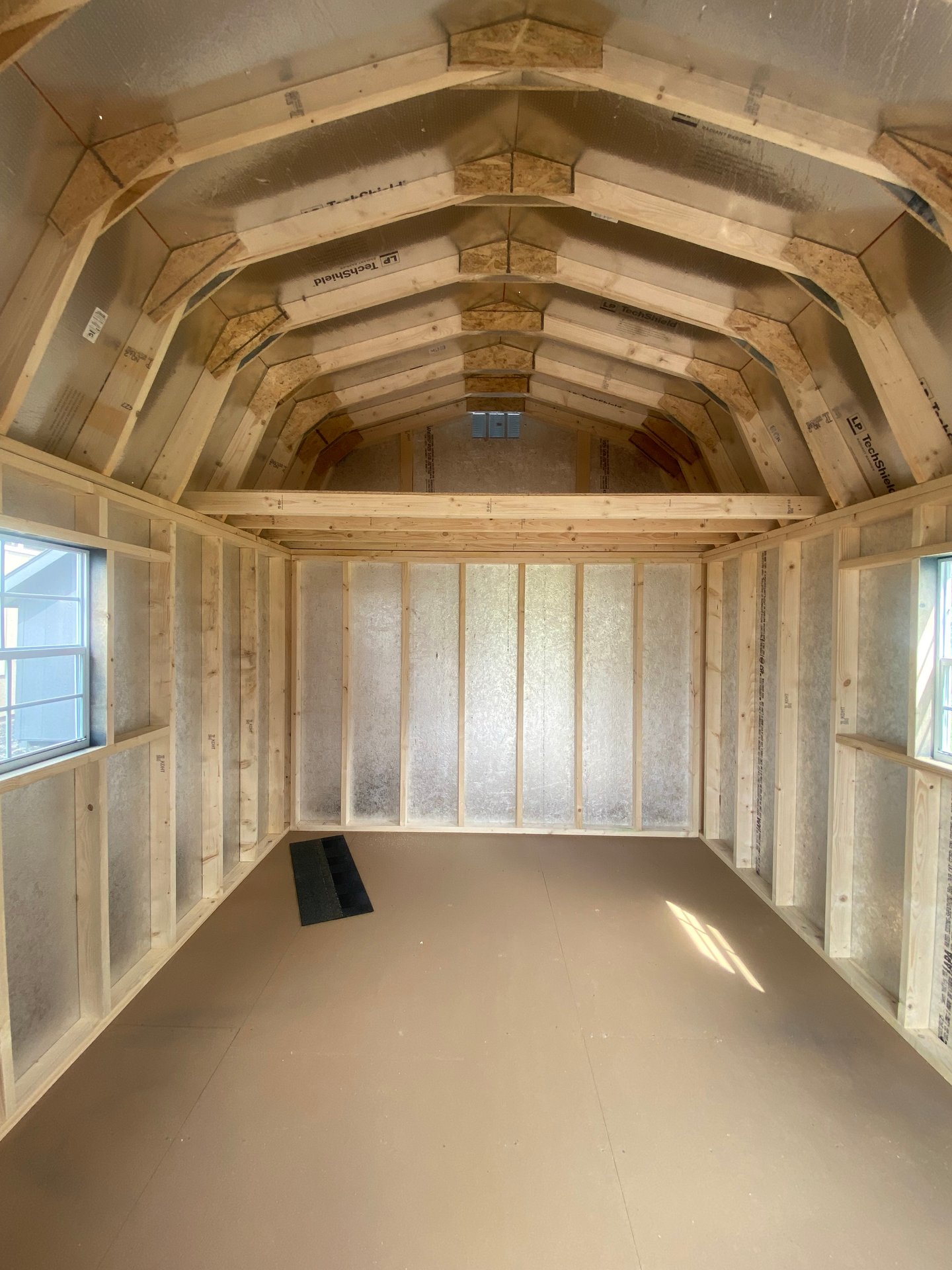 This 10×14 Dutch Barn offers a classic barn profile with superior functionality. The exterior features LP Smart Panel siding finished in a bold dark gray with light gray trim, perfectly accented by a charcoal architectural shingle roof with roof felt underlayment for long‑lasting protection. Built with 2×4 wall studs and rafters 16″ on center, LP Tech Shield roof sheeting, and LP T&G Prostruct flooring over 12″ on‑center joists, this shed is designed for strength and durability. Two windows bring in natural light, while double doors provide easy access. A spacious 4×10 loft adds valuable overhead storage, making organization simple.