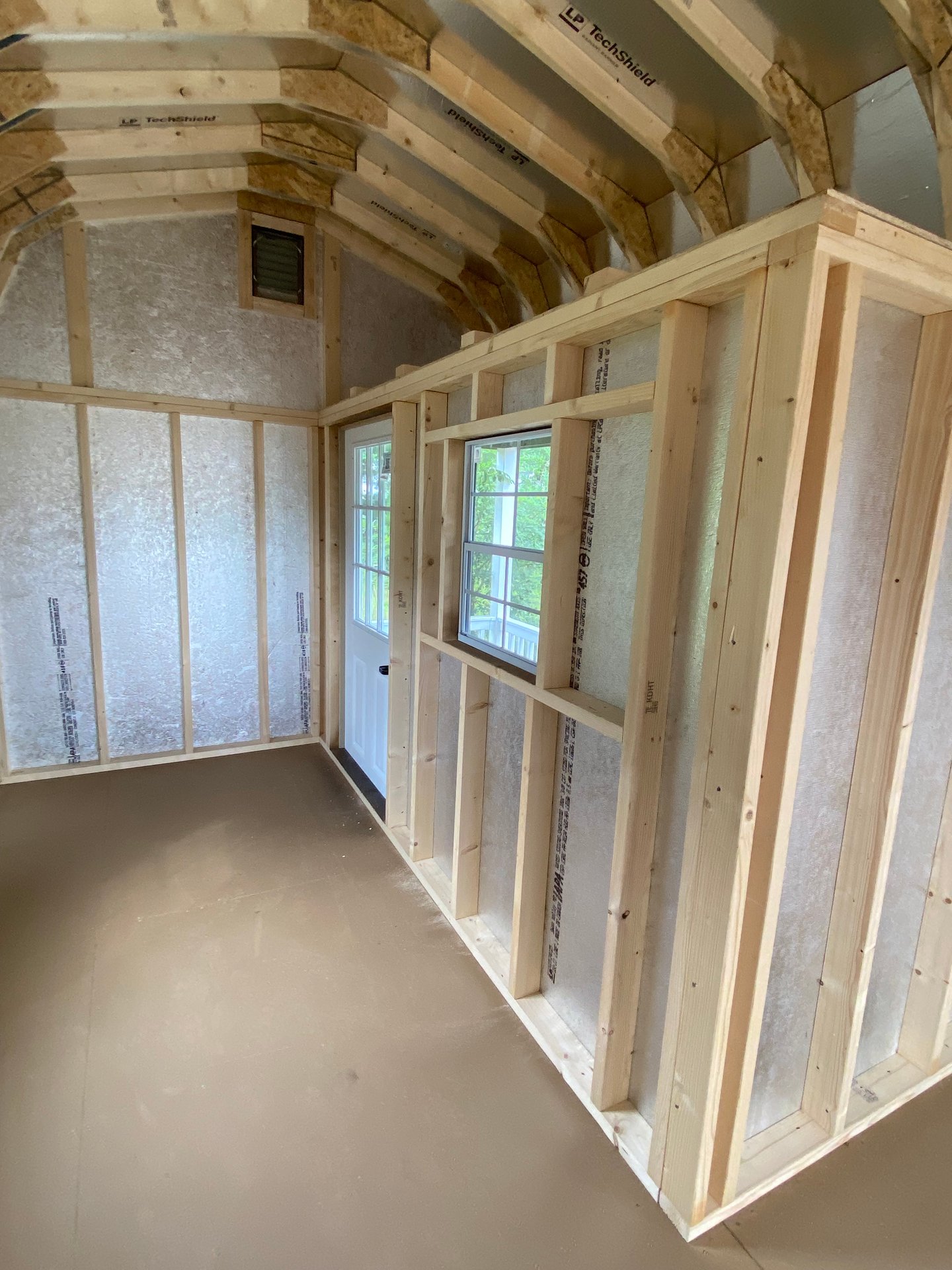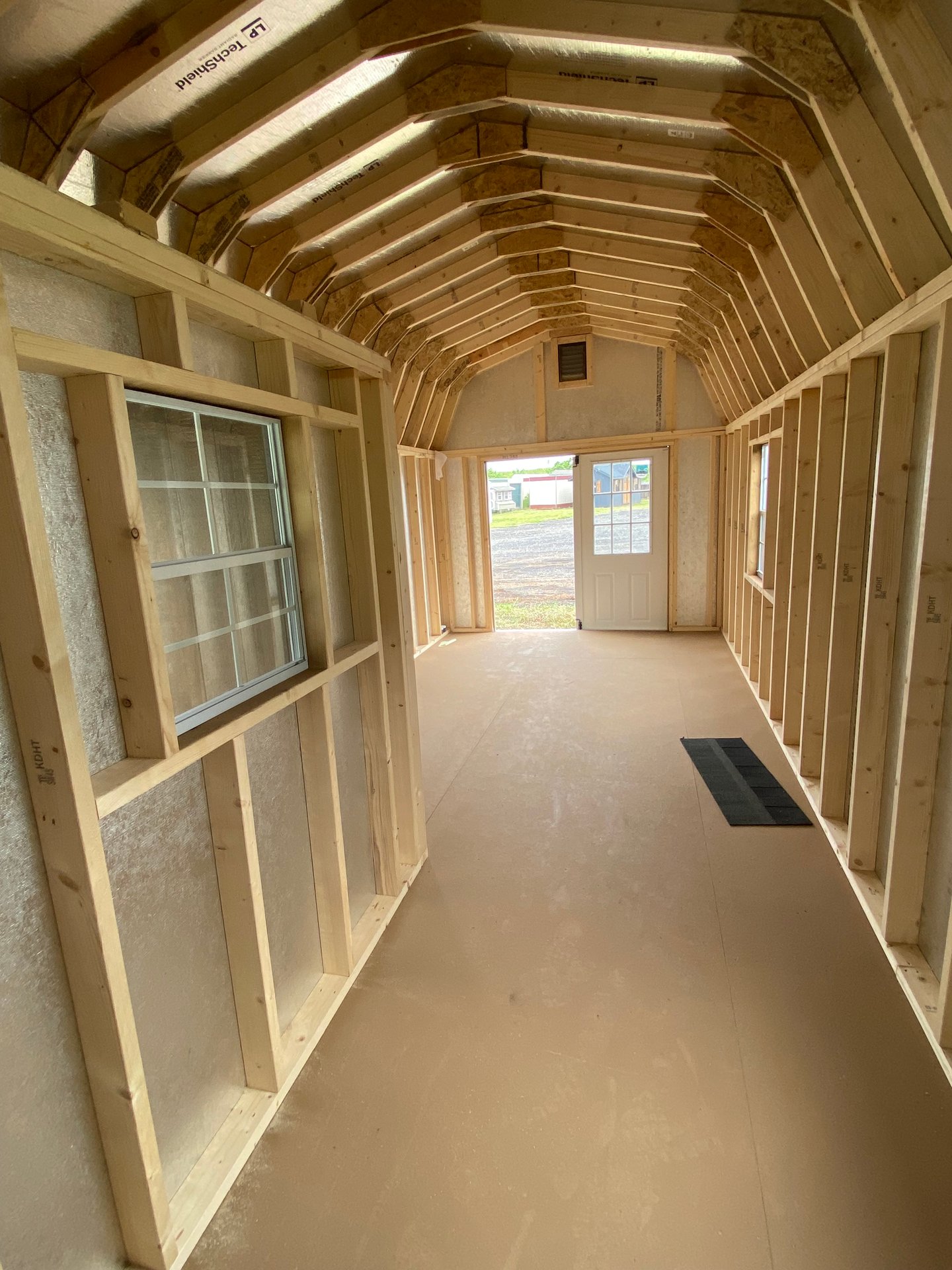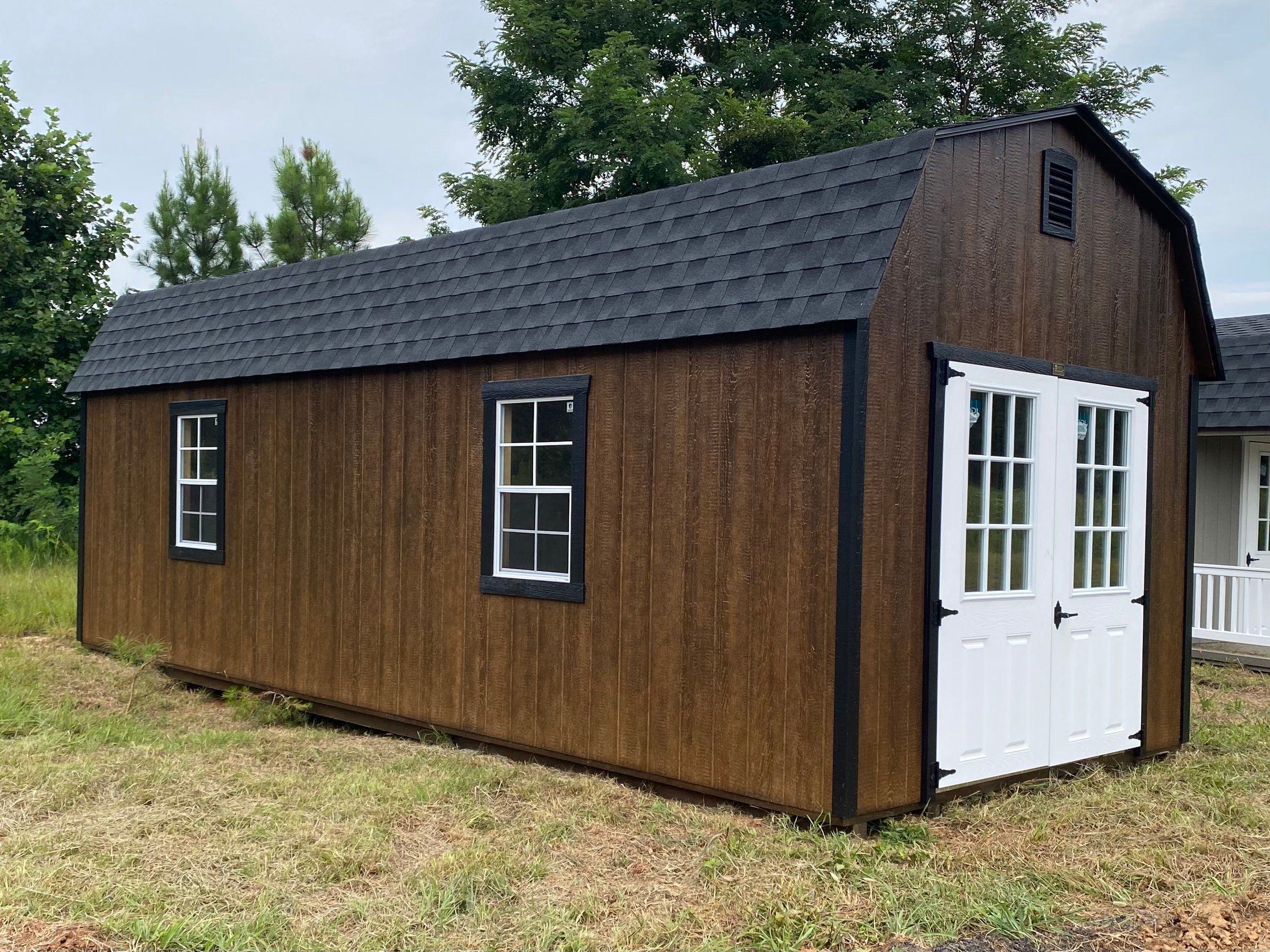 This stunning 10×25 Dutch Barn with Corner Porch offers a unique blend of rustic charm and functional design. Clad in Mushroom Urethane-stained LP Smart Panel siding with bold black trim and a Charcoal architectural shingle roof, this shed makes a striking backyard statement. It features a 4×10 corner porch, four 24×36 windows, and three 9-lite fiberglass doors for generous light and access. Built tough with 2×4 framing 16″ on center, LP Tech Shield roof sheeting, and LP Prostruct flooring over 12″ OC treated floor joists. Dual garden vents provide airflow—ideal for a workshop, studio, or deluxe storage space.