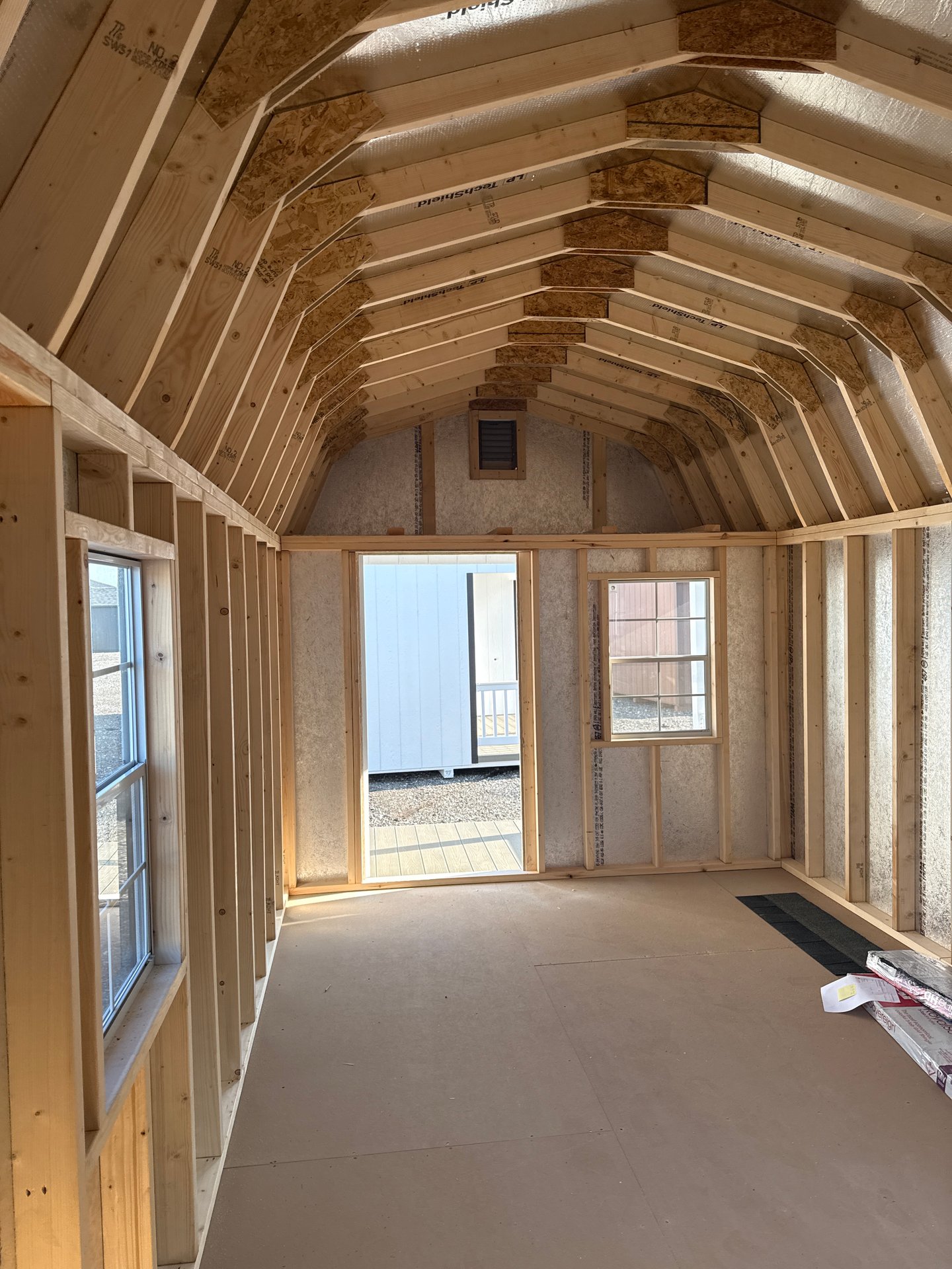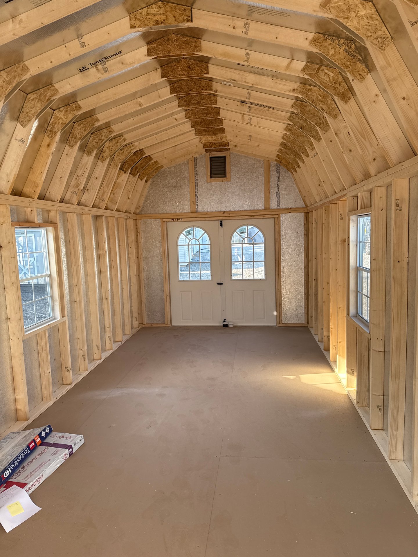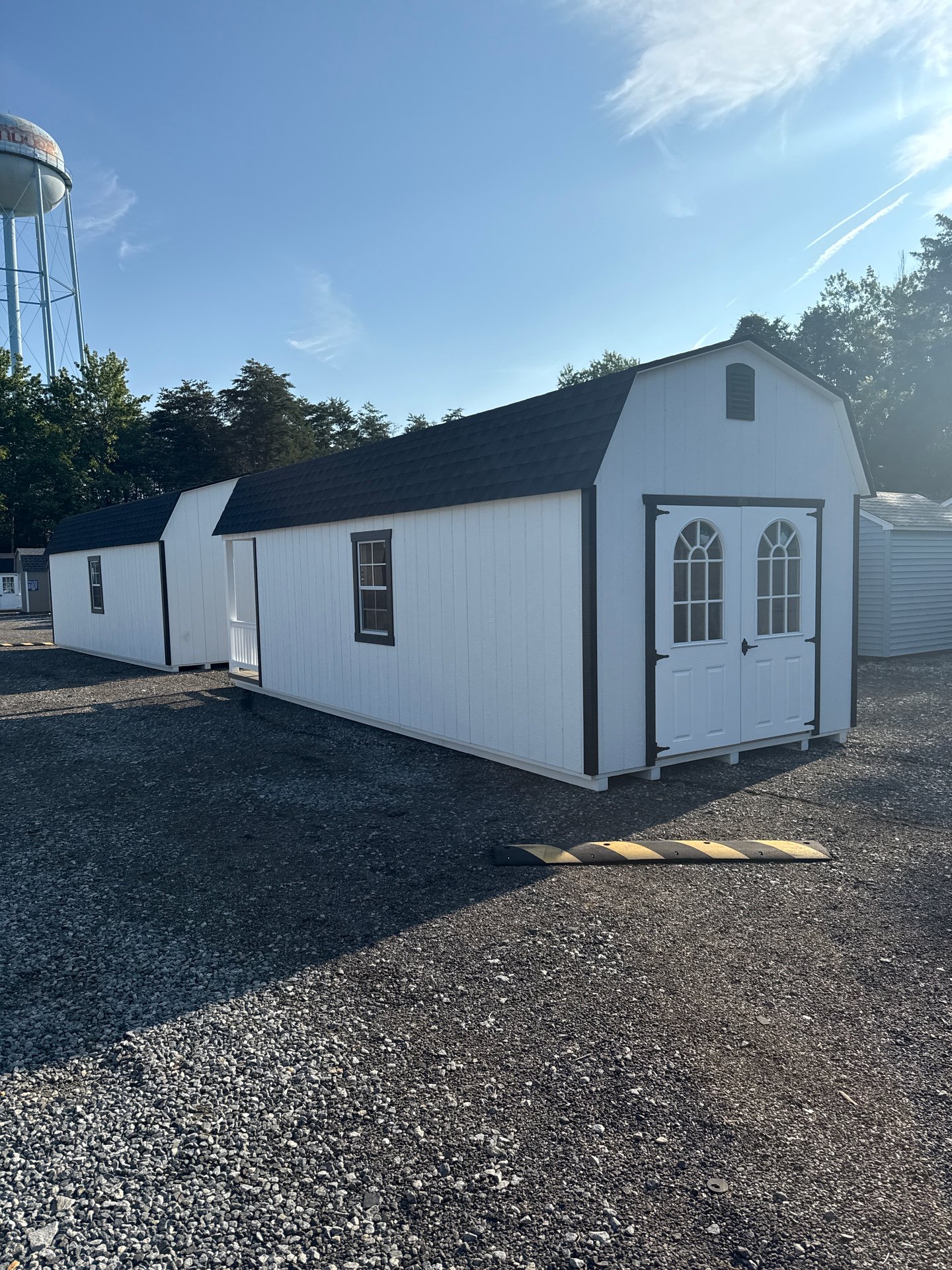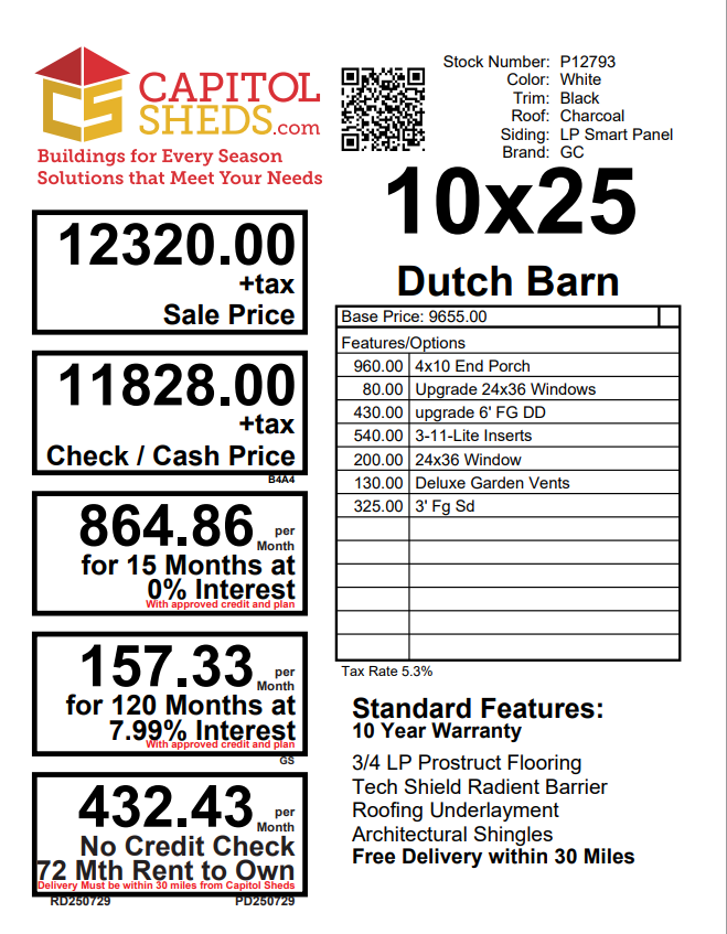 Introducing the Traditional Dutch Barn -A masterpiece of craftmanship by the Amish artisans. This 10×25 Dutch Barn is built to endure, offering exceptional quality and functionality for all your storage needs. The Dutch Barn siding provides superior durability while exuding timeless elegance in White, complemented by pristine Black. The Charcoal colored dimensional shingles protect your belongings from the elements ensuring long-lasting reliability. With 3-doors for easy access, the interior boasts 2×4 stud wall framing, 2×4 rafter roof framing, and LP Tech Shield roof sheeting for added strength. The LP Prostruct Flooring, coupled with pressure-treated 2×4 floor joists ensures stability and longevity. invest in the Dutch Barn for a storage solution that’s built to last.