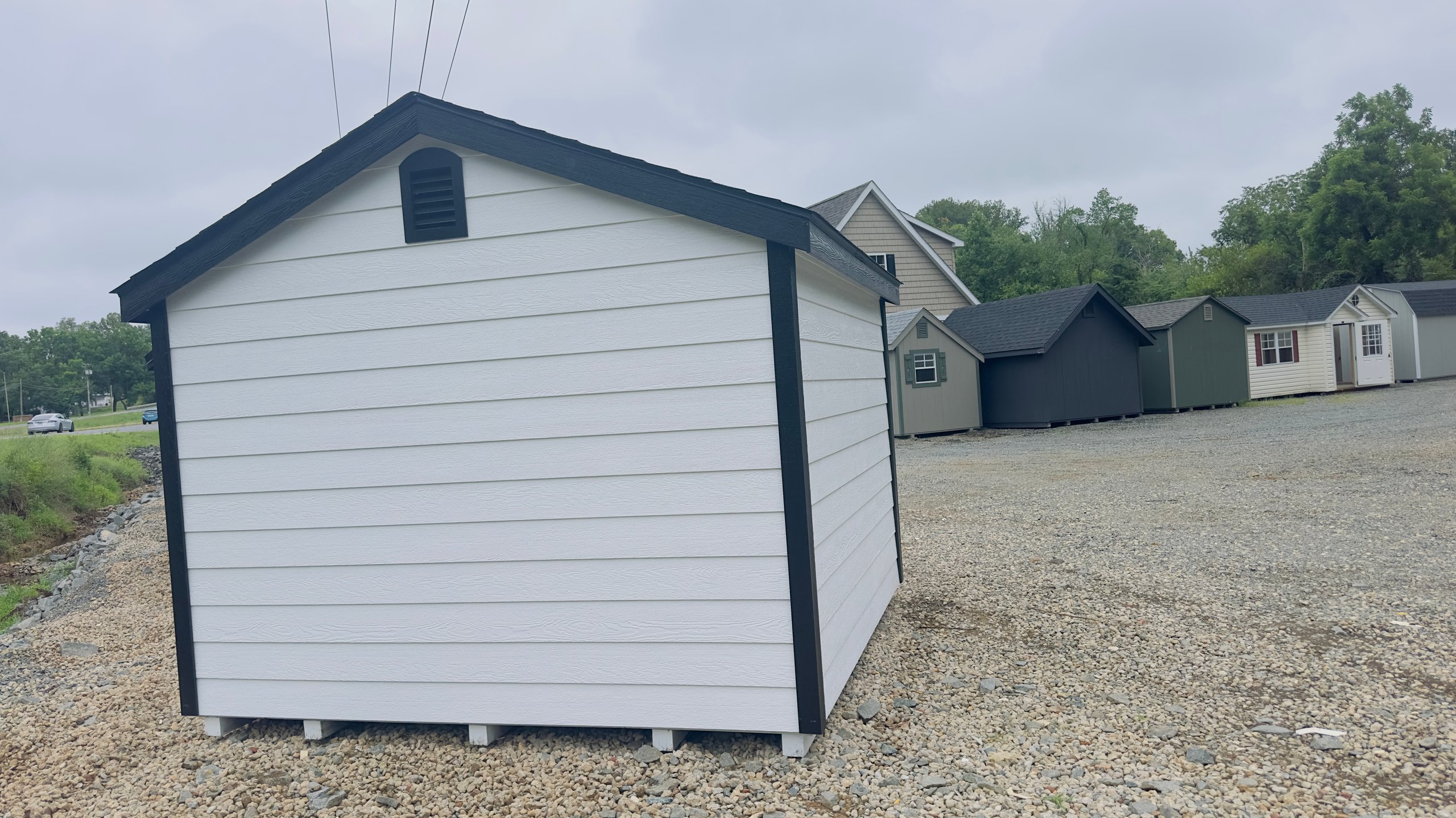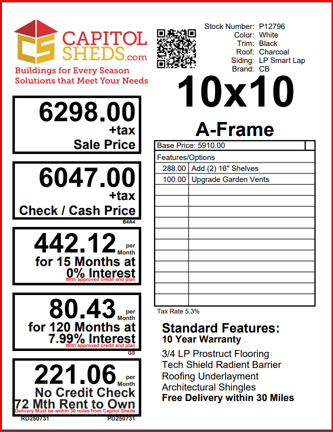 This stylish 10×10 A-Frame shed blends function with striking aesthetics, featuring crisp White LP Smart Lap siding paired with bold Black trim and a Charcoal architectural shingle roof. Double doors offer wide access for storing lawn equipment, tools, or seasonal décor, while two windows bring in natural light. Built on durable 3/4″ LP ProStruct flooring, it also includes two 16″ interior shelves for added organization and upgraded garden vents for improved airflow. Its timeless black-and-white color scheme adds visual appeal to any backyard, making it a compact and practical storage solution with a touch of classic charm.