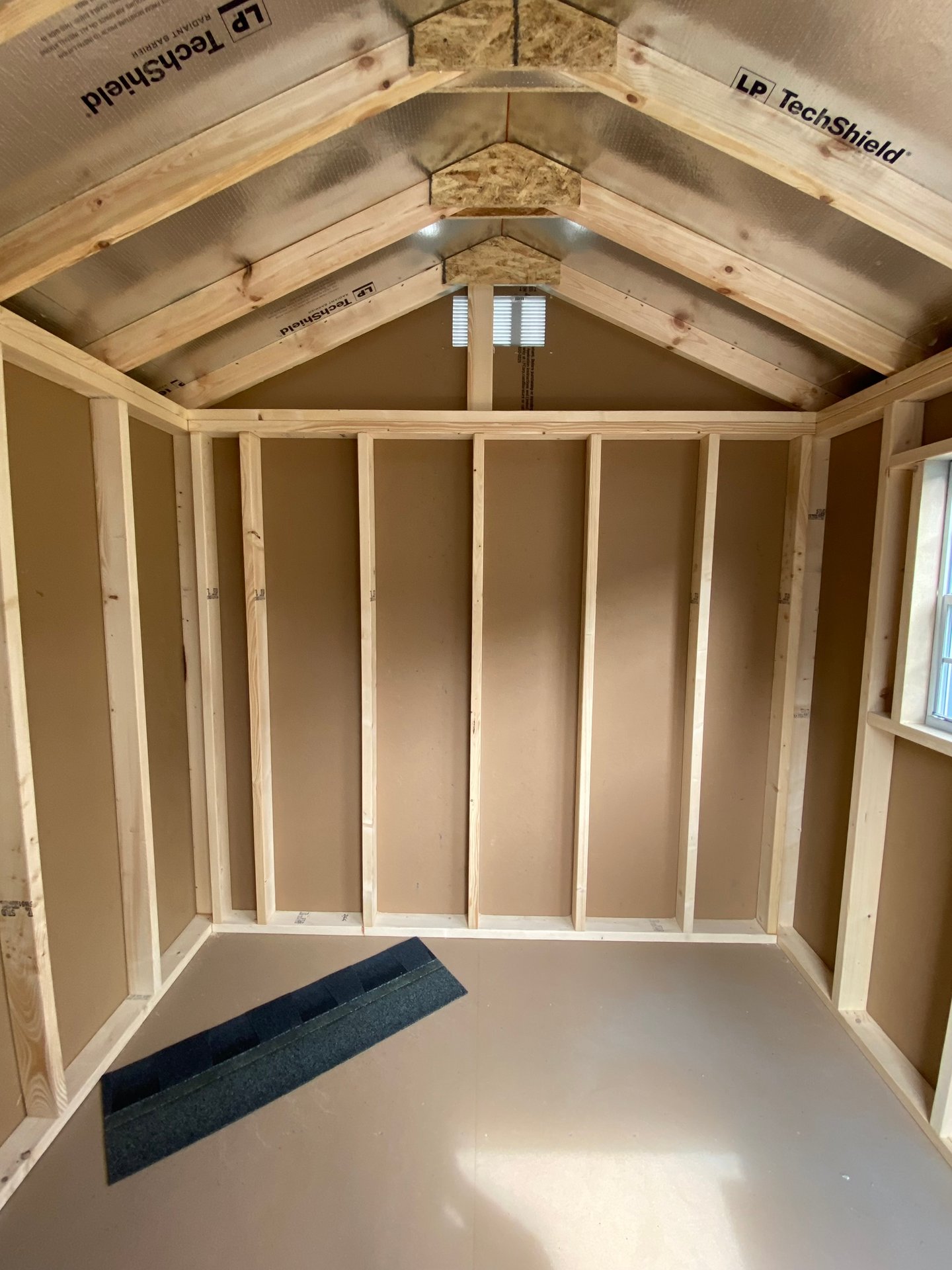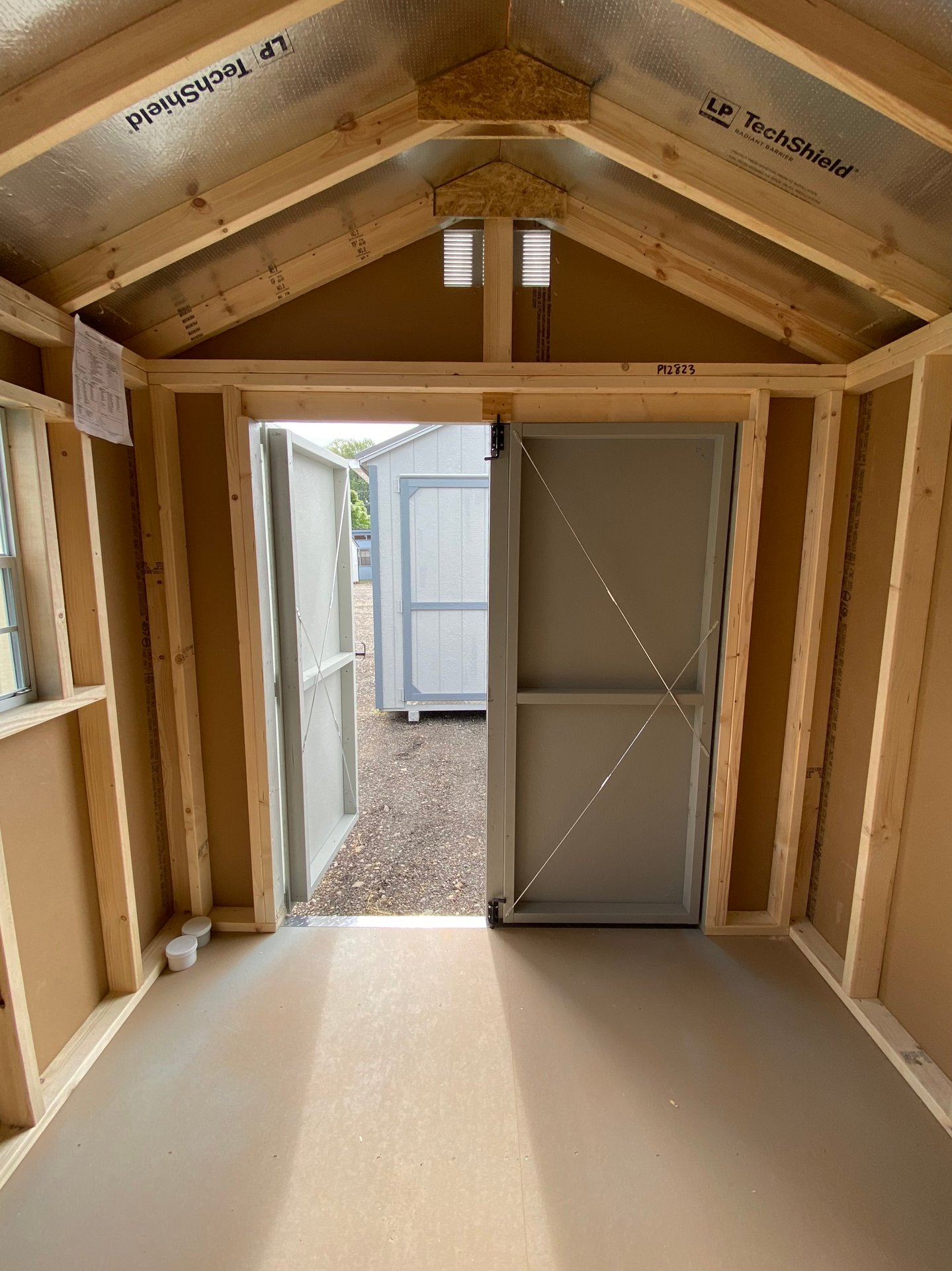 This compact 8×8 A-Frame shed is a perfect backyard solution for neat, organized storage with classic curb appeal. Finished in Light Gray LP Smart Panel siding with crisp white trim and a Charcoal architectural shingle roof, it blends seamlessly into any setting. The shed is built with 2×4 wall studs and rafters spaced 16″ on center, LP Tech Shield roof sheeting, and LP Prostruct T&G flooring supported by pressure-treated 2×4 joists 12″ on center for lasting durability. Two windows provide natural light, while upgraded 5ft double doors allow easy access for larger items like lawn equipment and bikes.