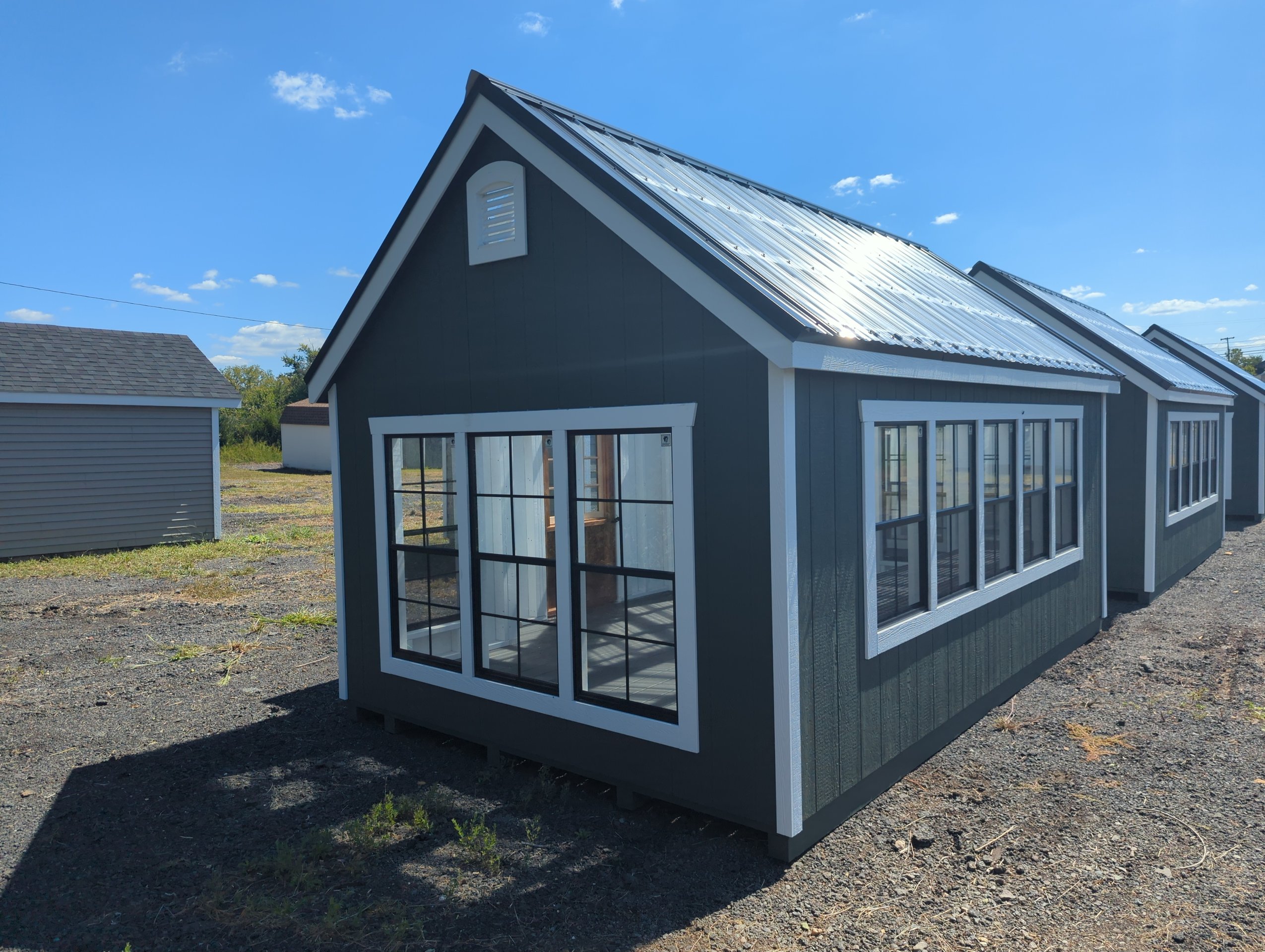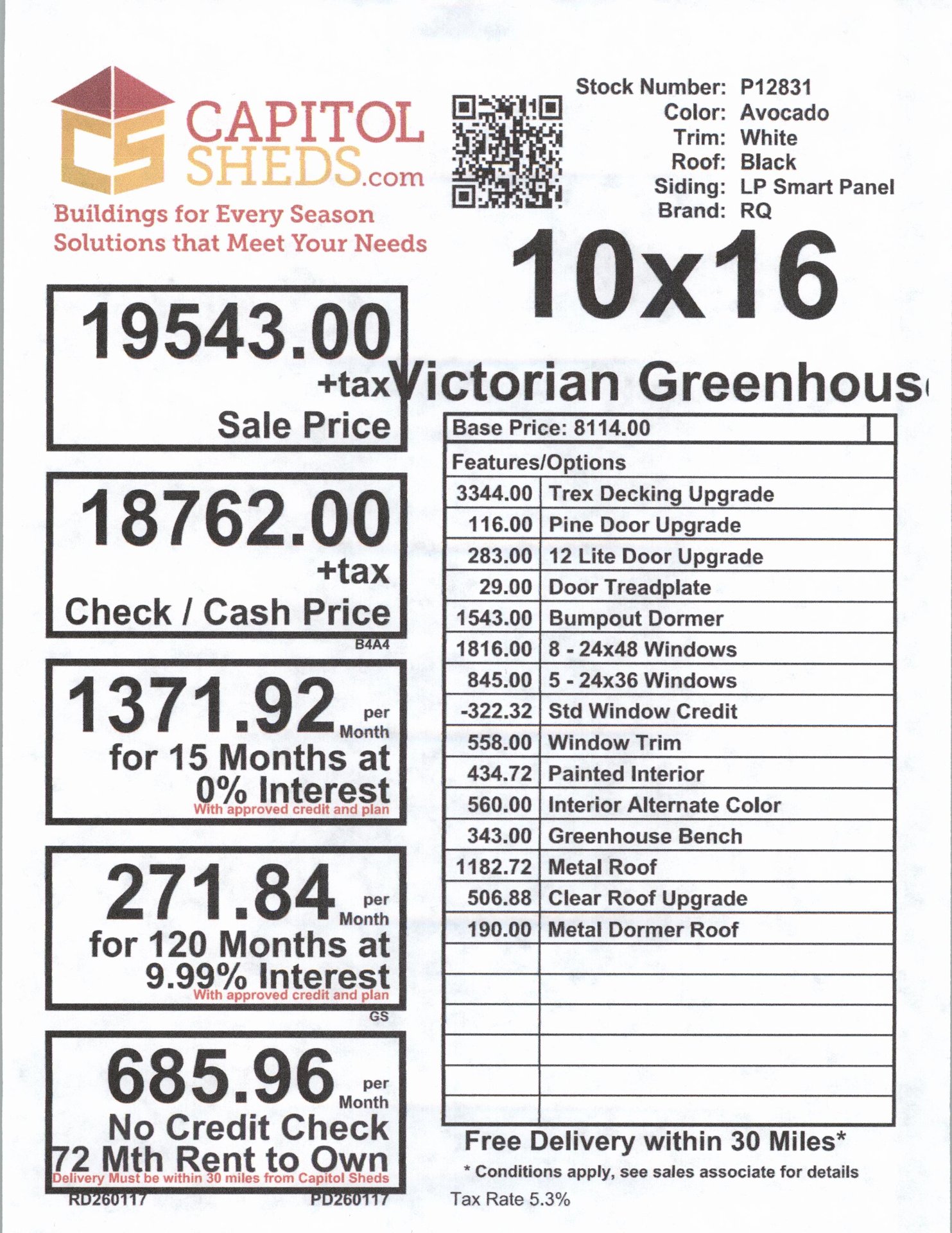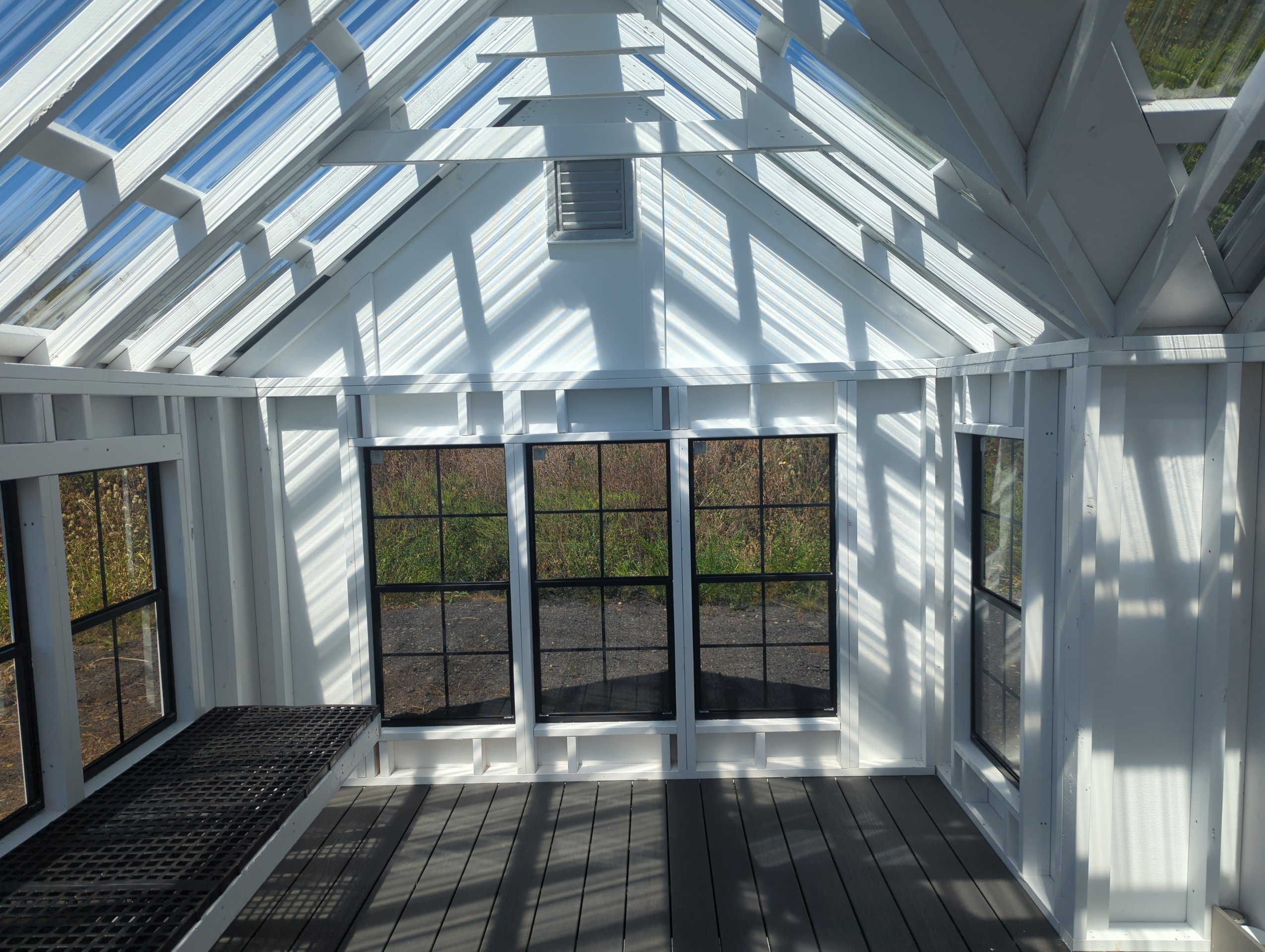 Bring timeless charm and modern craftsmanship to your backyard with this Amish-built Victorian Greenhouse. The 10×16 design features LP Smart Panel siding in rich avocado with crisp white trim, accented by a striking clear/black metal roof. Thirteen windows, a dormer, and a 12-lite pine door flood the interior with natural light, while a built-in greenhouse bench makes planting effortless. Built on sturdy 2×4 framing with pressure-treated joists and upgraded Trex decking, it also includes a painted interior for a clean, finished look—perfect for growing, relaxing, and showcasing your green thumb.