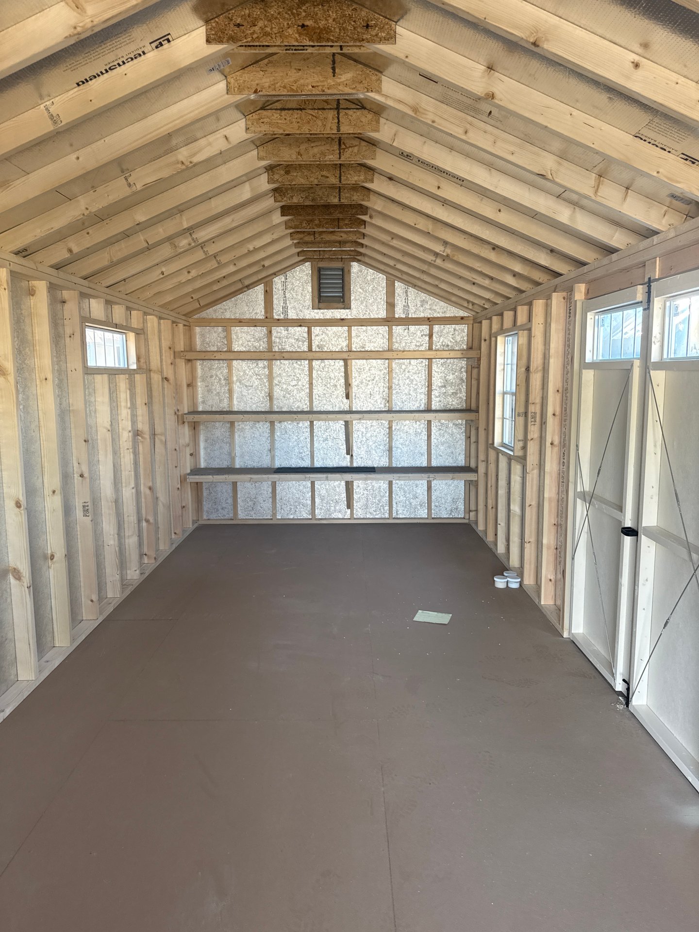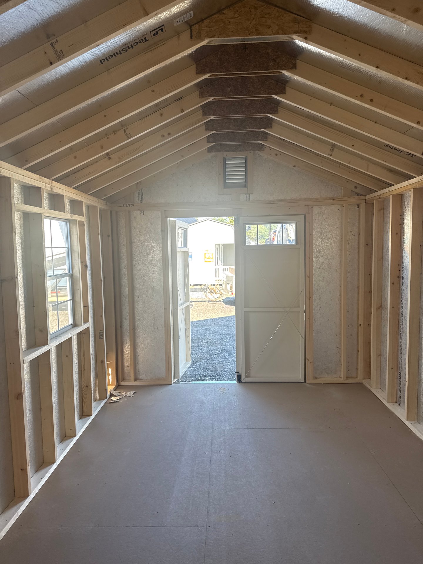 Introducing the Traditional High Wall A-Frame -A masterpiece of craftmanship by the Amish artisans. This 10×25 High Wall A-Frame is built to endure, offering exceptional quality and functionality for all your storage needs. The High Wall A-Frame siding provides superior durability while exuding timeless elegance in Beige, complemented by pristine White. The Weatherwood colored dimensional shingles protect your belongings from the elements ensuring long-lasting reliability. With 3-doors for easy access, the interior boasts 2×4 stud wall framing, 2×4 rafter roof framing, and LP Tech Shield roof sheeting for added strength. The LP Prostruct Flooring, coupled with pressure-treated 2×4 floor joists ensures stability and longevity. invest in the High Wall A-Frame for a storage solution that’s built to last.