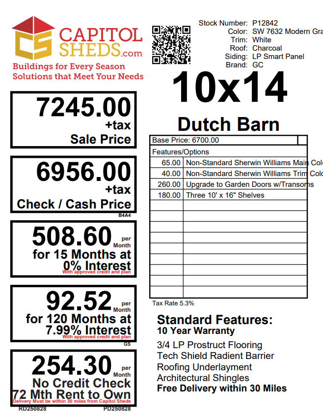 Reserve this building for a $500 deposit. Within 1 business day a rep will contact you to discuss delivery details and discounts you may qualify for such as cash/check, military/1st responder, etc. Don’t lose out on this beautiful building – Place your deposit today to hold it!
