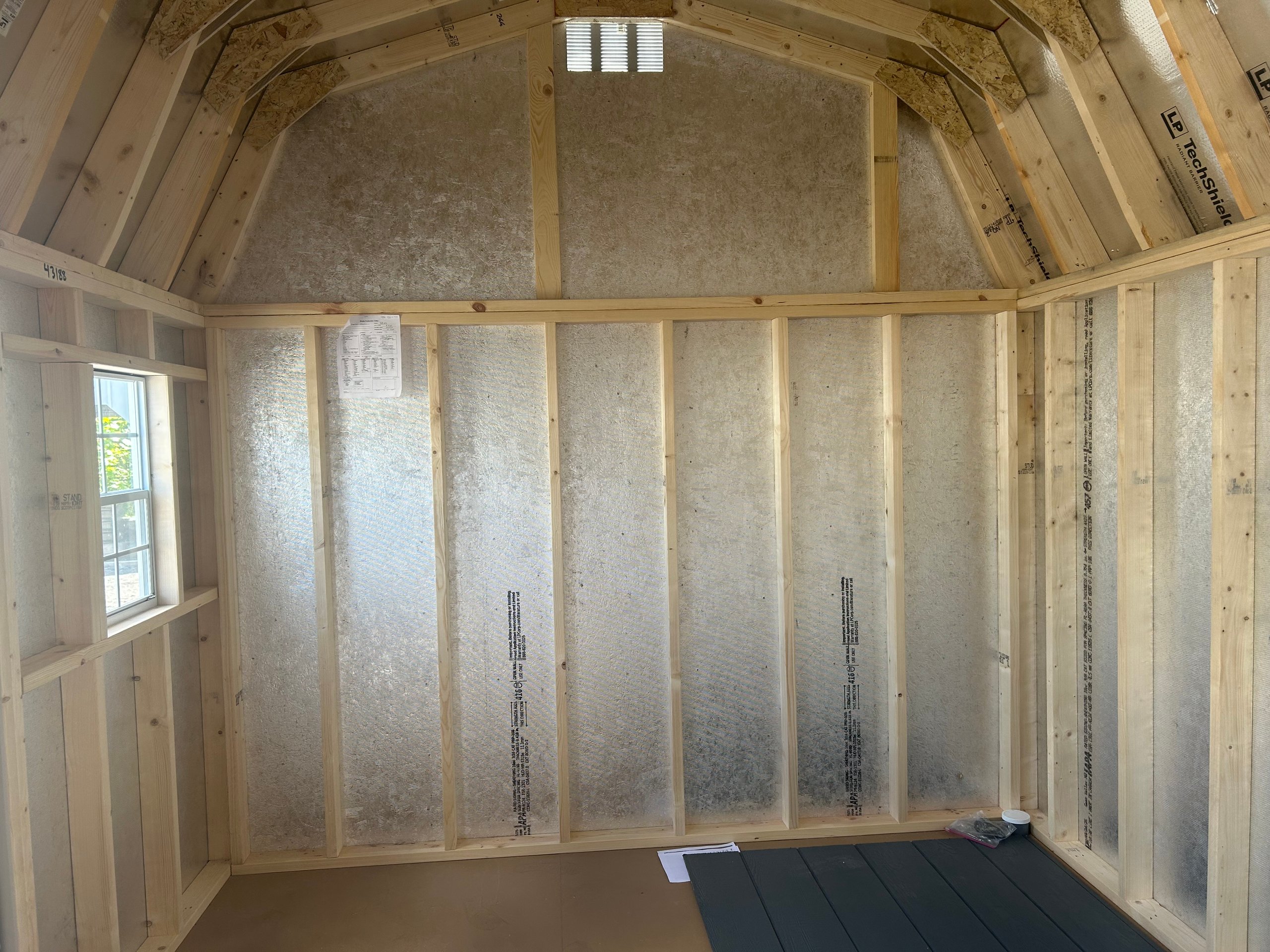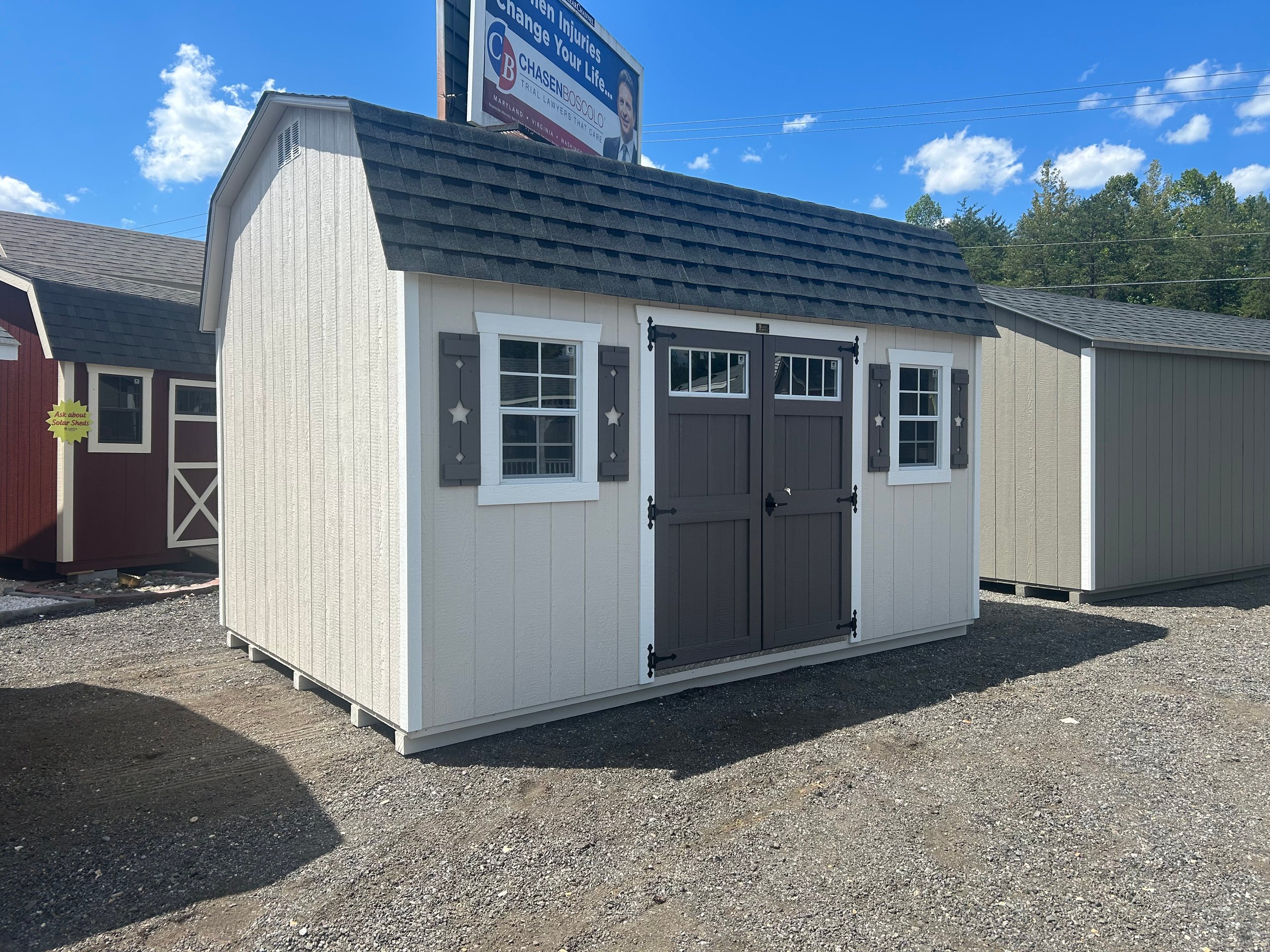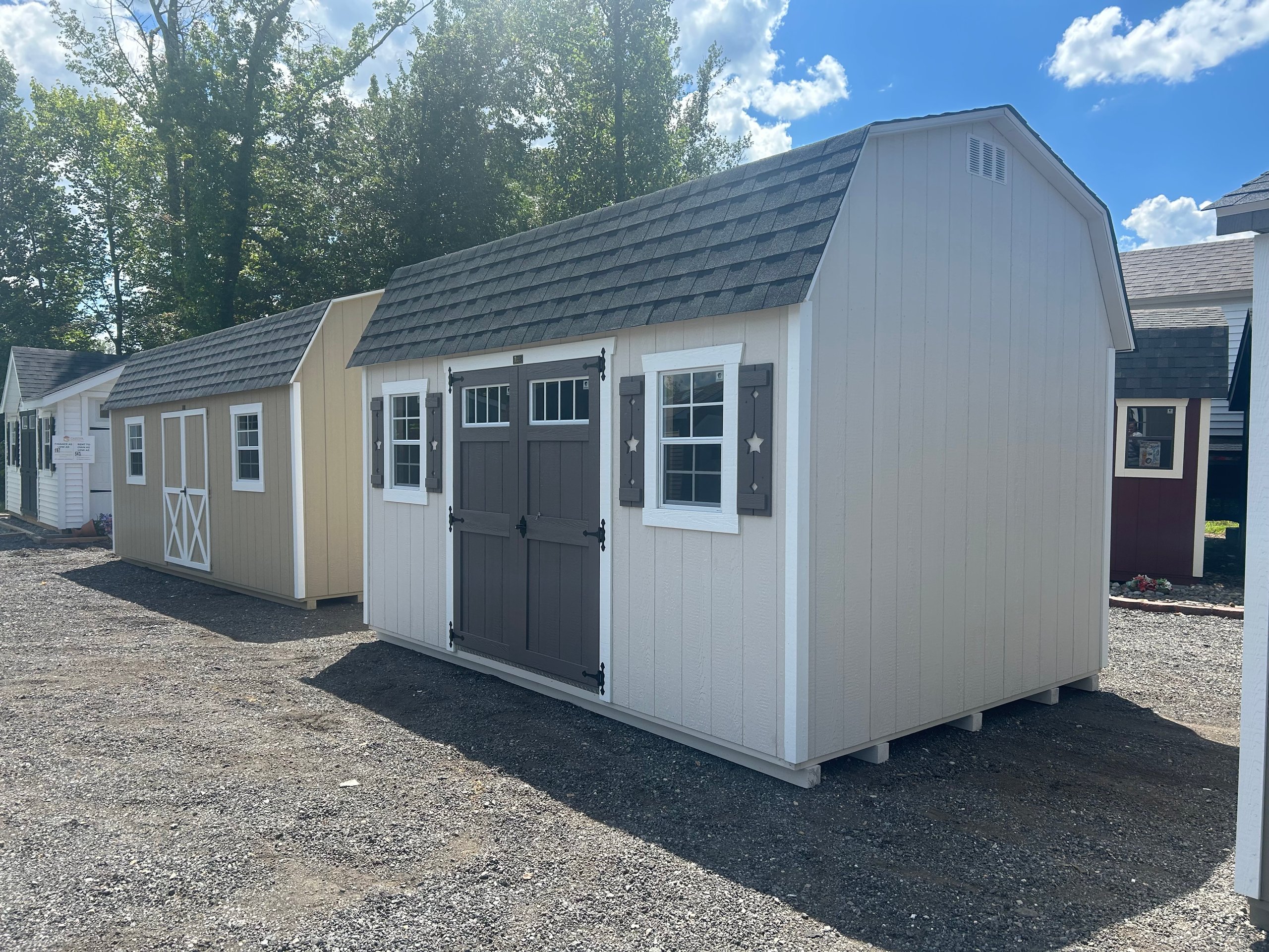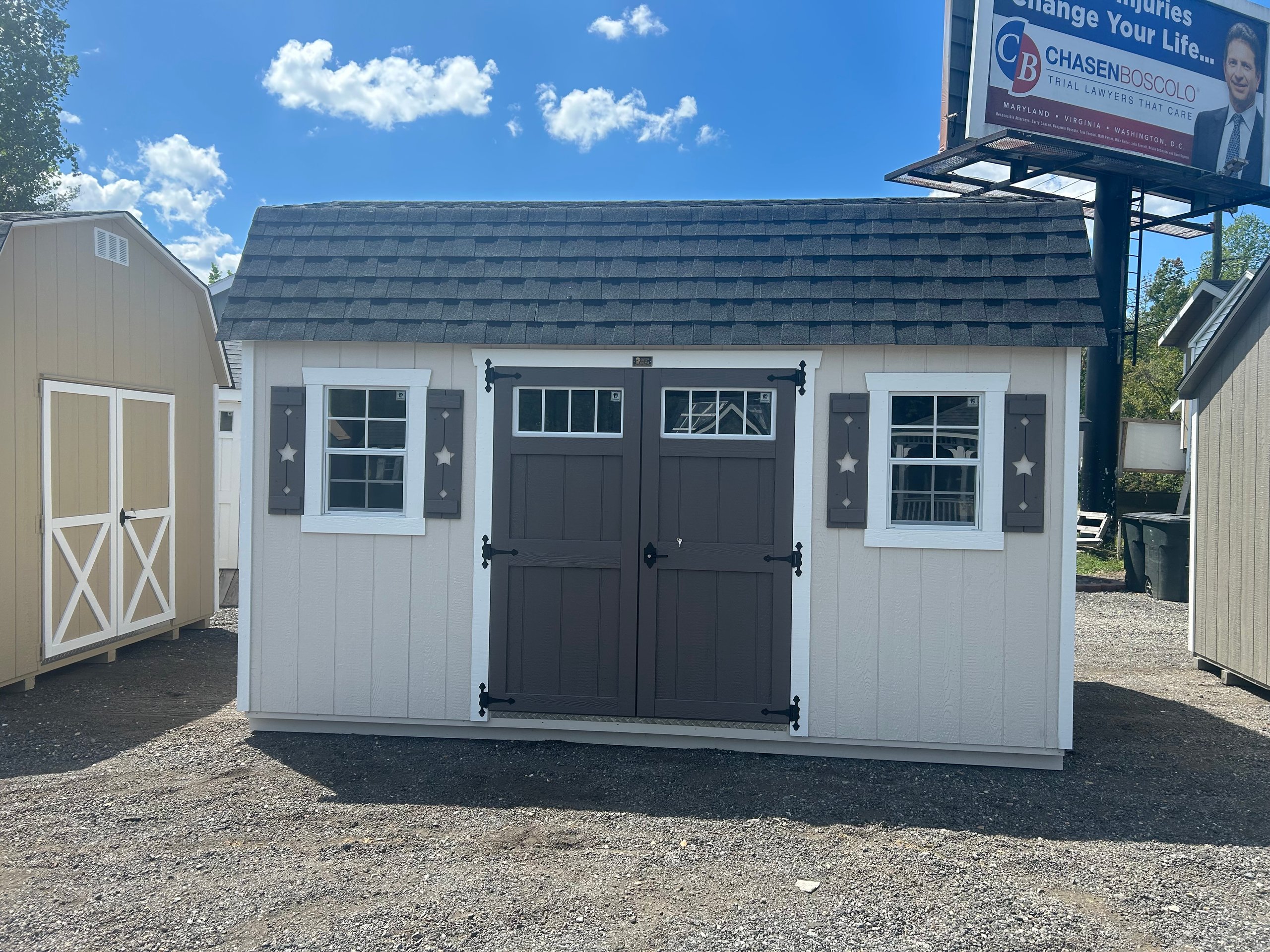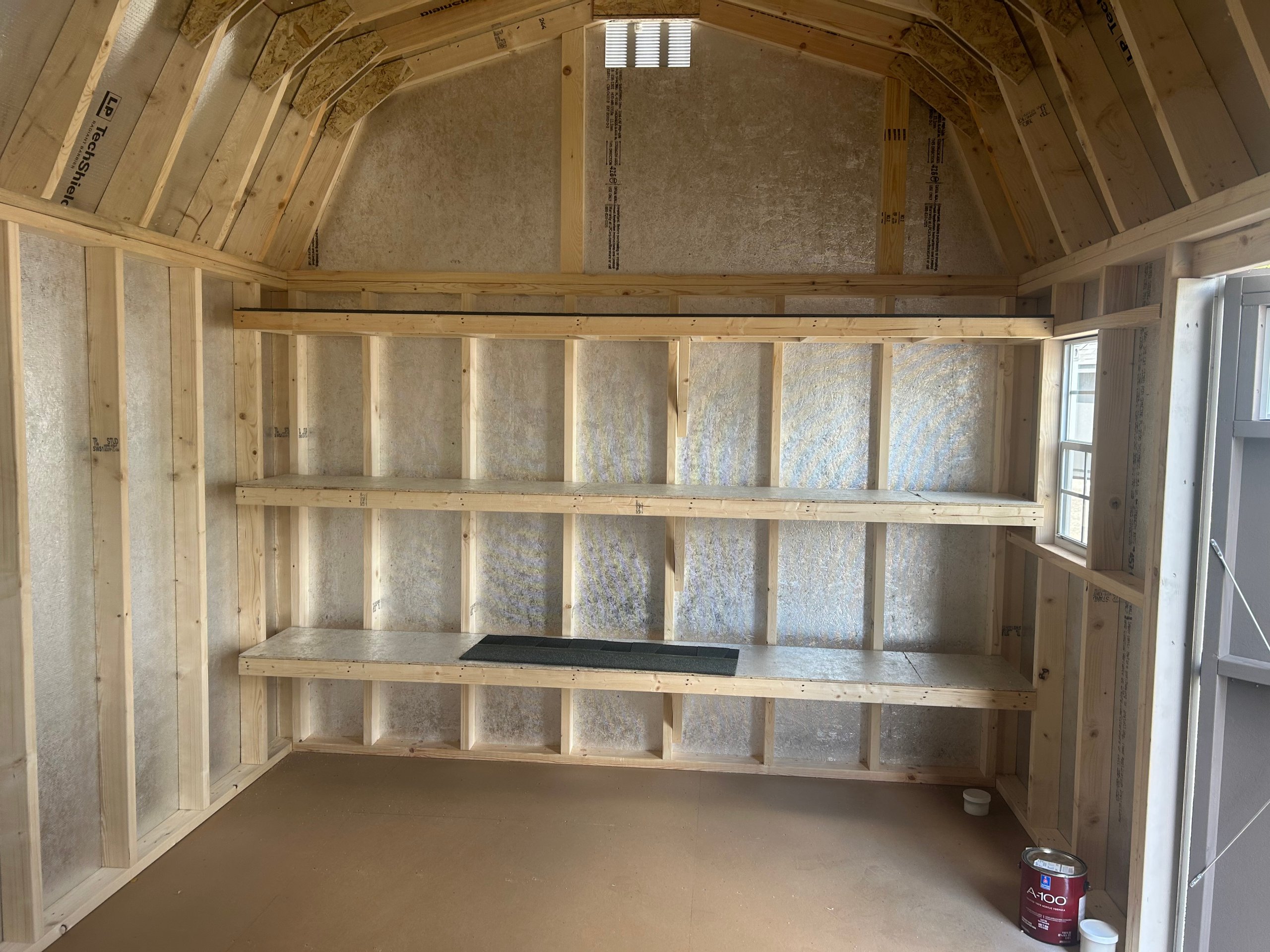 The 10×14 Colonial Dutch Barn combines distinctive style with reliable function. Finished in non-standard Sherwin Williams paint for both the main color and trim, this barn makes a bold visual statement. Garden doors with transoms elevate the front profile while allowing natural light into the space. Inside, three 10-foot-long by 16-inch-deep shelves maximize storage capacity along the walls, keeping items organized and accessible. Standard double doors ensure wide entry, while architectural shingles and LP Smart Panel siding deliver proven durability. With LP Prostruct flooring and TechShield radiant barrier, this barn balances custom aesthetics with lasting performance.