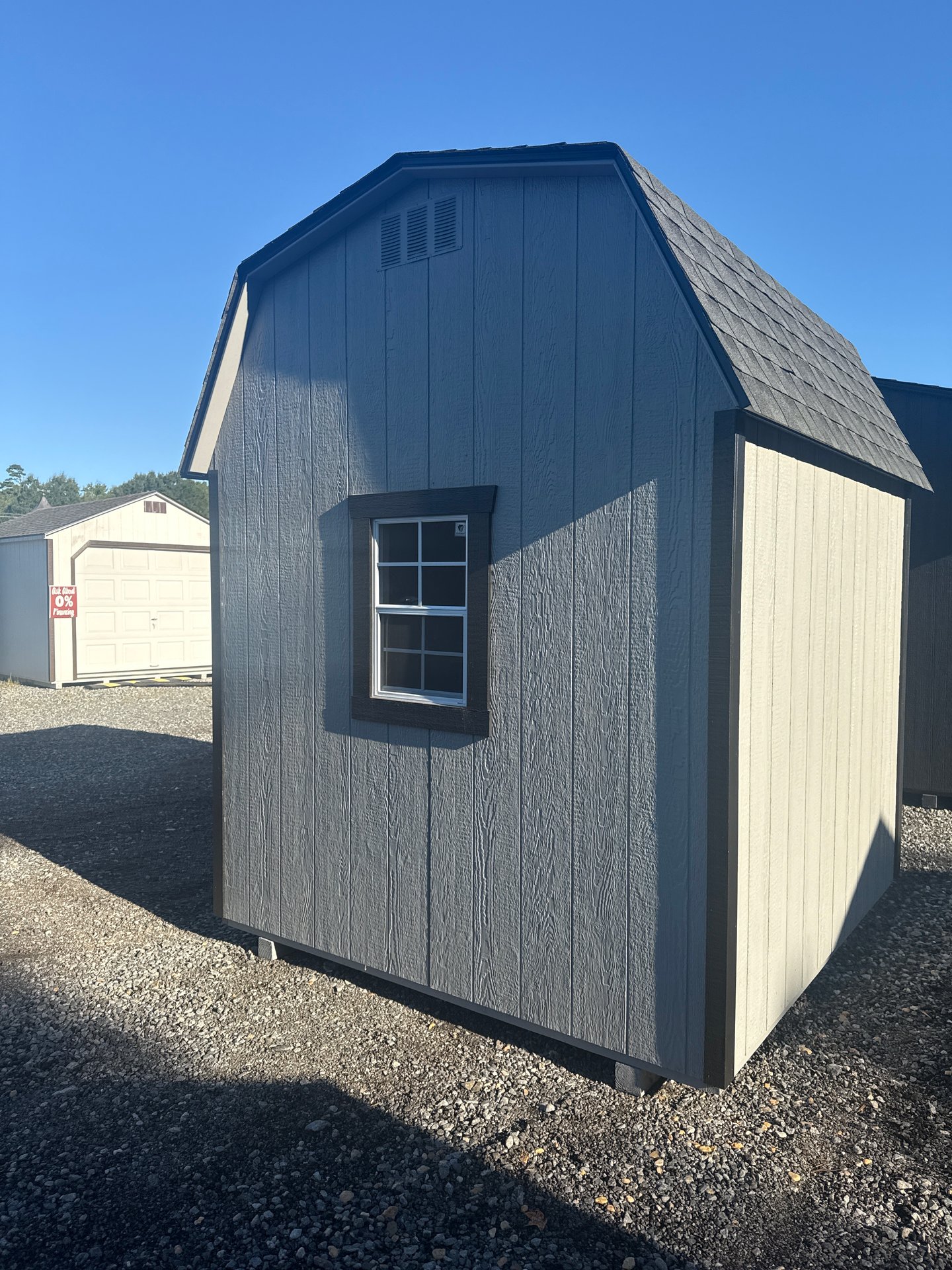 Style Name: Dutch Barn Size: 8×8 Siding: Smart Panel Main Color: Ronks Gray Trim: Black Roof Color: Charcoal Roof : Shingles Number of Windows:1 Number of Doors:2 Wall Framing: 2×4 Studs 16 inches on center Roof Framing: 2×4 rafters 16 inches on center