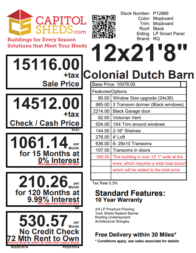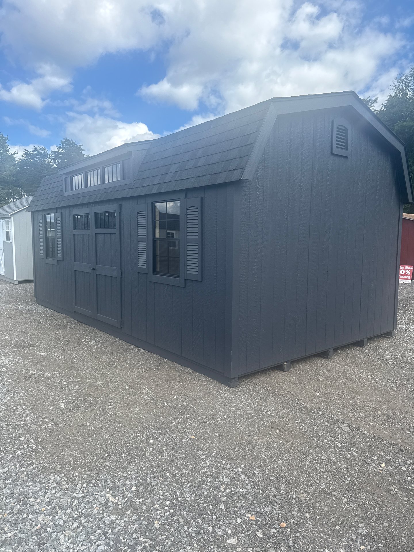 This 12×21’8″ Colonial Dutch Barn showcases timeless sophistication with its all–Mopboard Black LP Smart Panel exterior and matching trim. Featuring thirteen upgraded black windows, including 26×36 panes and six sleek 29×10 transoms, this structure offers abundant natural light and refined symmetry. The 9×7 garage door with black windows and a transom-accented double door complete the upscale design. Inside, a 4′ deep loft expands vertical storage, while two-tier 16′ shelves provide organization and workspace. Victorian end vents and a three-window transom dormer enhance both charm and ventilation. Built on durable 3/4 LP Prostruct flooring, this barn blends beauty and function effortlessly.