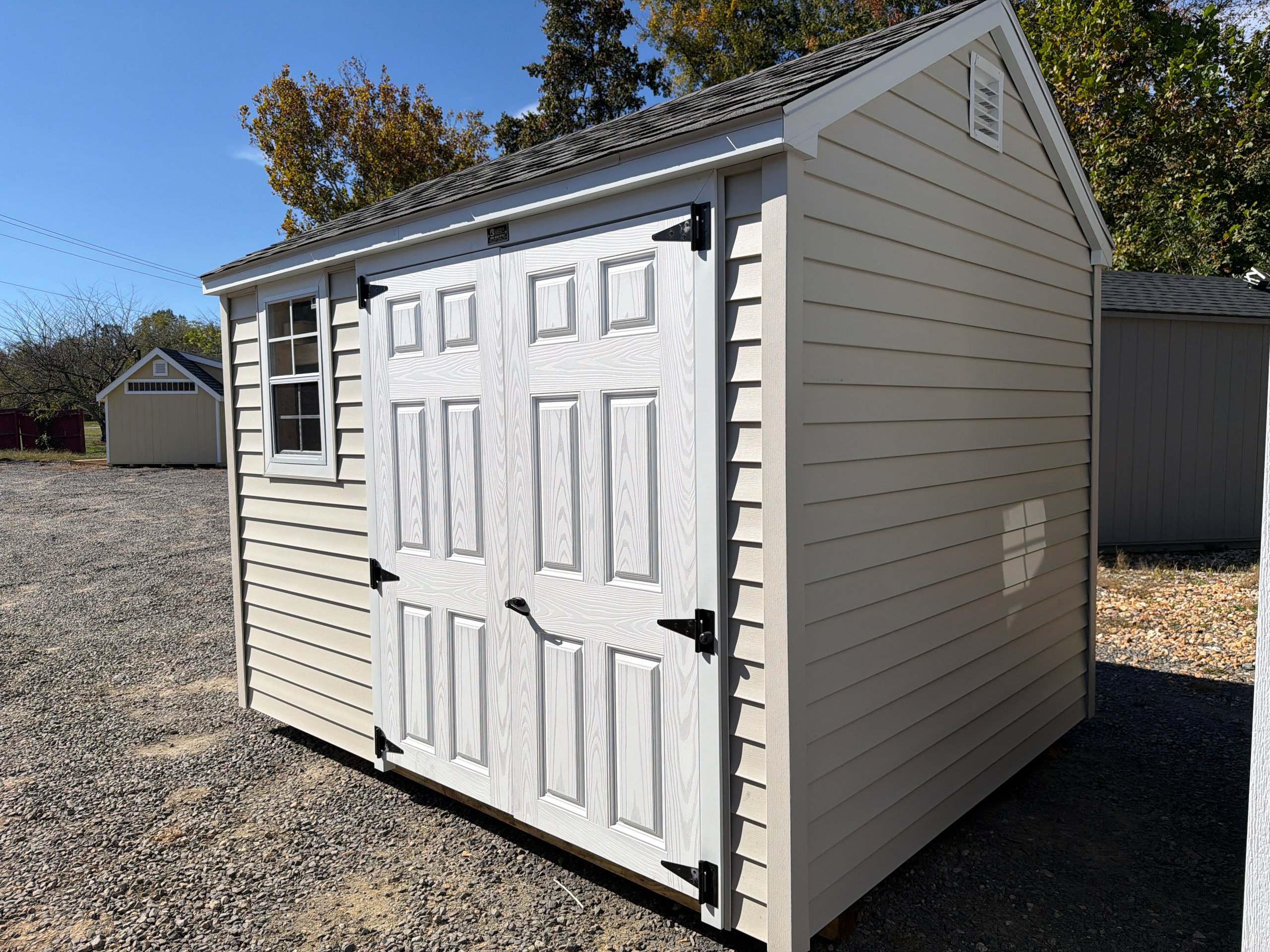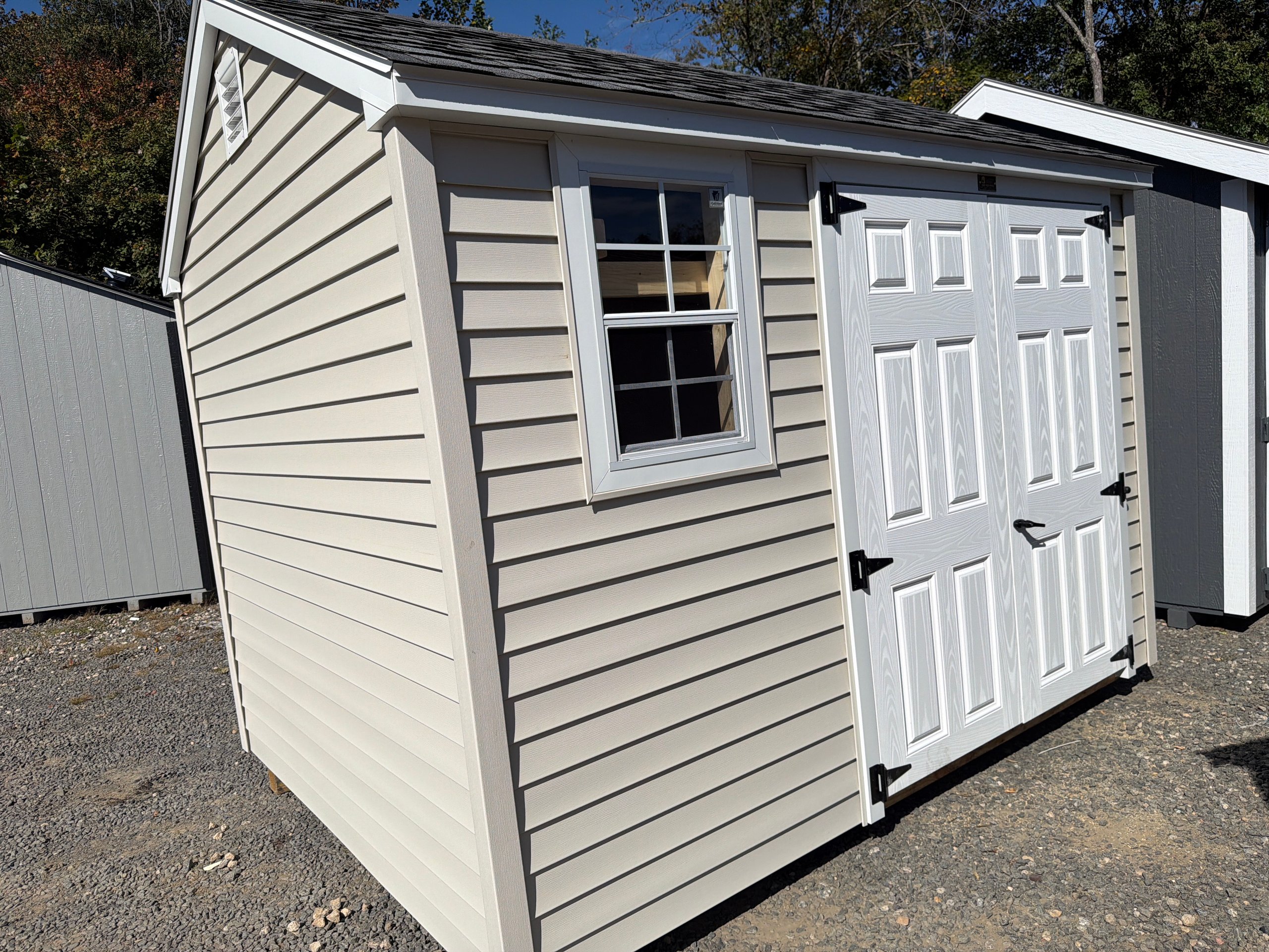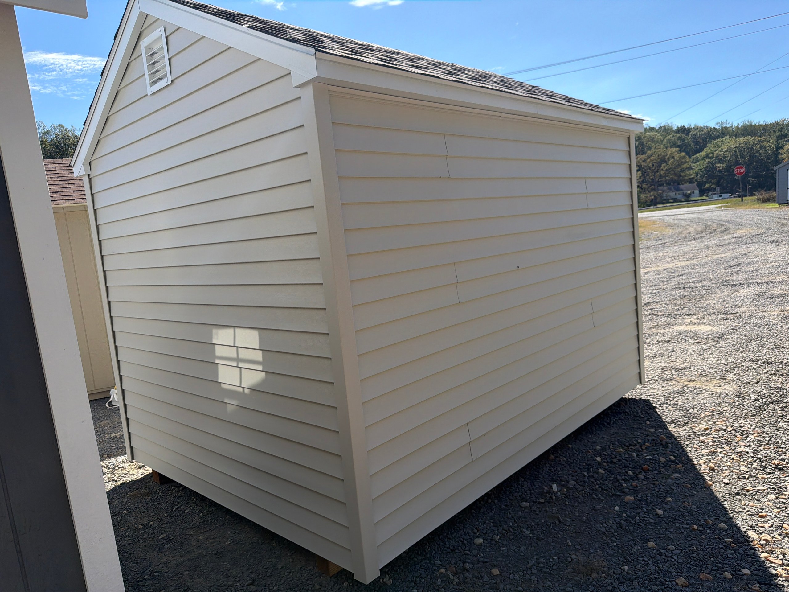 This 8×12 A-Frame shed blends classic design with durable craftsmanship. Featuring LP Smart Panel siding in Pequea Tan with Navajo trim and a Shakewood shingle roof, it brings timeless appeal to your yard. The upgraded 6′ wide double doors and extra single door provide easy access for tools, lawn equipment, or outdoor décor. Inside, three 10-foot shelves offer generous storage while deluxe garden vents promote airflow and freshness. Supported by a solid 3/4″ LP Prostruct floor, this A-Frame shed is a durable and functional addition to your property—perfect for organization, hobby space, or everyday storage.