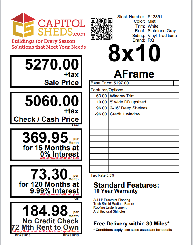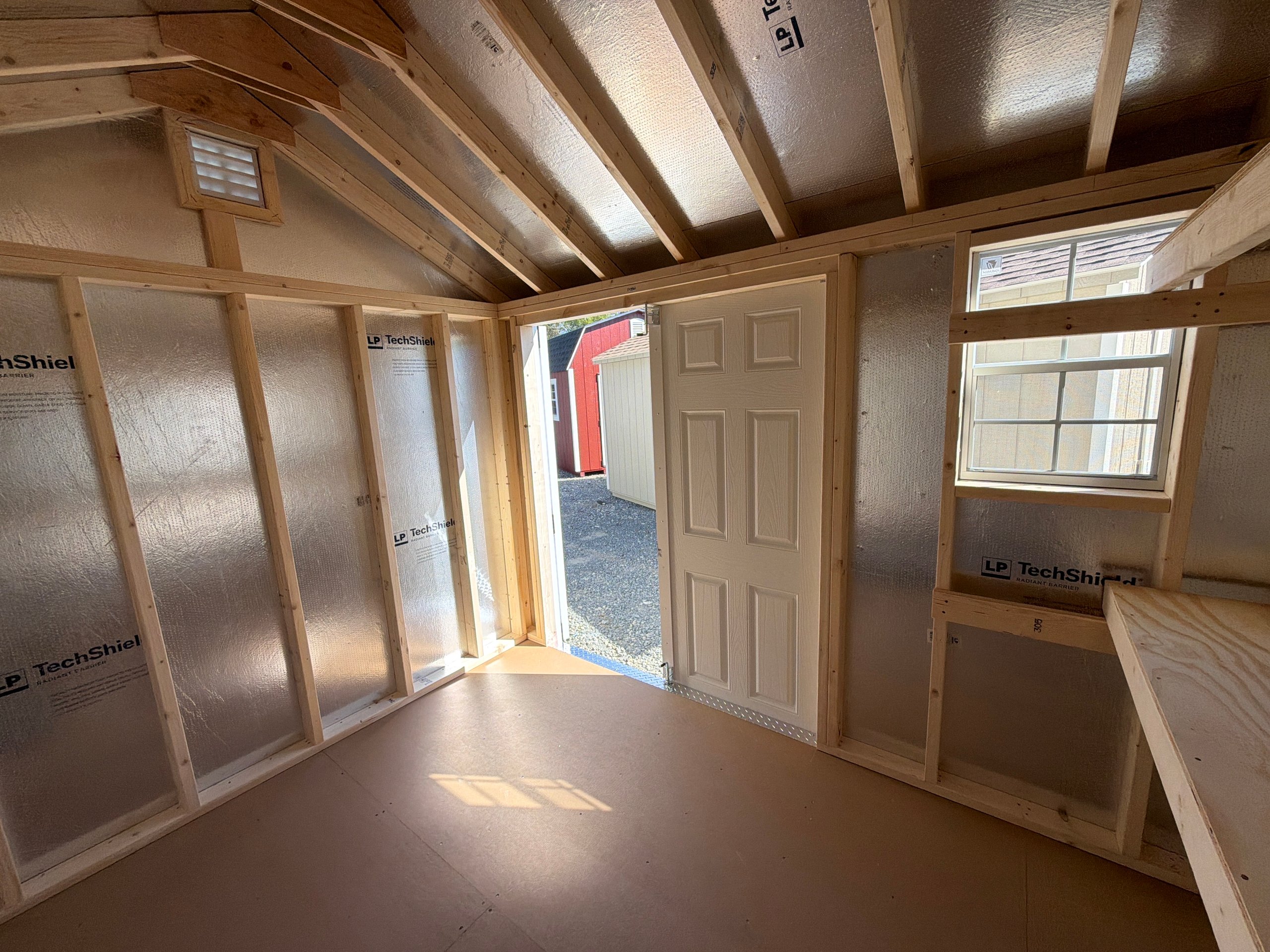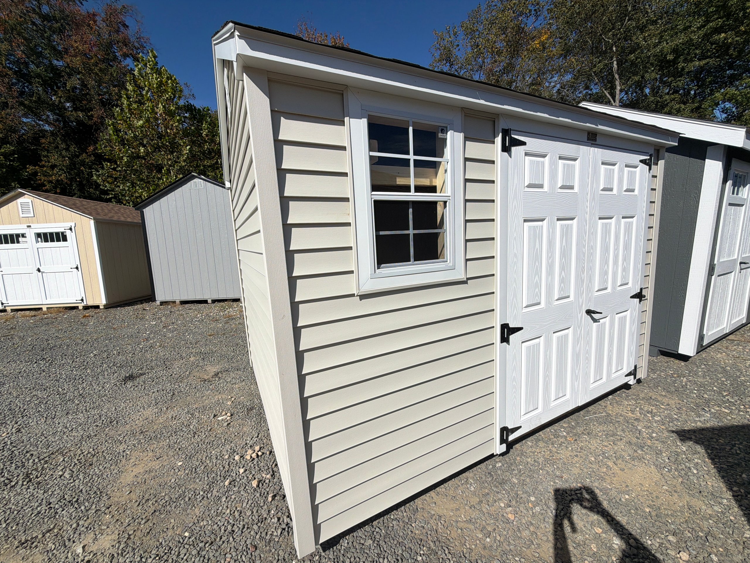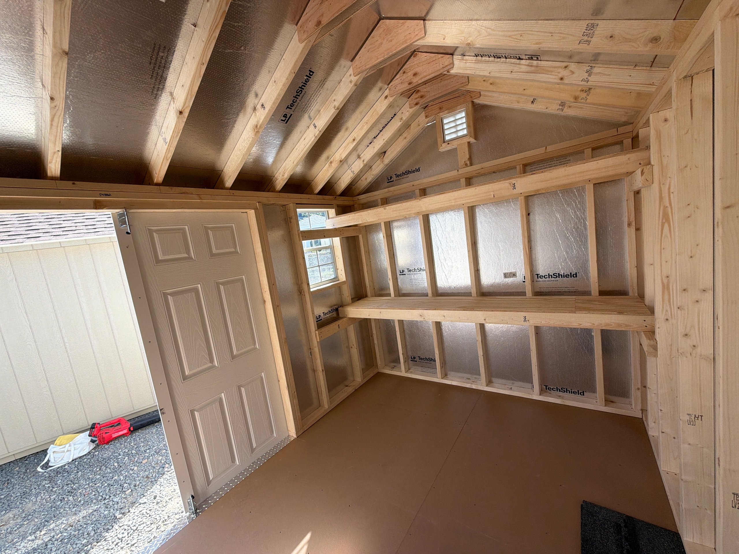 This 8×12 A-Frame shed blends classic design with durable craftsmanship. Featuring LP Smart Panel siding in Pequea Tan with Navajo trim and a Shakewood shingle roof, it brings timeless appeal to your yard. The upgraded 6′ wide double doors and extra single door provide easy access for tools, lawn equipment, or outdoor décor. Inside, three 10-foot shelves offer generous storage while deluxe garden vents promote airflow and freshness. Supported by a solid 3/4″ LP Prostruct floor, this A-Frame shed is a durable and functional addition to your property—perfect for organization, hobby space, or everyday storage.