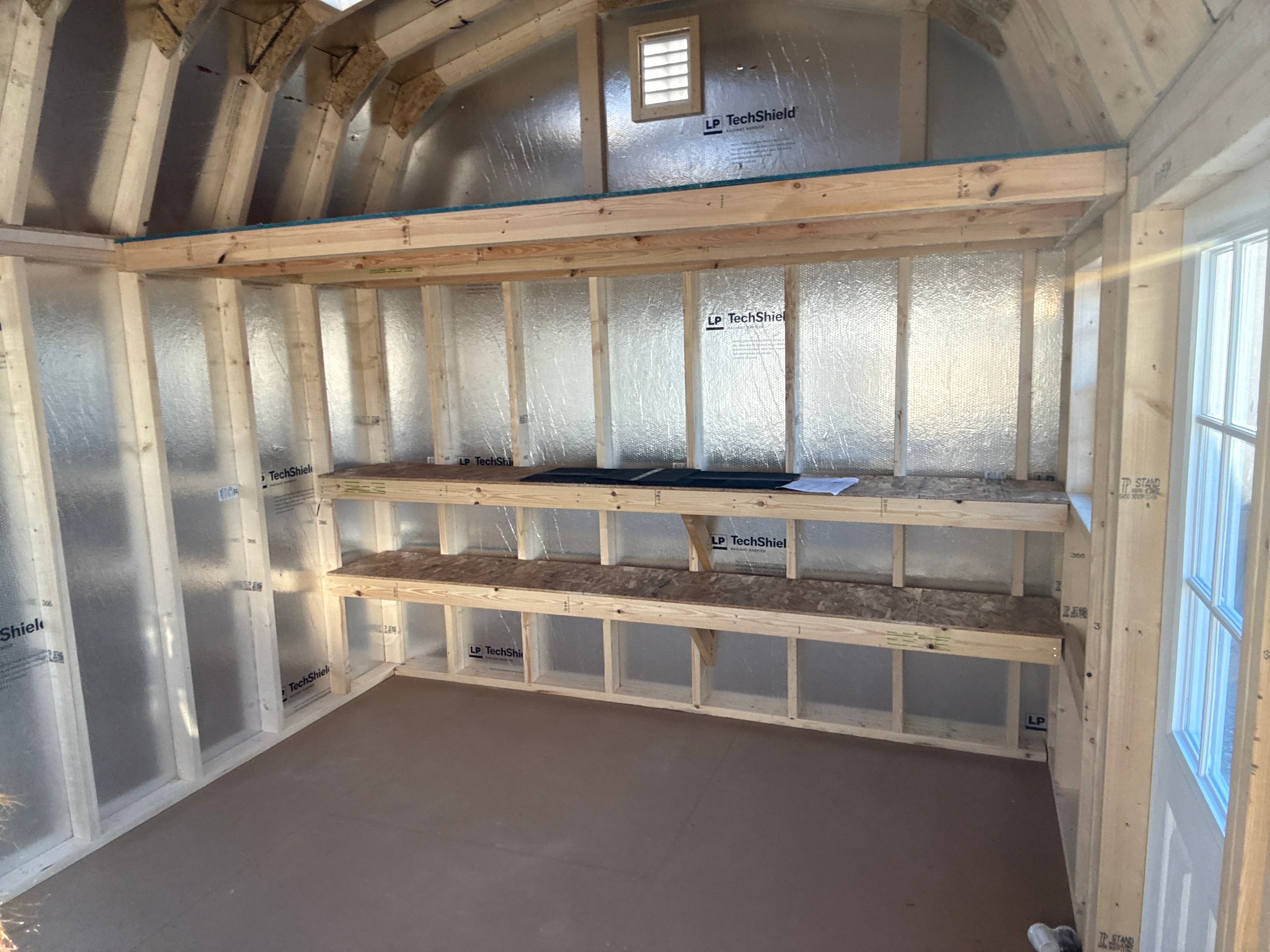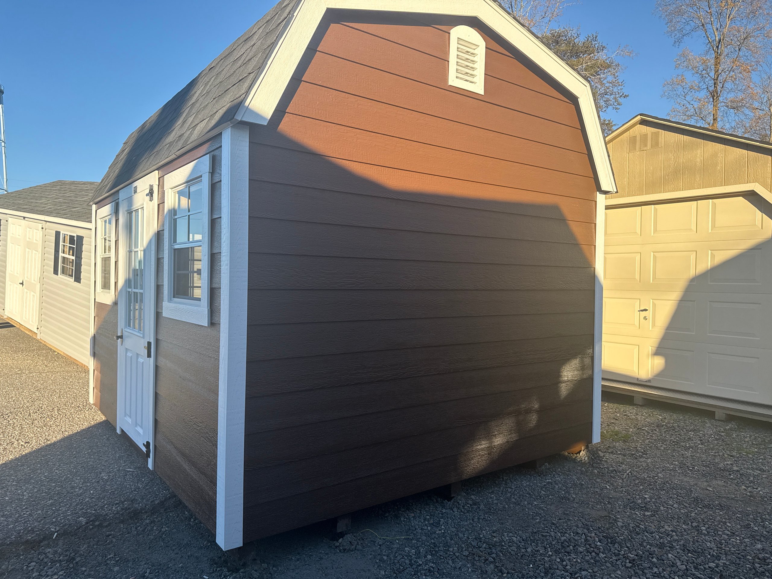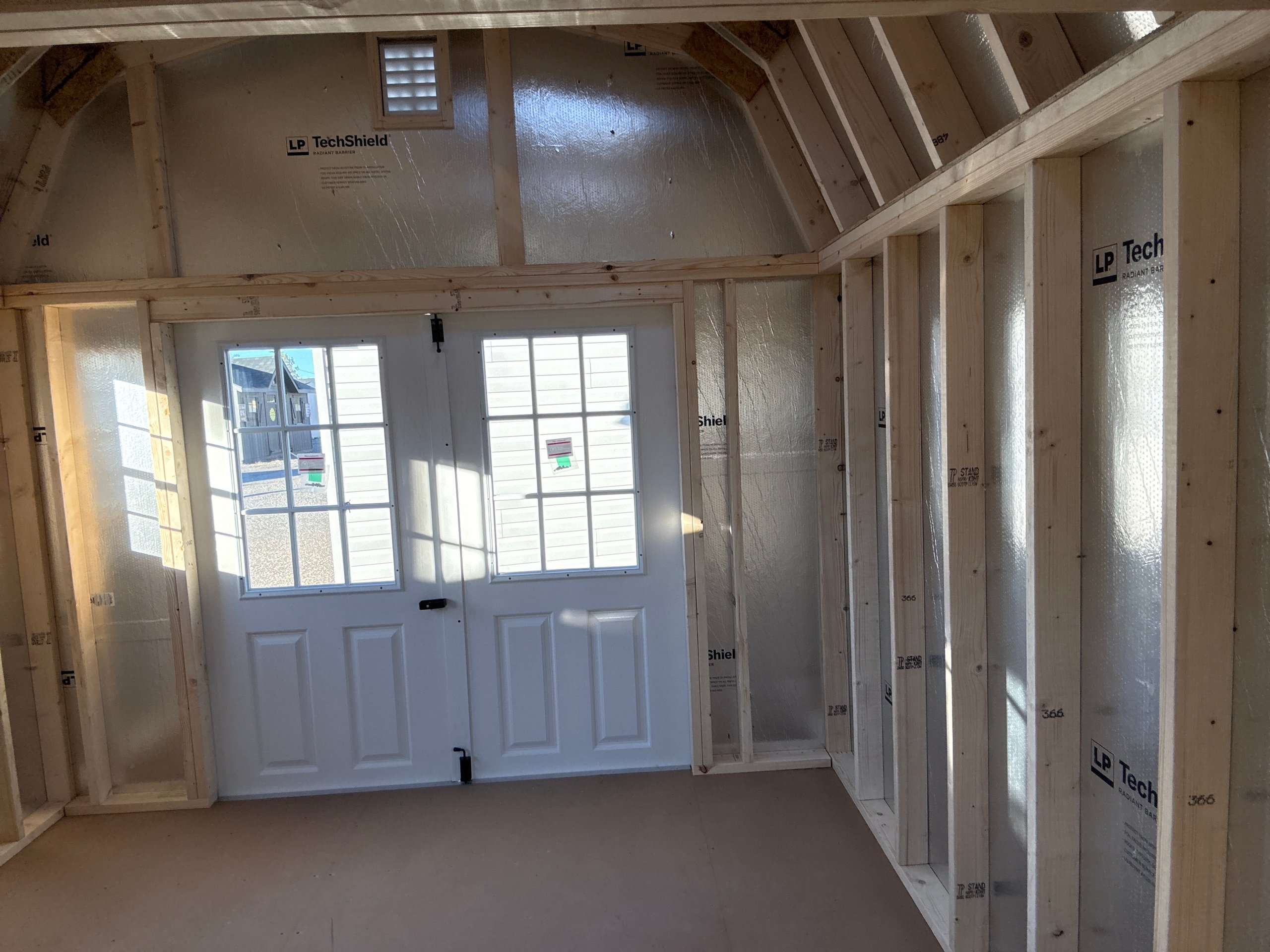This 10×12 Dutch Barn in White with White trim combines classic charm with practical design. Constructed with durable Lp Lap siding, 2×4 wall and roof framing spaced 16″ on center, LP Tech Shield roof sheeting, and LP T&G Prostruct flooring on pressure-treated 2×4 joists 12″ on center, it’s built to last. Two windows bring in natural light, while the 6ft double doors 9-lite and 3′ Single door 9-Lite provide easy access and a stylish touch. Perfect for a storage shed, workshop, or small hobby space, this Dutch Barn offers a timeless design, high-quality construction, and functional features to fit any backyard or property.