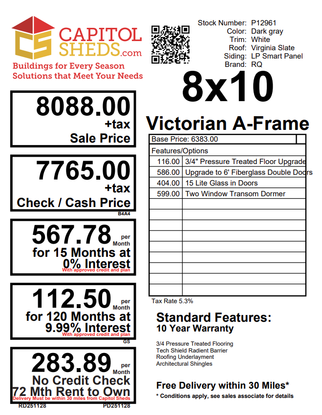 Elevate your backyard with the Victorian A-Frame 8×10 shed, blending timeless style with premium craftsmanship. Featuring LP Smart Panel siding in dark gray with crisp white trim, this shed is both durable and visually striking. The Virginia Slate dimensional shingle roof, enhanced with roof felt and LP Tech Shield sheeting, ensures long-lasting protection. Inside, 2×4 stud walls, pressure-treated flooring, and 2×4 joists provide a solid, reliable foundation. Enjoy upgraded features like a 6′ fiberglass double door with 15-lite glass, two window transom dormers, and a 3/4″ pressure-treated floor. Functional, elegant, and built to last, it’s the perfect backyard addition.