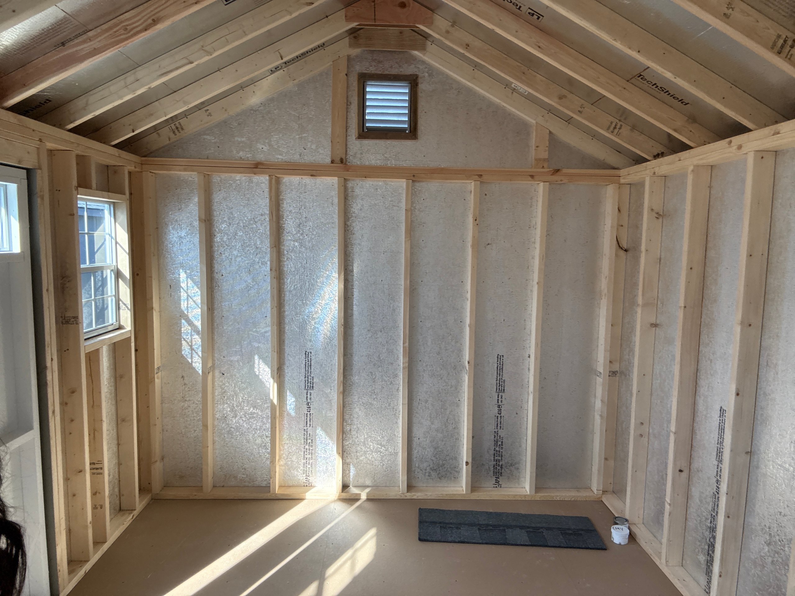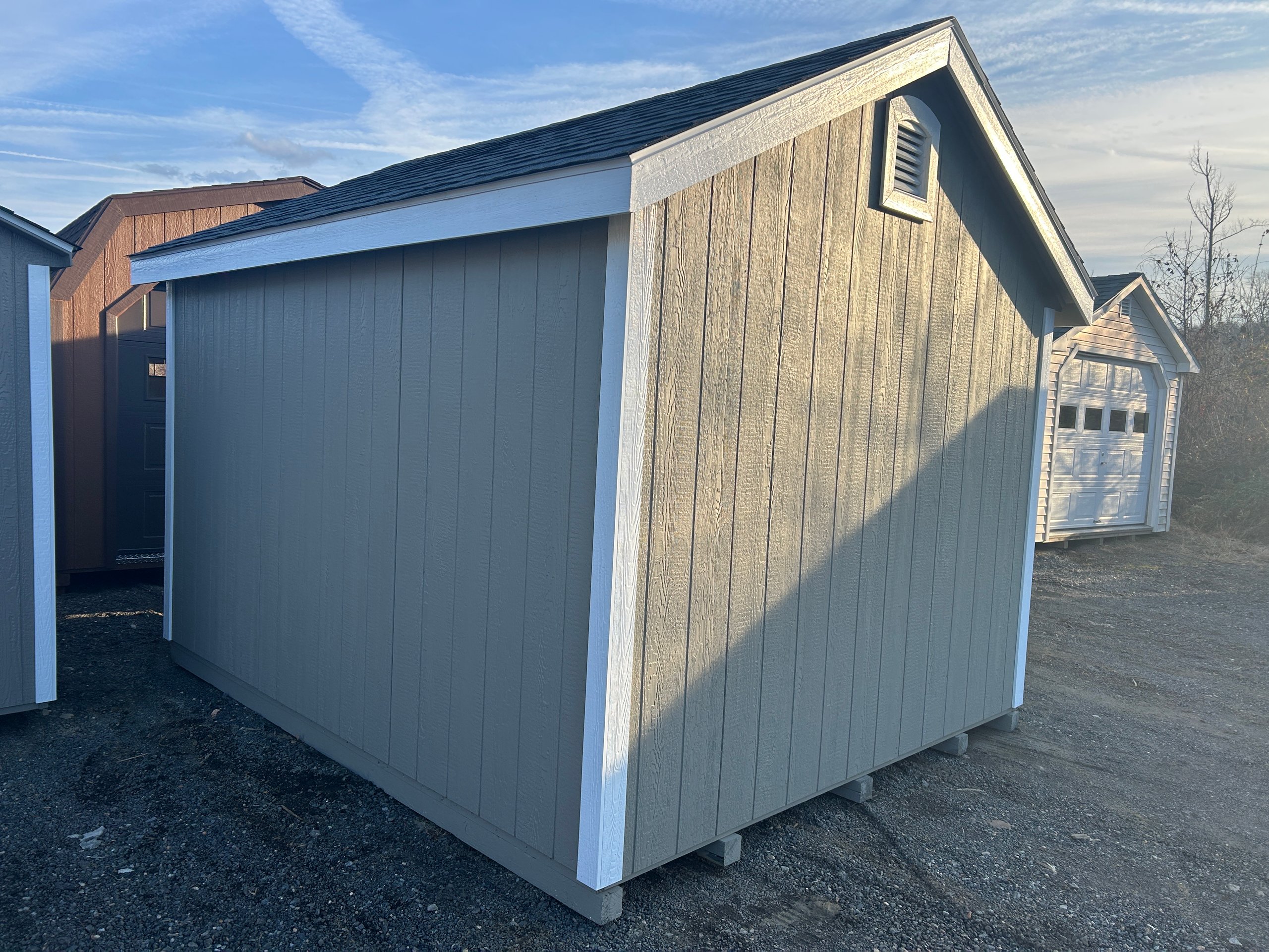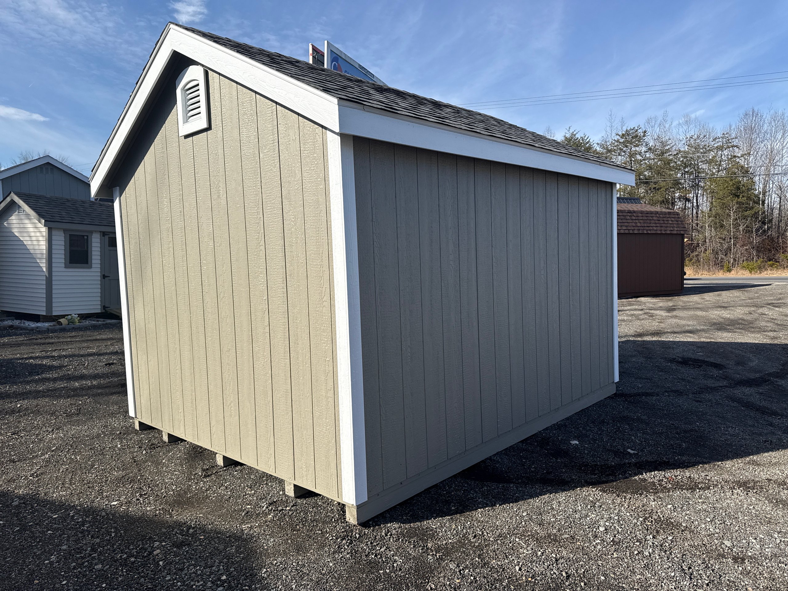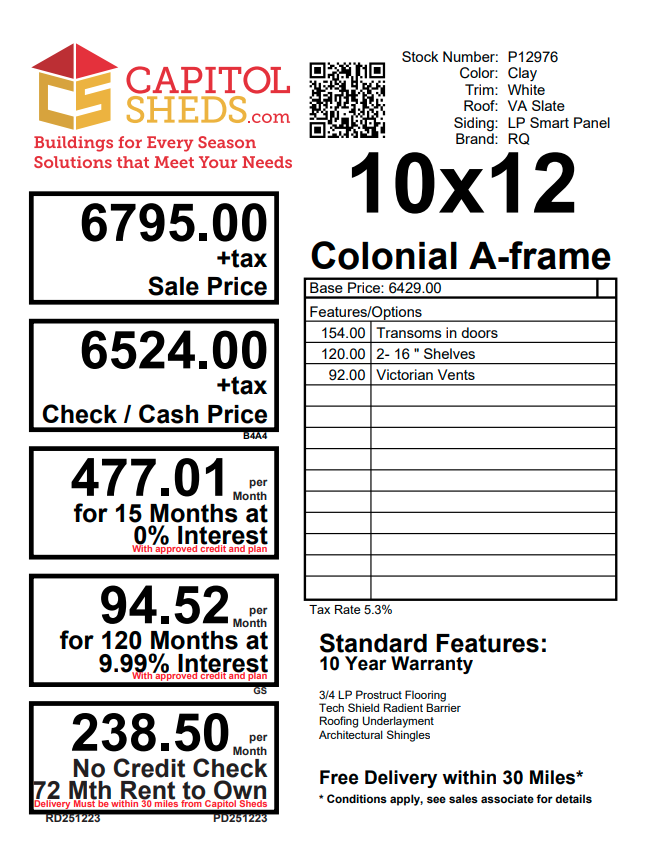 The 10×12 Colonial A-Frame offers a refined balance of durability, efficiency, and classic style. Constructed with LP SmartPanel siding in a warm Clay finish, accented by crisp White trim and a Virginia Slate architectural shingle roof, this building delivers strong curb appeal. It features 2×4 wall and roof framing spaced 16 inches on center, LP Tech Shield roof sheeting, and LP ProStruct flooring supported by pressure-treated joists at 12 inches on center. Included upgrades such as transom windows in the doors, two 16-inch shelves, and Victorian vents enhance ventilation, organization, and overall functionality—making this A-frame ideal for storage or light workspace needs.