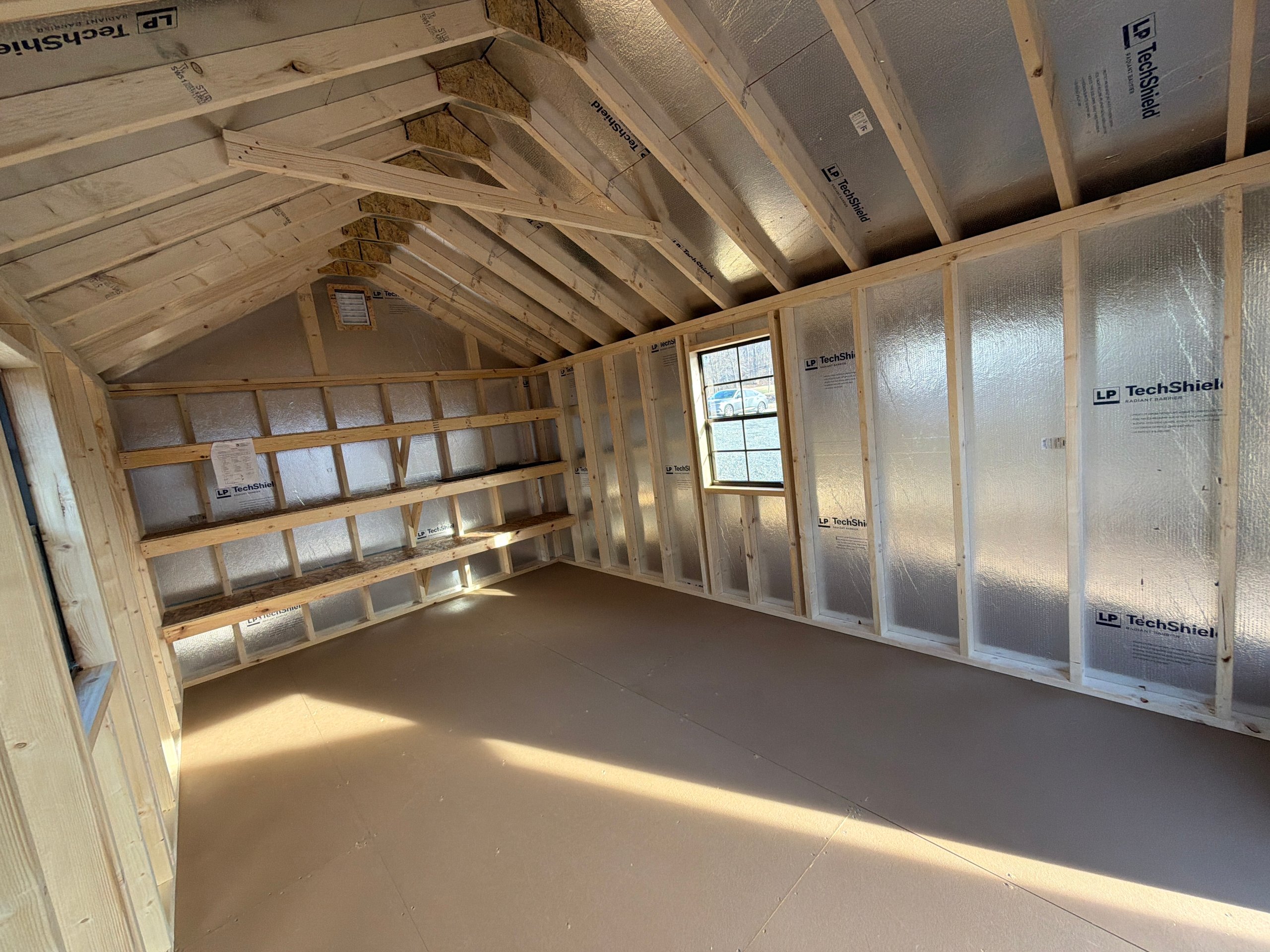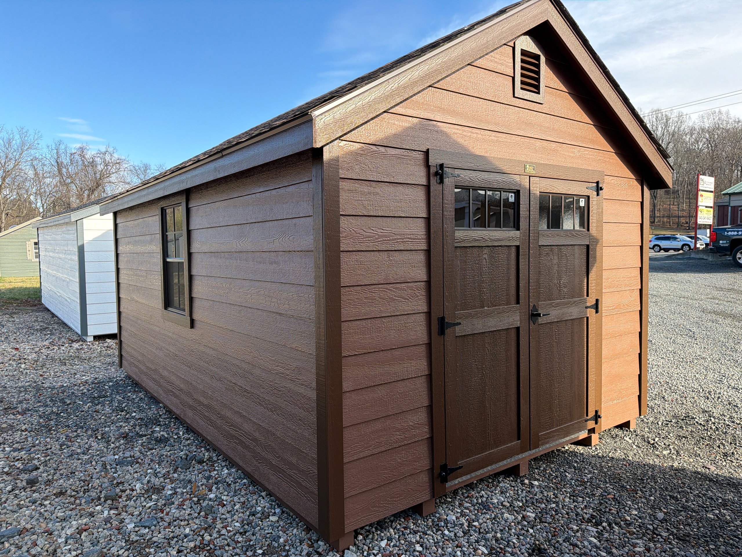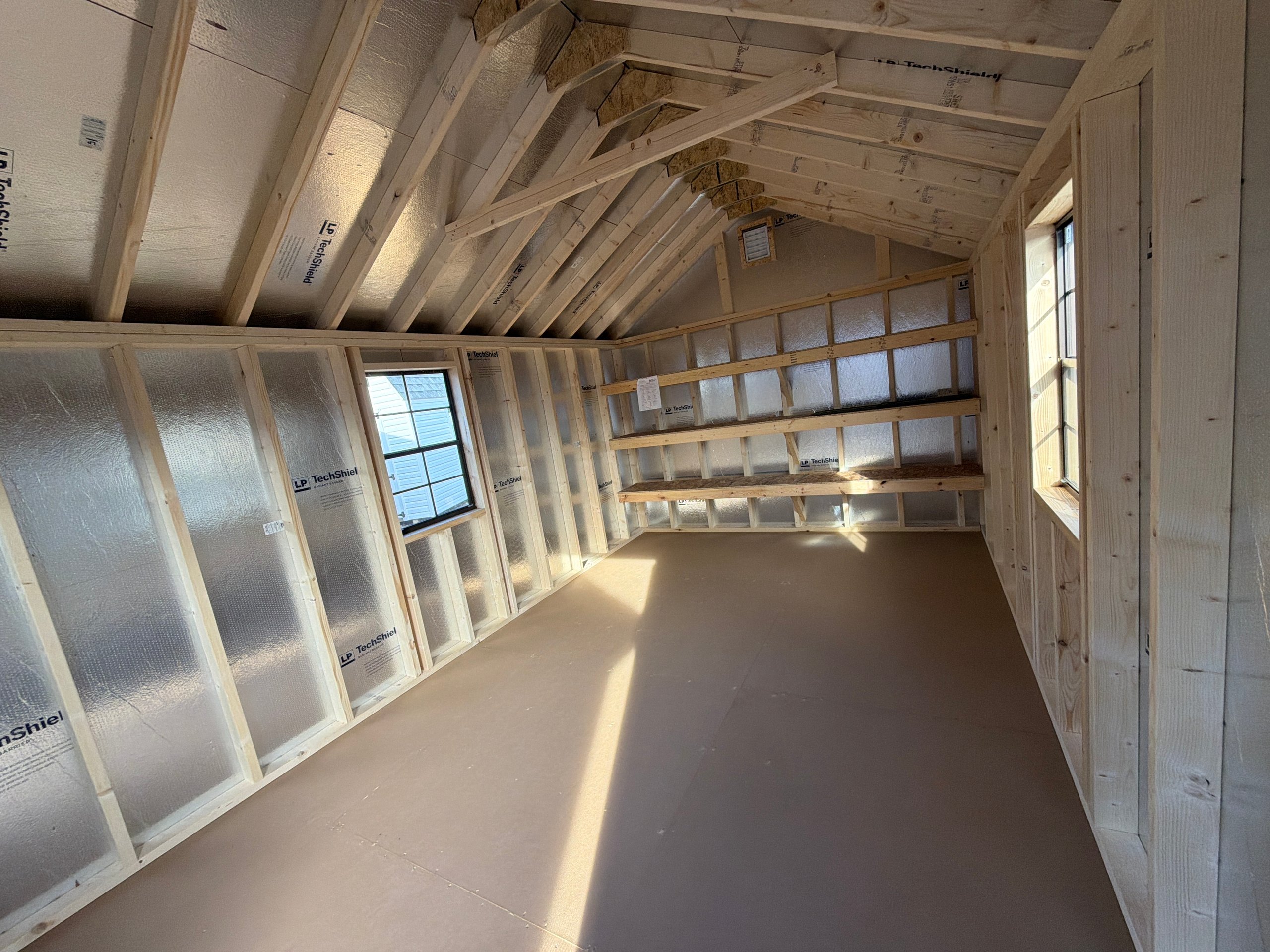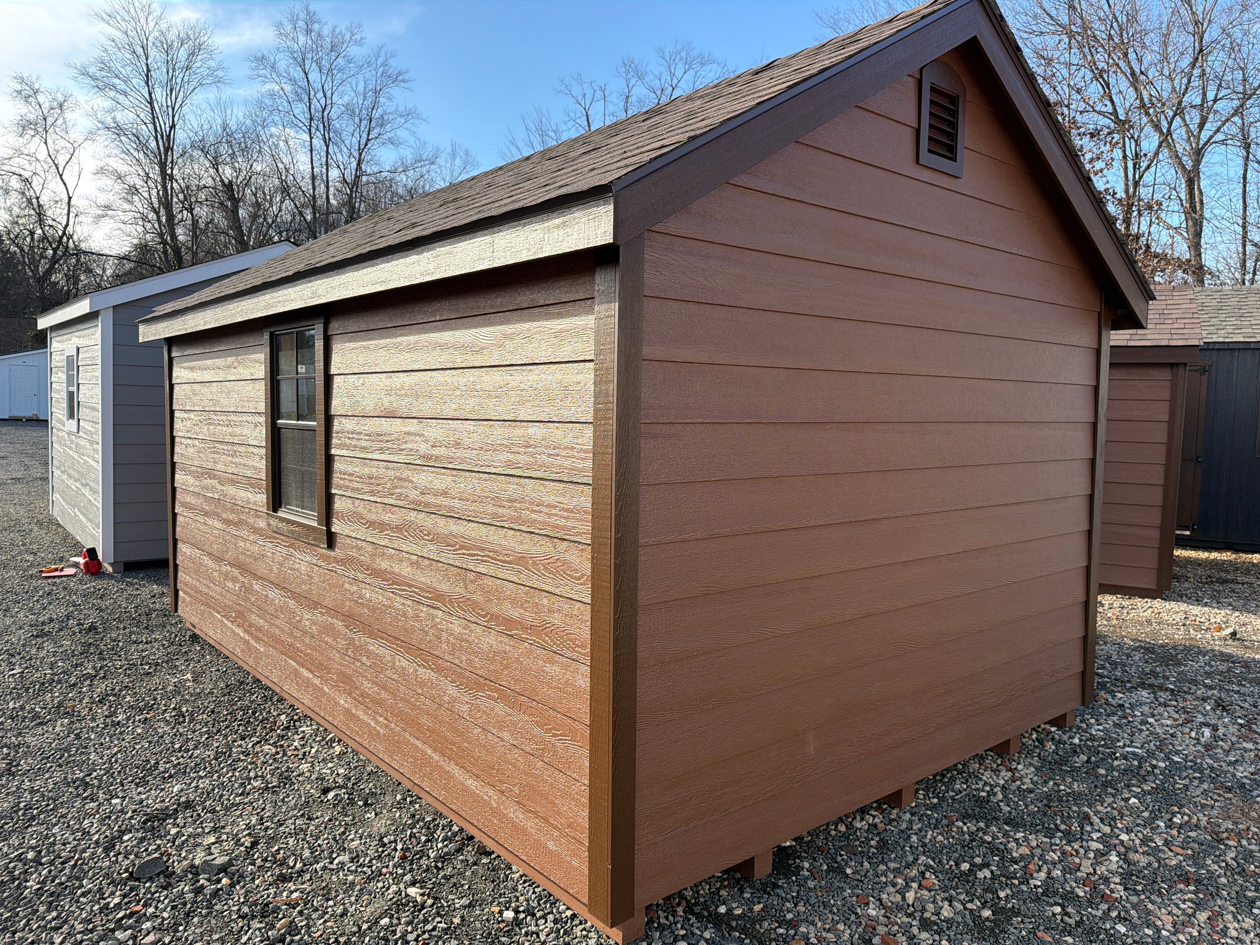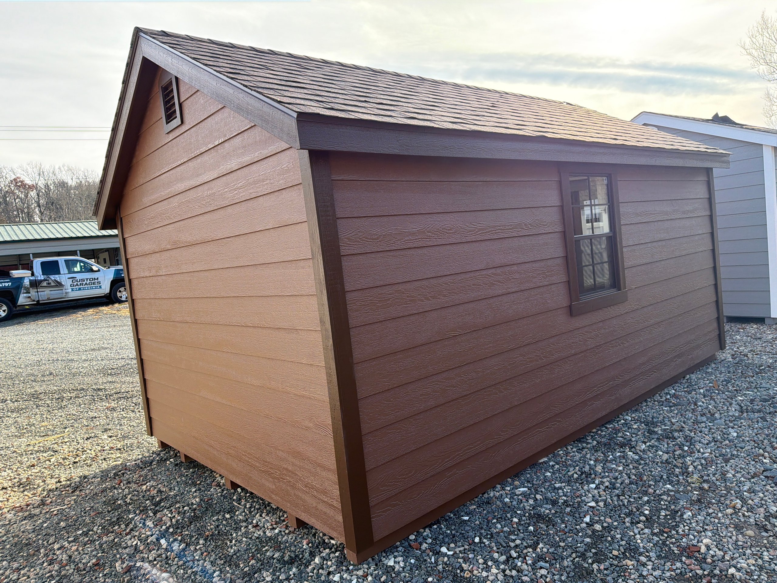 This 10×16 Cape shed offers a warm, classic look with Chestnut LP Smart Lap siding paired with Brown trim and a Hickory architectural shingle roof. Built with dependable 2×4 wall and roof framing spaced 16″ on center, LP Tech Shield roof sheeting, and sturdy LP T&G Prostruct flooring over pressure-treated 2×4 joists 12″ on center, it’s made for long-lasting performance. Two large 24×36 windows brighten the interior, while added garden vents support airflow. Inside, the 10ft shelves (16″ deep) provide convenient built-in storage. This Cape-style shed blends charm, functionality, and high-quality construction for an ideal backyard workspace or storage solutio