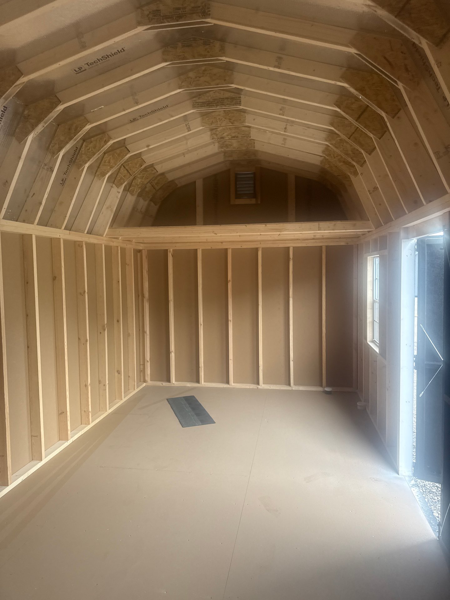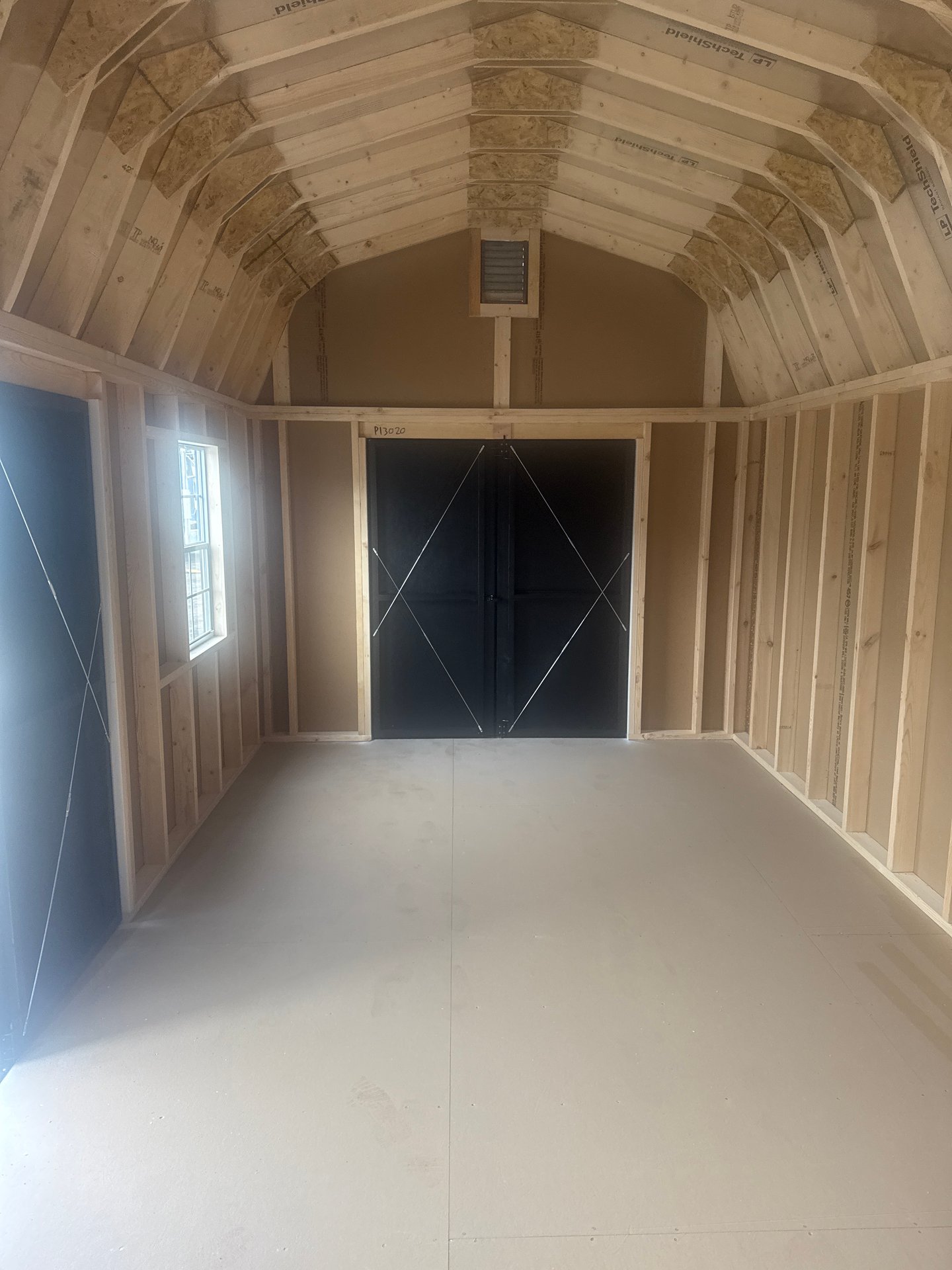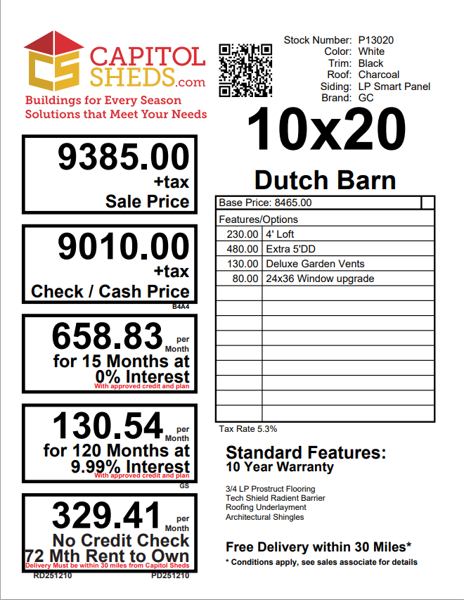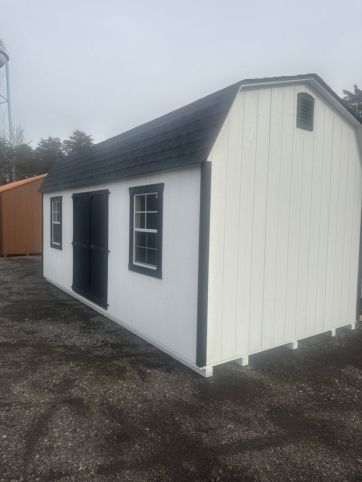 This Amish-built 10×20 Dutch Barn shed offers generous space with classic character and upgraded functionality. Finished in WhiteLP Smart Panel siding with Black trim and a Charcoal shingle roof, it creates a bold, eye-catching look. The gambrel roof design provides extra overhead storage, enhanced by the included 4′ loft. Built with durable 2×4 wall and roof framing, LP Tech Shield roof sheeting, and roof felt underlayment, it’s made for long-term performance. LP ProStruct flooring over pressure-treated joists spaced 8″ on center ensures exceptional strength. Upgrades include 24×36 windows for natural light, a 5′ door, and an additional 5′ double door for convenient access.