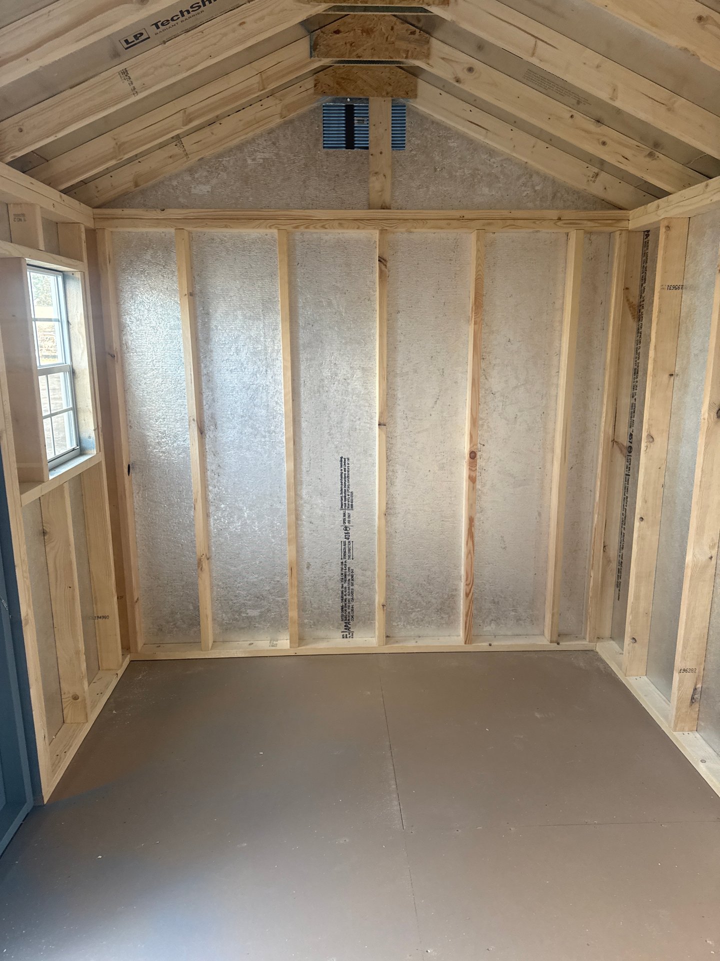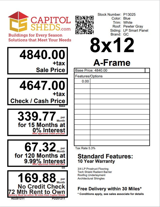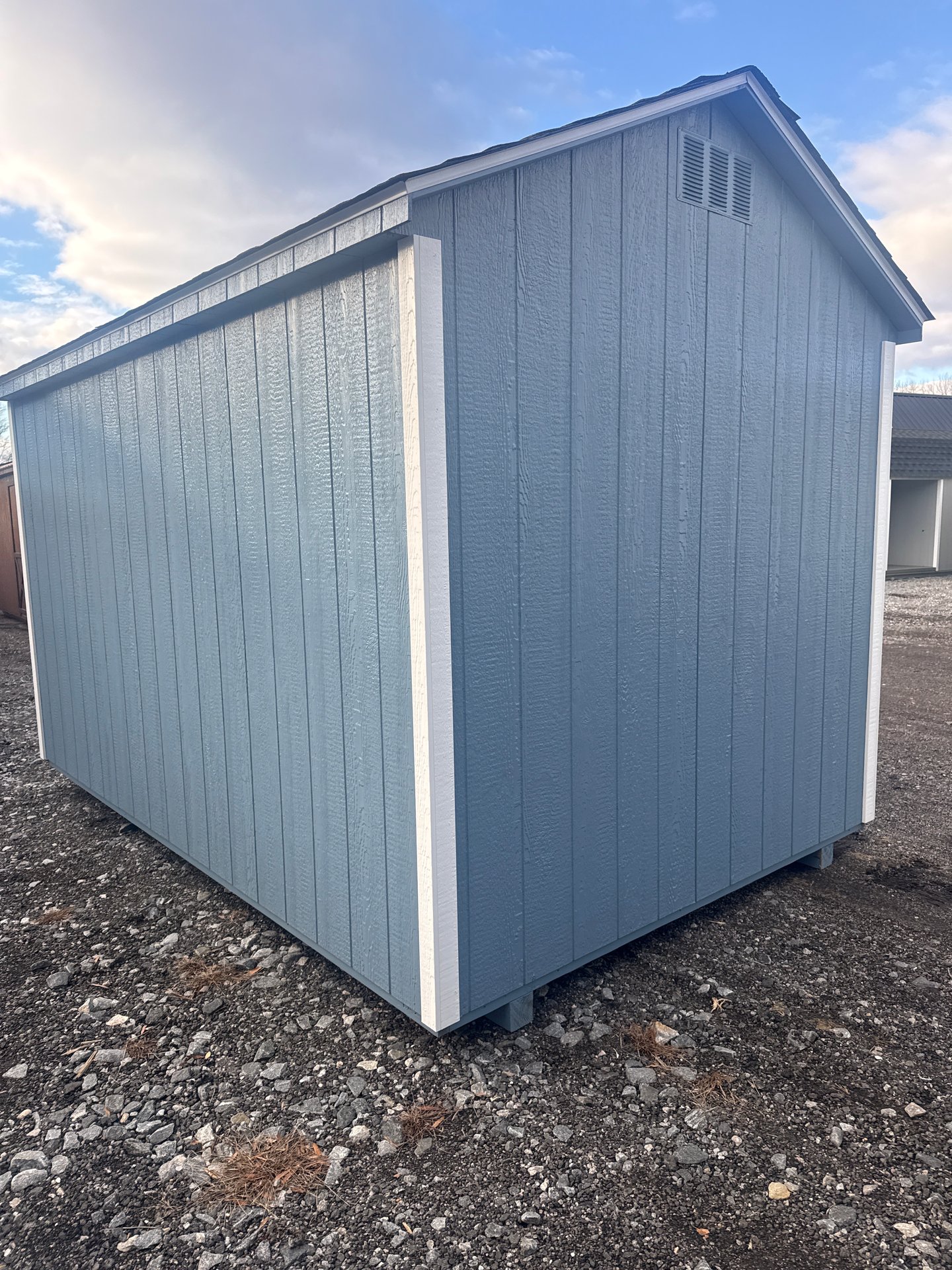 The 8×12 A-Frame offers compact versatility with classic style and dependable construction. Finished in rich Blue LP SmartPanel siding with Silverbacker, accented by White trim and a Pewter Gray architectural shingle roof, it’s both elegant and durable. Built with 2×4 framing and rafters 16″ on center, LP Tech Shield roof sheeting, and LP ProStruct flooring supported by pressure-treated joists 12″ on center, this structure ensures lasting performance. With two windows and two doors for light and accessibility, the A-Frame is a refined, space-efficient choice for secure storage or a stylish backyard feature.