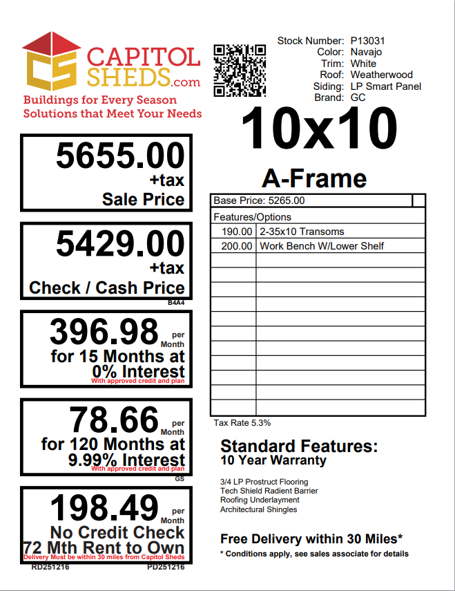 This 10×10 A-Frame in Navajo with White trim combines classic charm with practical design. Constructed with durable Smart Panel siding, 2×4 wall and roof framing spaced 16″ on center, LP Tech Shield roof sheeting, and LP T&G Prostruct flooring on pressure-treated 2×4 joists 12″ on center, it’s built to last. Two windows bring in natural light, while the 5ft double doors to provide easy access and a stylish touch. Perfect for a storage shed, workshop, or small hobby space, this A-Frame offers a timeless design, high-quality construction, and functional features to fit any backyard or property.