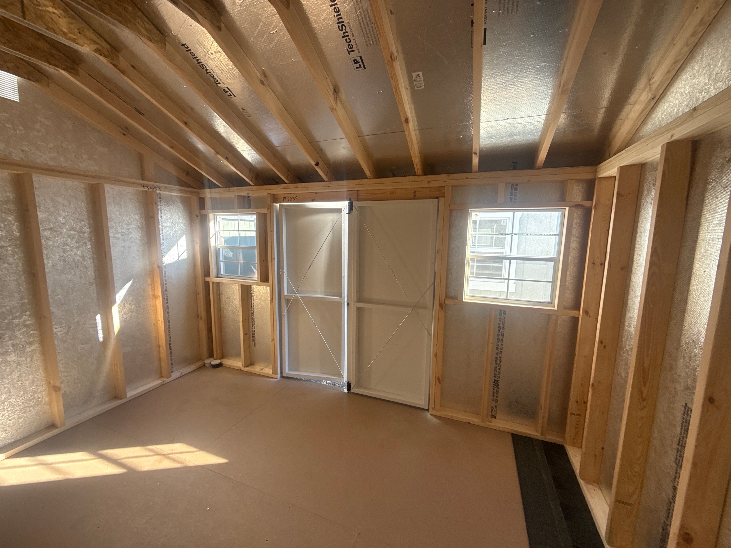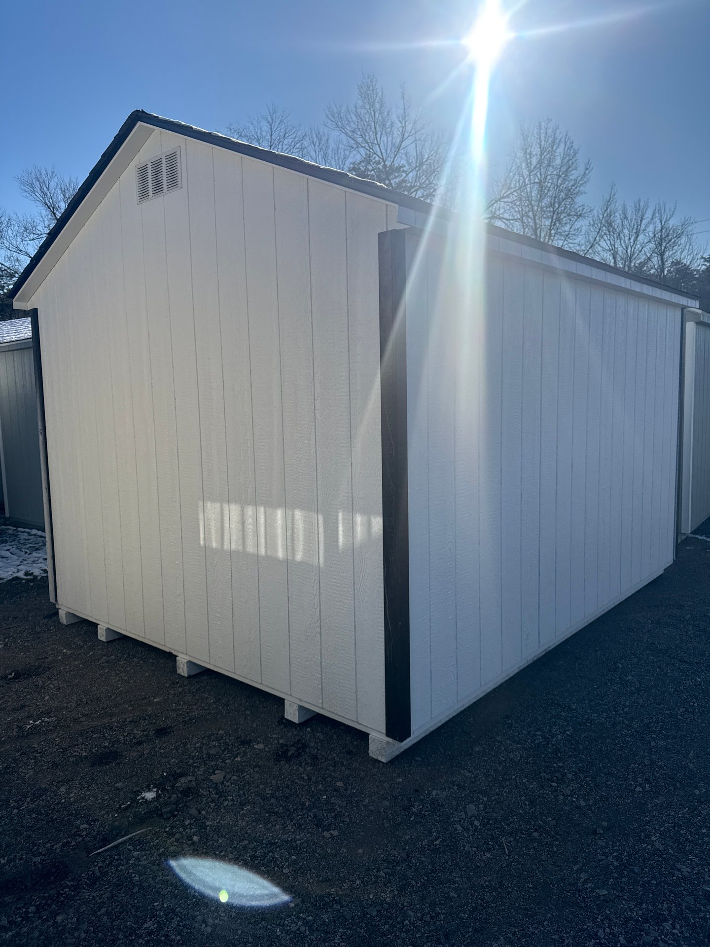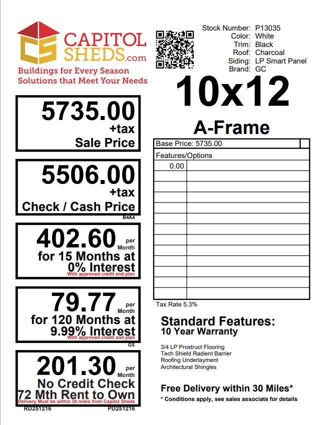 This 10×12 A-Frame in White with Black trim combines classic charm with practical design. Constructed with durable Smart Panel siding, 2×4 wall and roof framing spaced 16″ on center, LP Tech Shield roof sheeting, and LP T&G Prostruct flooring on pressure-treated 2×4 joists 12″ on center, it’s built to last. Two windows bring in natural light, while the 5ft double doors to provide easy access and a stylish touch. Perfect for a storage shed, workshop, or small hobby space, this A-Frame offers a timeless design, high-quality construction, and functional features to fit any backyard or property.