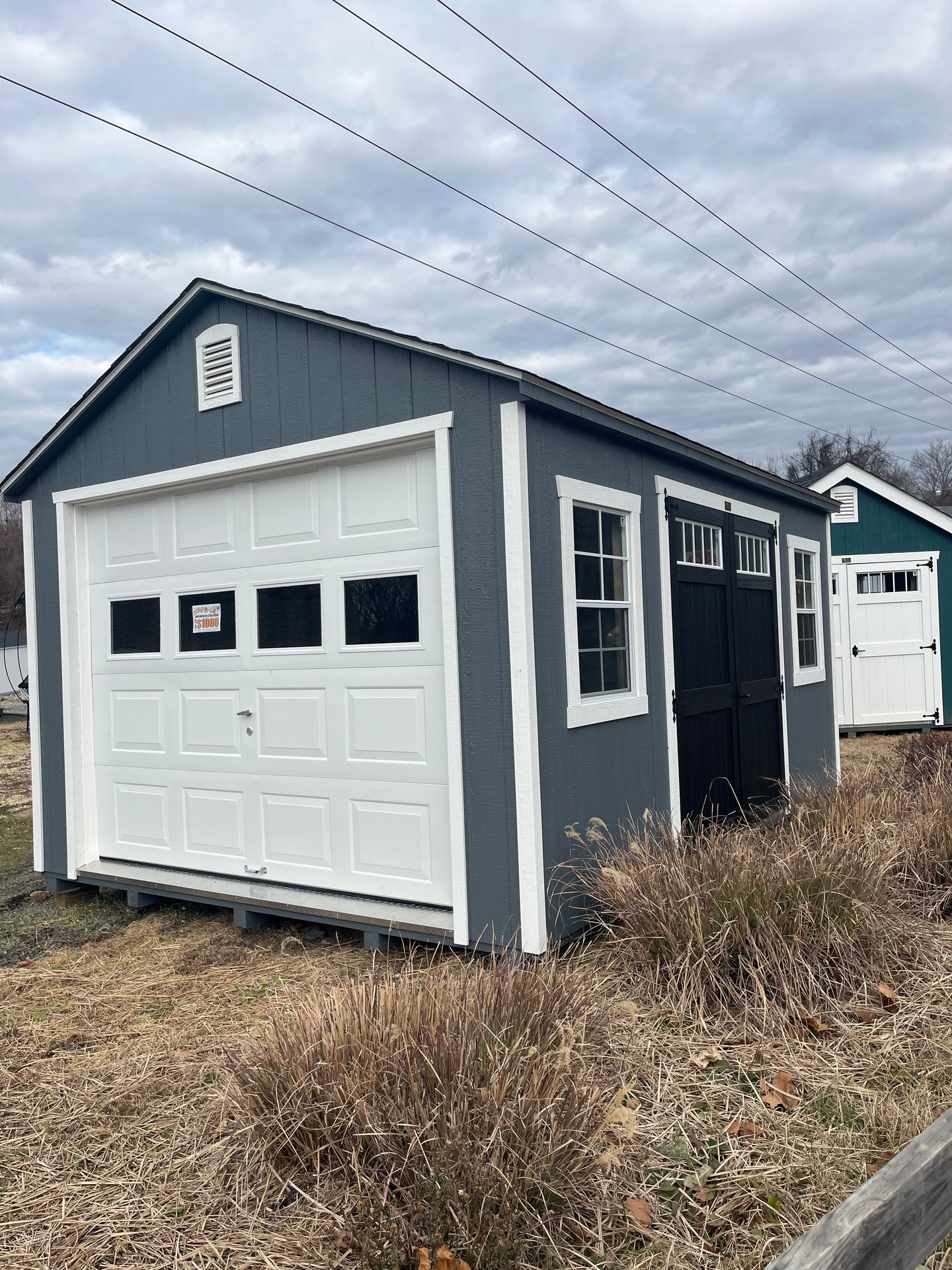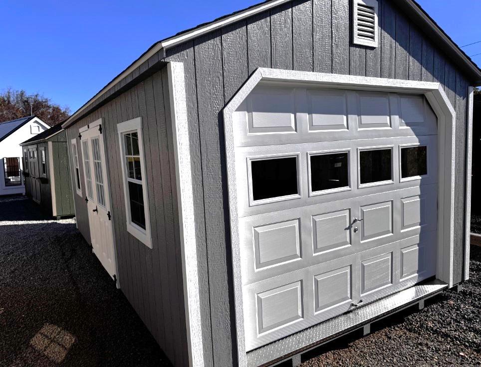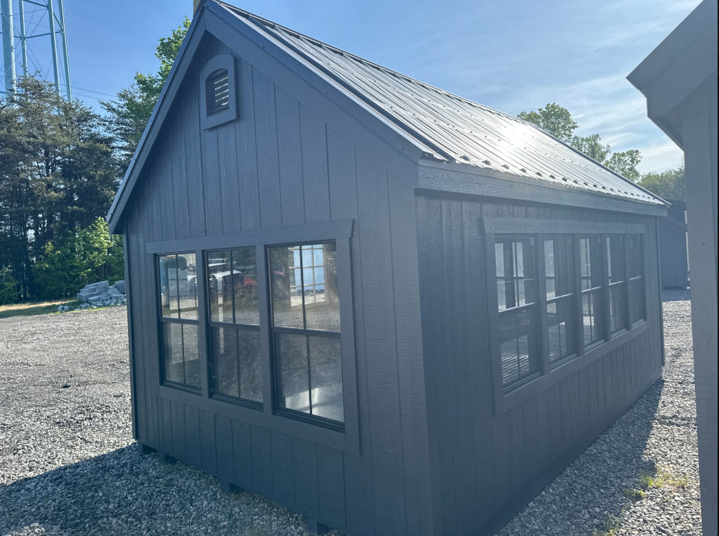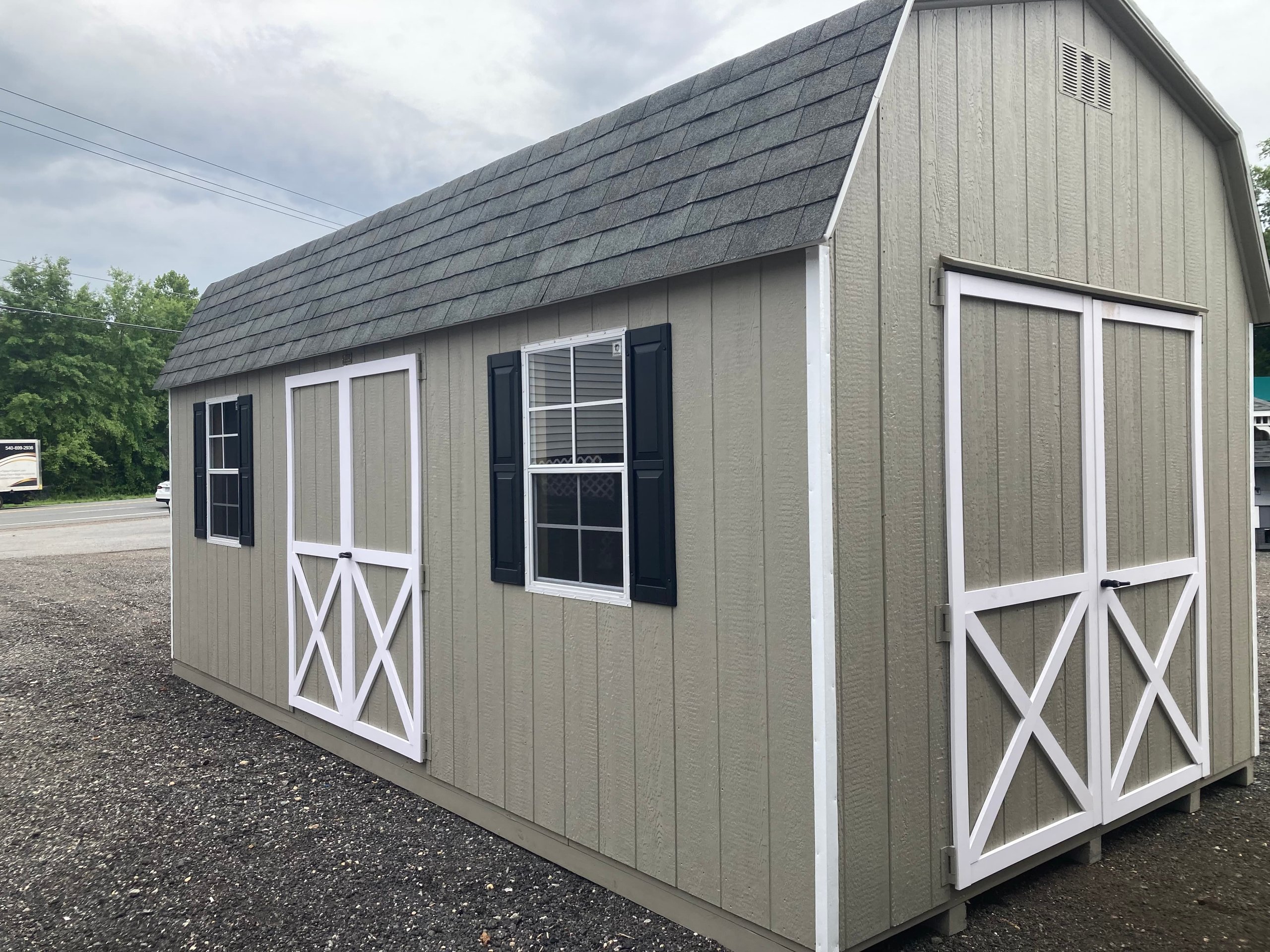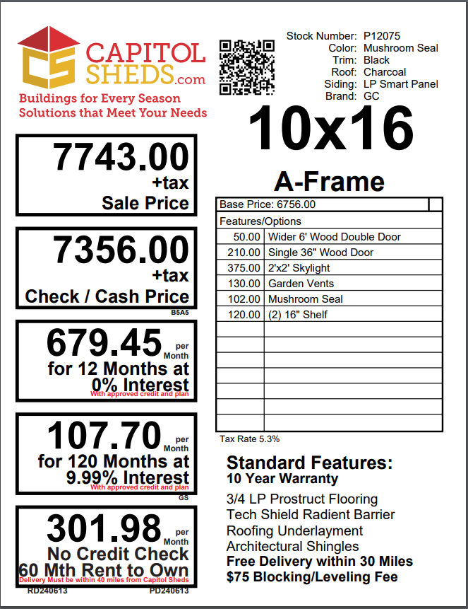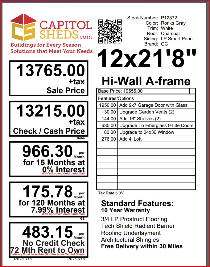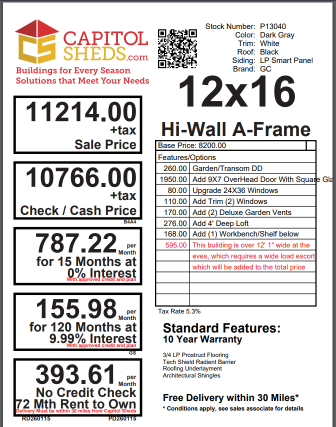 ???? Style Name: Hi Wall  A-Frame ???? Size: 12X16 ????️ Siding: LP Smart Panel ???? Main Color: Dark Gray ???? Trim Color: White ???? Roof Color: Black ???? Number of Windows: 2 ???? Flooring: 3/4″ LP Prostruct Flooring Included Upgrades: Garden/Transom DD Add 9X7 Overhead Door With Glass uPGRADE (2) 24×36 Windows Add Trim (2) Windows Add (2) Deluxe Garden Vents Add 4′ Deep Loft Add W@orkbench W/ Shelf Below