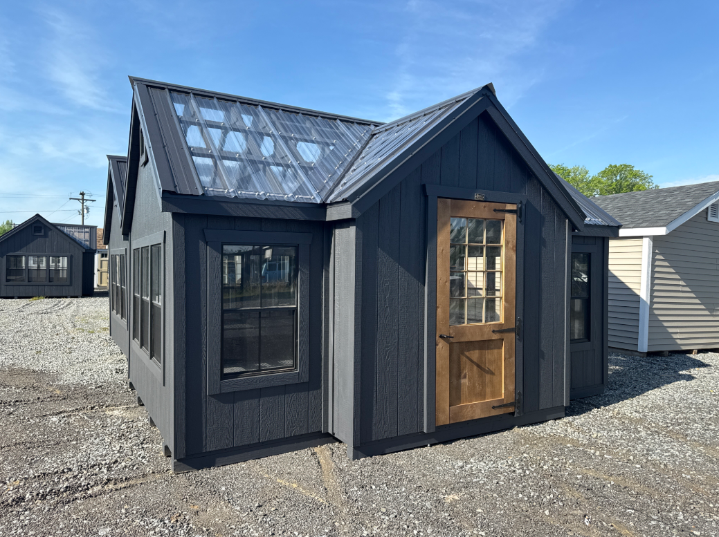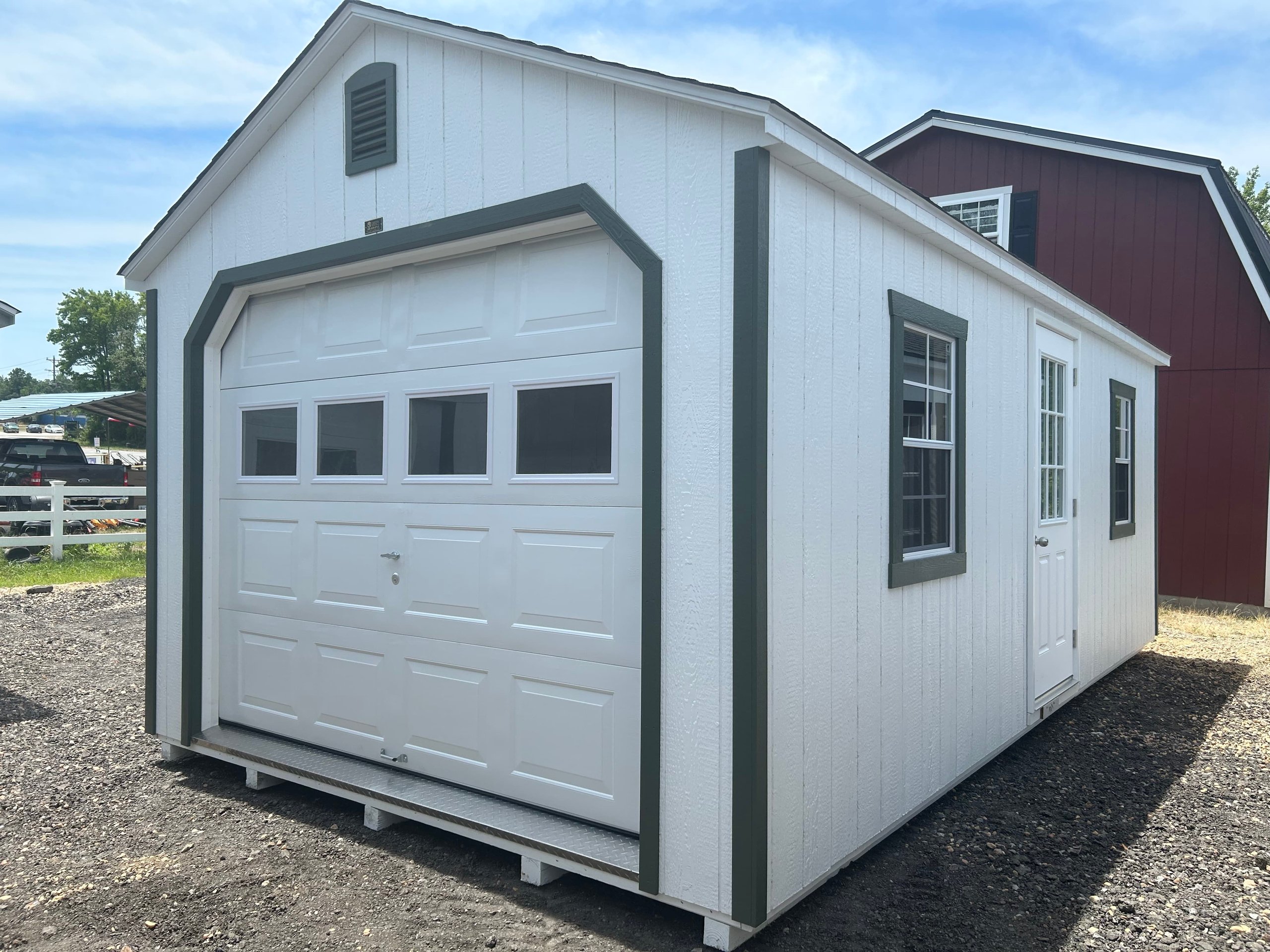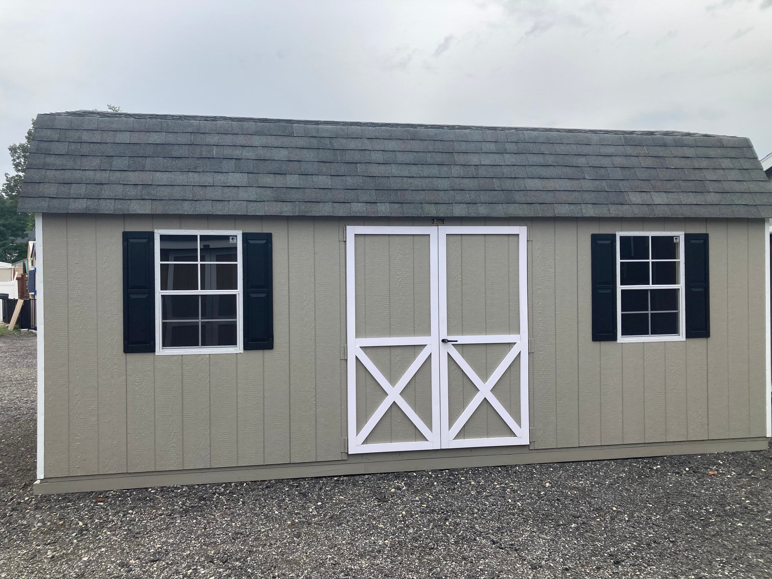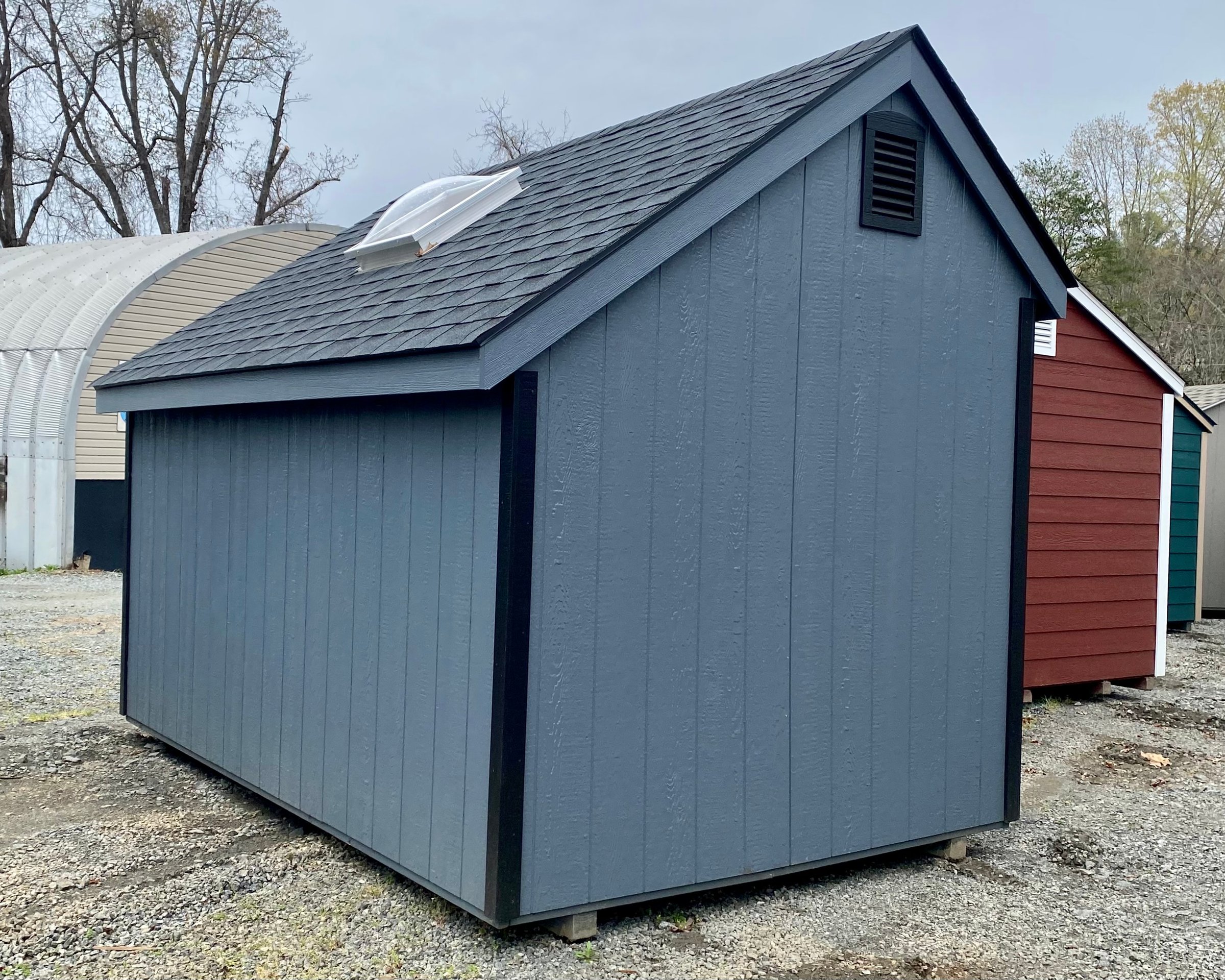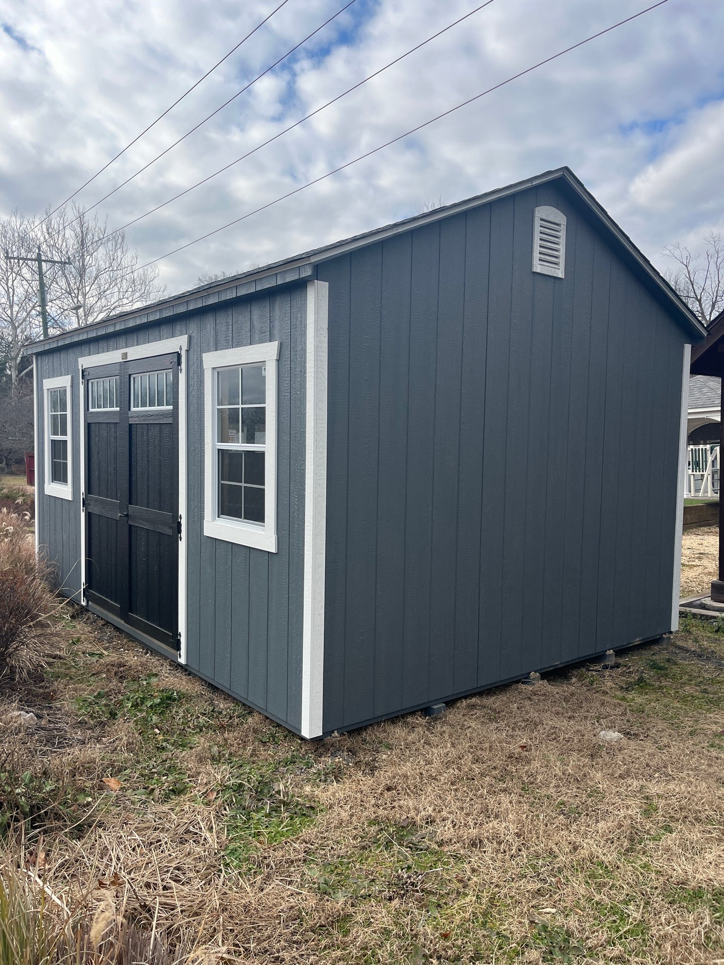 ???? Style Name: Hi Wall  A-Frame ???? Size: 12X16 ????️ Siding: LP Smart Panel ???? Main Color: Dark Gray ???? Trim Color: White ???? Roof Color: Black ???? Number of Windows: 2 ???? Flooring: 3/4″ LP Prostruct Flooring Included Upgrades: Garden/Transom DD Add 9X7 Overhead Door With Glass uPGRADE (2) 24×36 Windows Add Trim (2) Windows Add (2) Deluxe Garden Vents Add 4′ Deep Loft Add W@orkbench W/ Shelf Below
