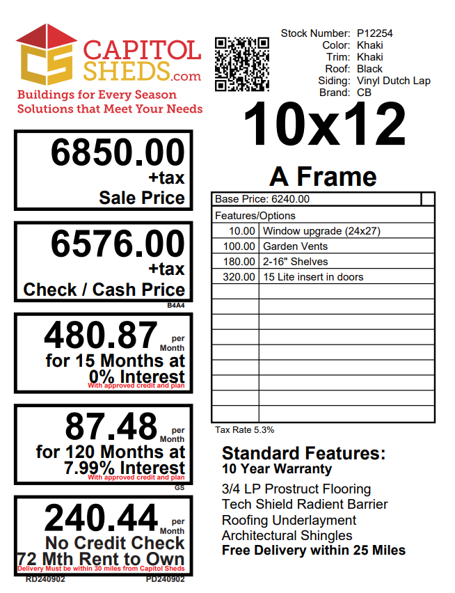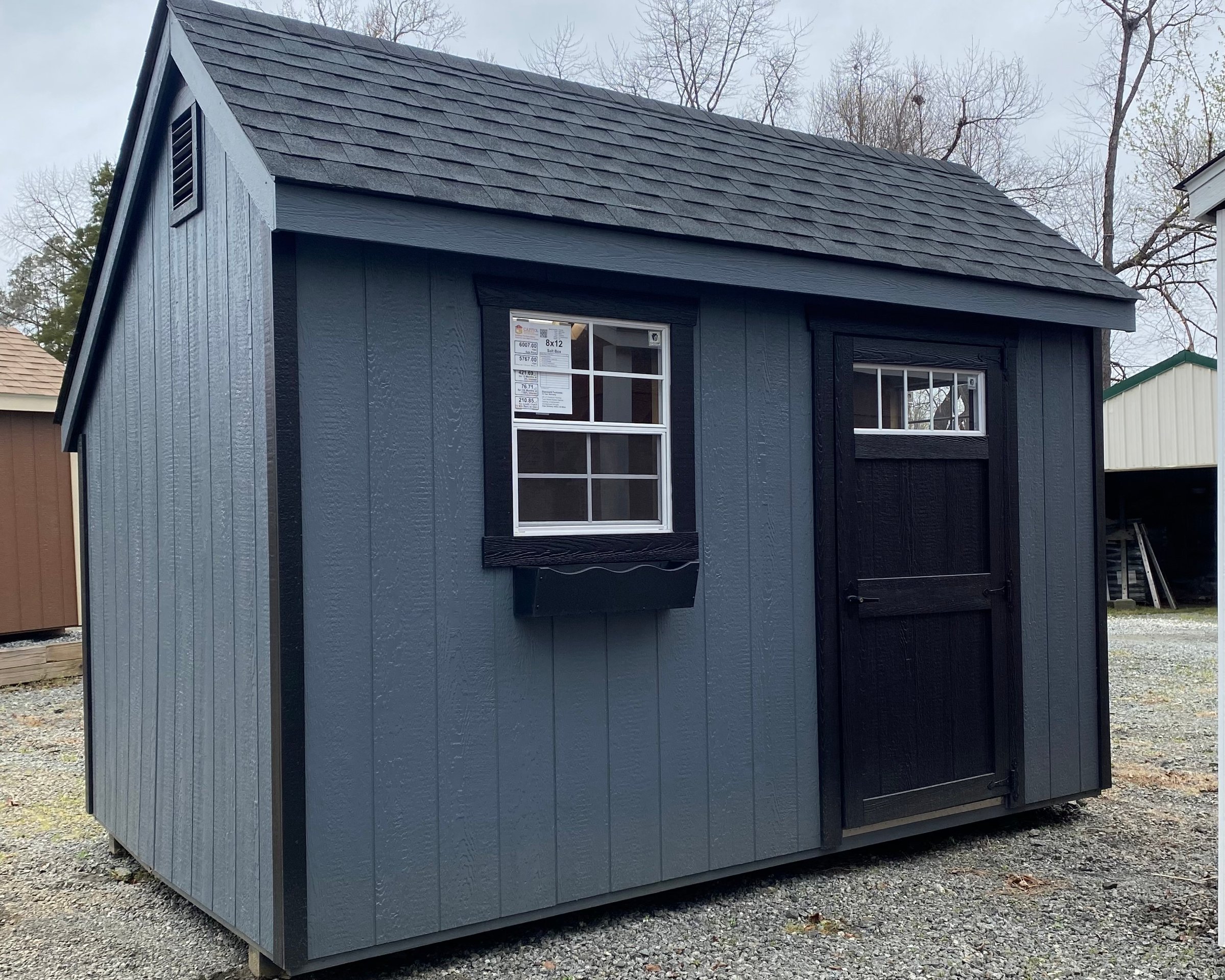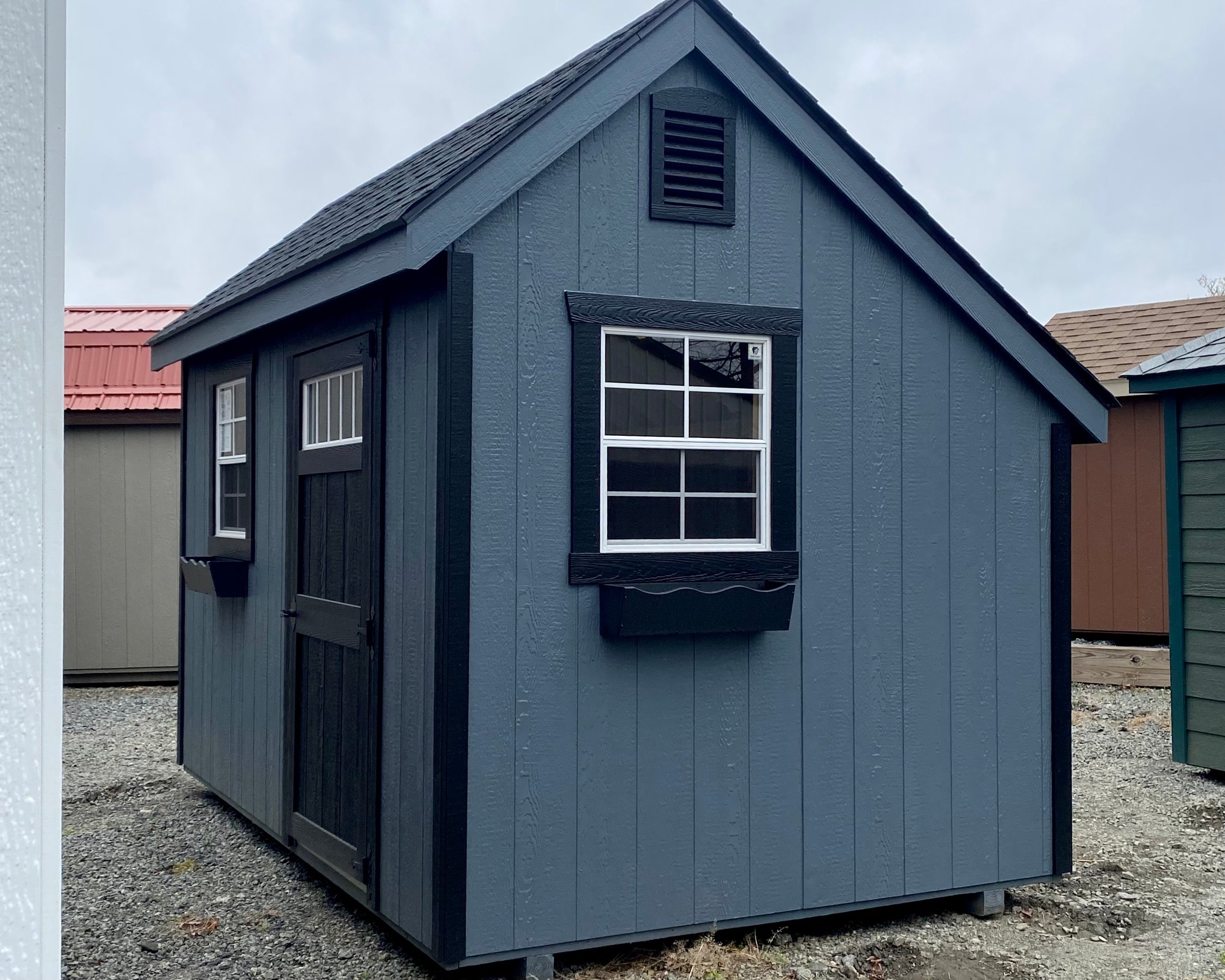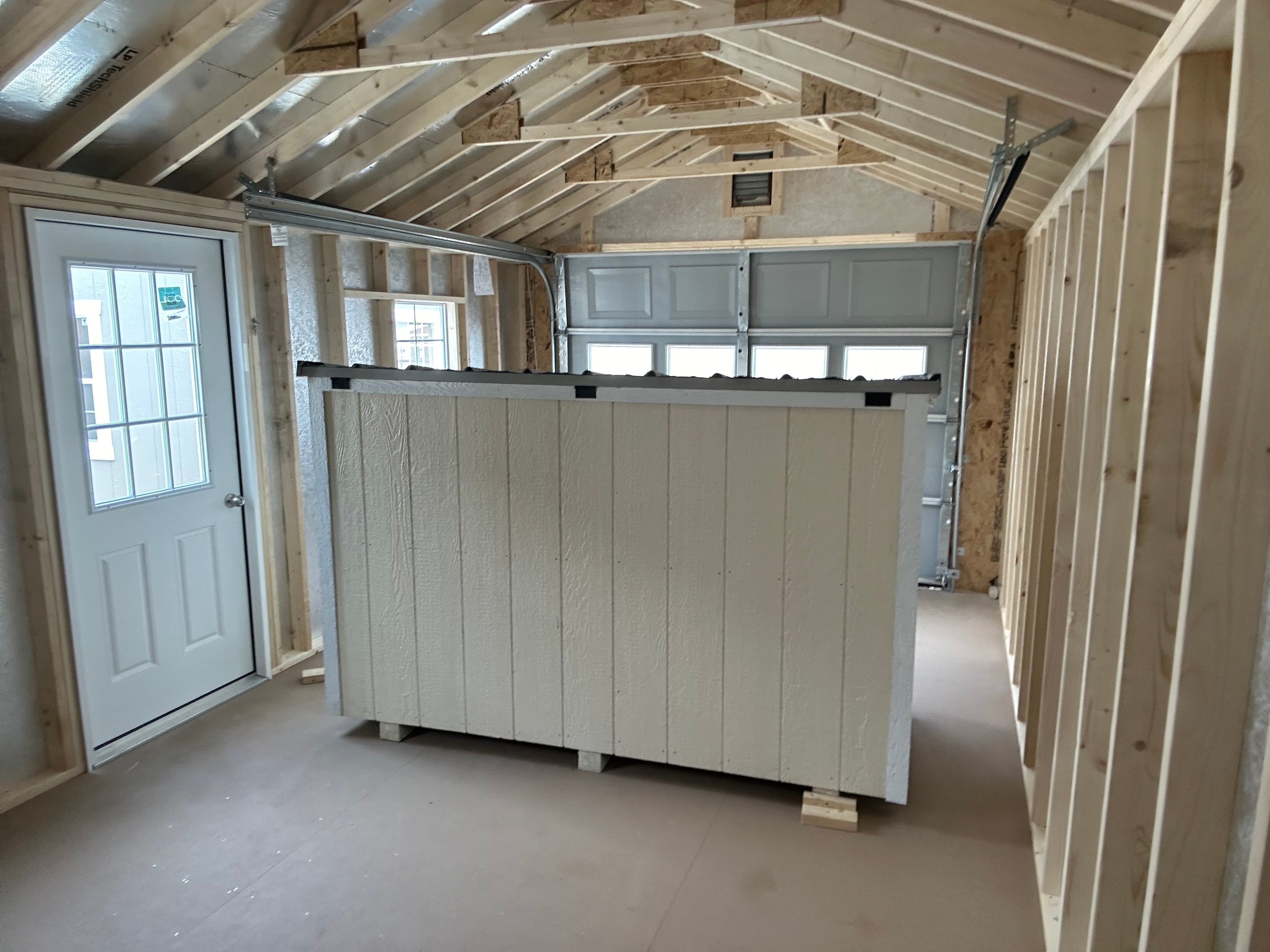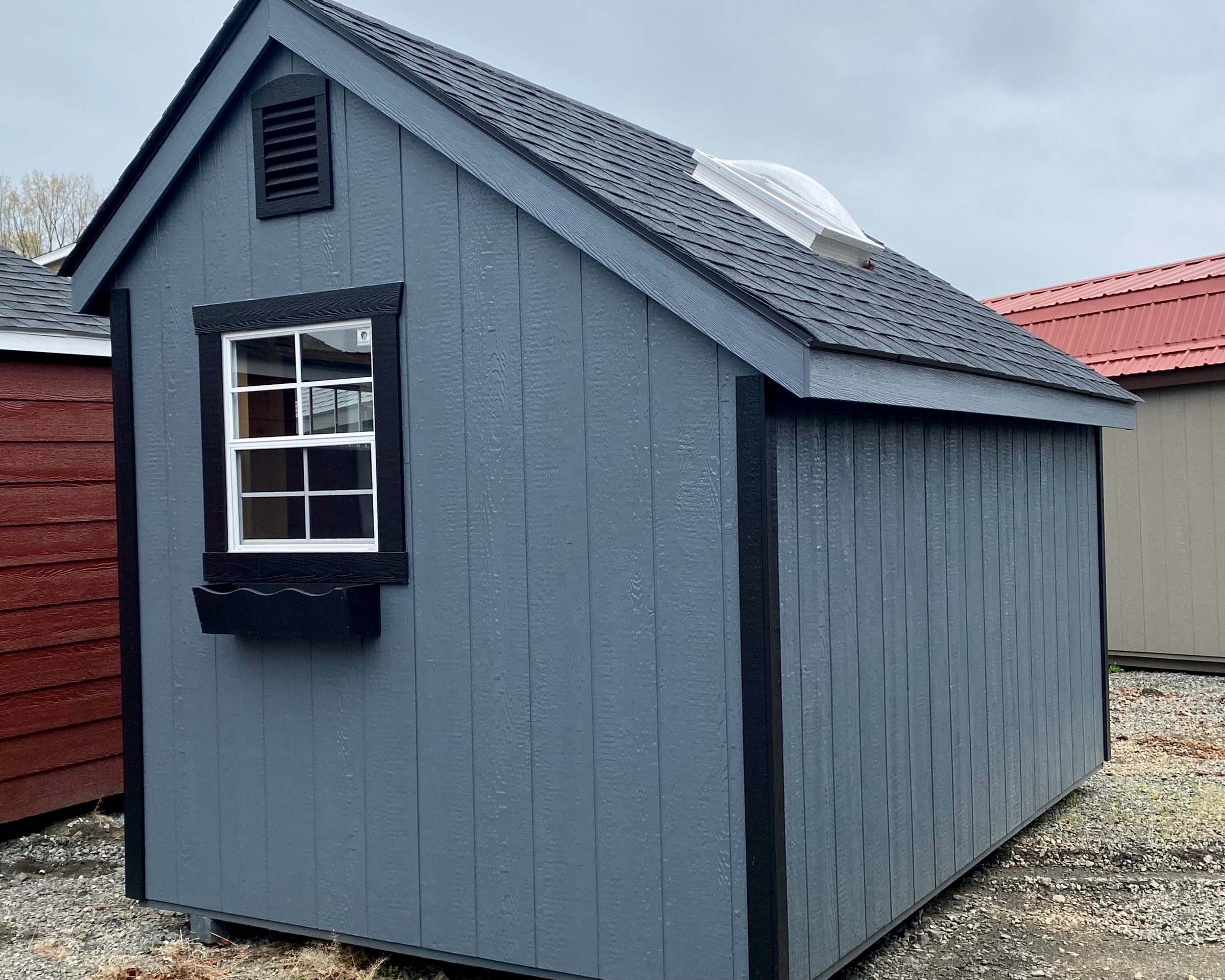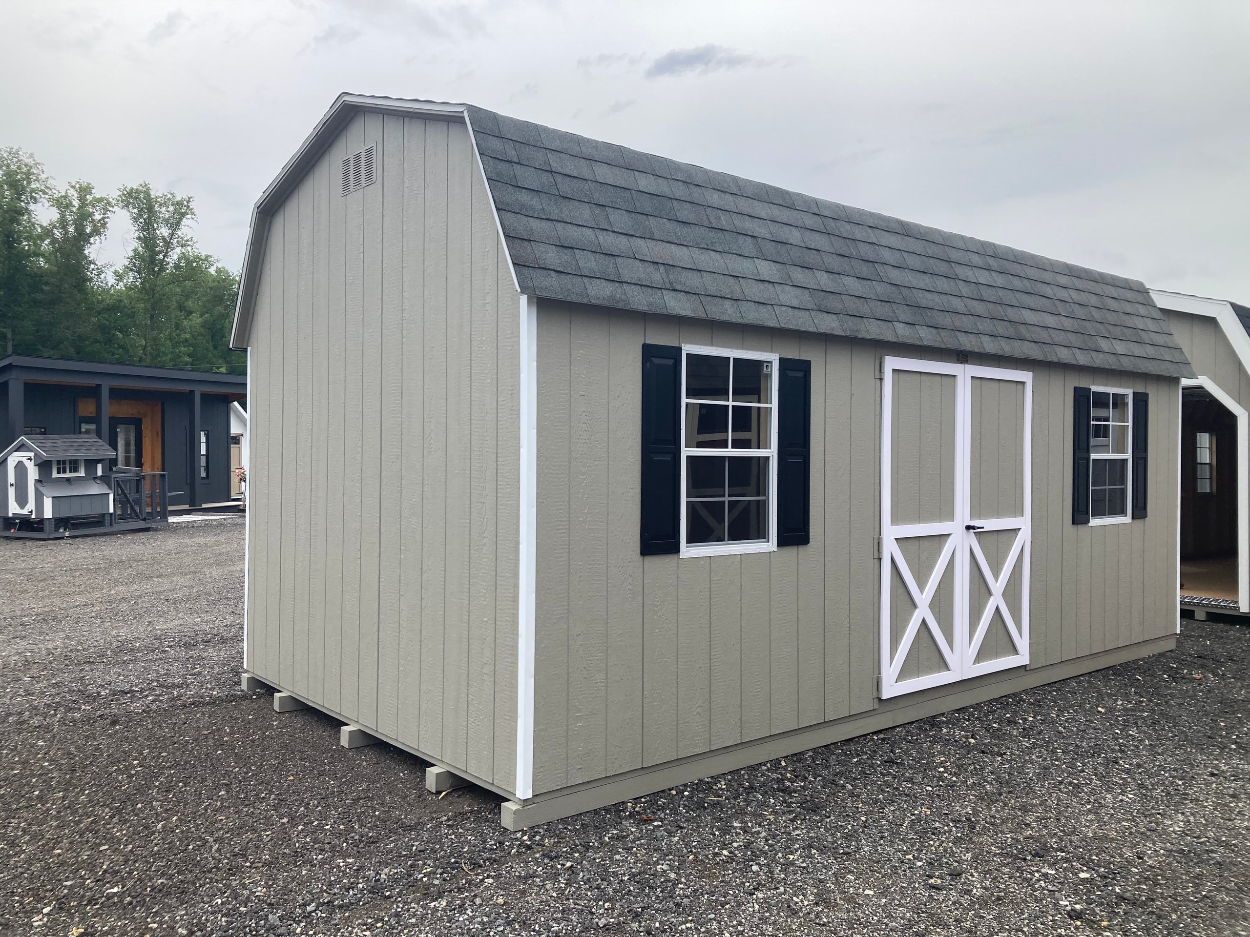 ???? Style Name: Hi Wall  A-Frame ???? Size: 12X16 ????️ Siding: LP Smart Panel ???? Main Color: Dark Gray ???? Trim Color: White ???? Roof Color: Black ???? Number of Windows: 2 ???? Flooring: 3/4″ LP Prostruct Flooring Included Upgrades: Garden/Transom DD Add 9X7 Overhead Door With Glass uPGRADE (2) 24×36 Windows Add Trim (2) Windows Add (2) Deluxe Garden Vents Add 4′ Deep Loft Add W@orkbench W/ Shelf Below