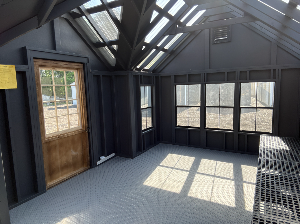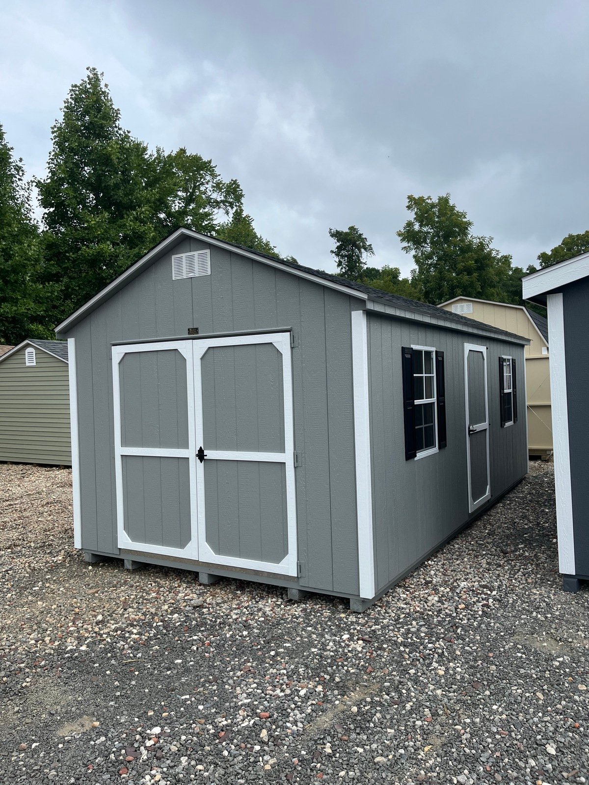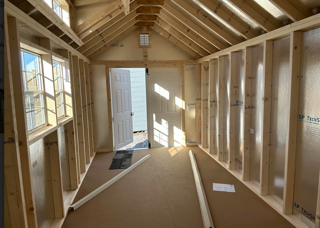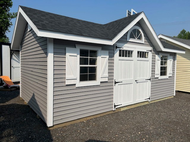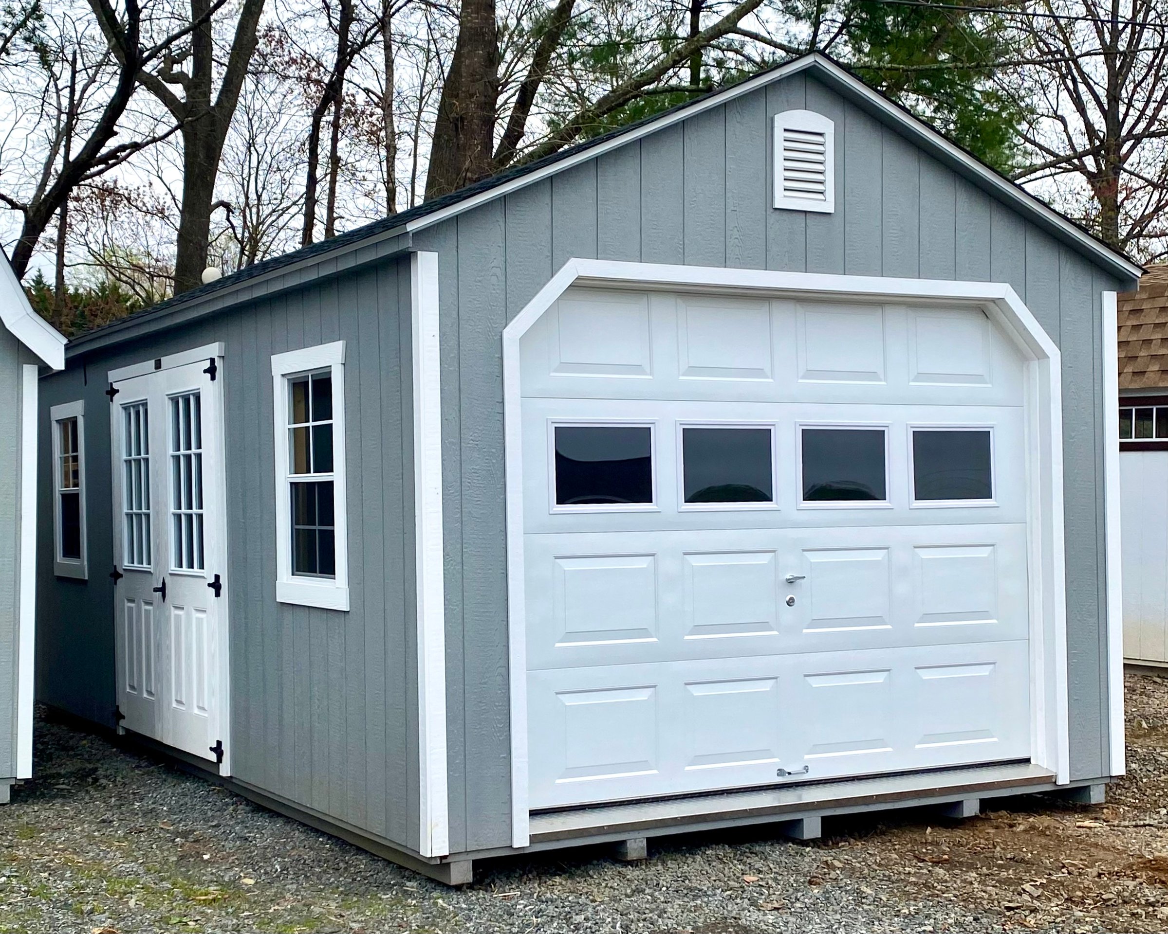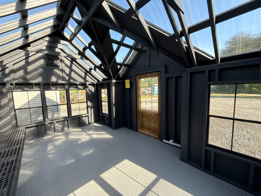 ???? Style Name: Hi Wall  A-Frame ???? Size: 12X16 ????️ Siding: LP Smart Panel ???? Main Color: Dark Gray ???? Trim Color: White ???? Roof Color: Black ???? Number of Windows: 2 ???? Flooring: 3/4″ LP Prostruct Flooring Included Upgrades: Garden/Transom DD Add 9X7 Overhead Door With Glass uPGRADE (2) 24×36 Windows Add Trim (2) Windows Add (2) Deluxe Garden Vents Add 4′ Deep Loft Add W@orkbench W/ Shelf Below