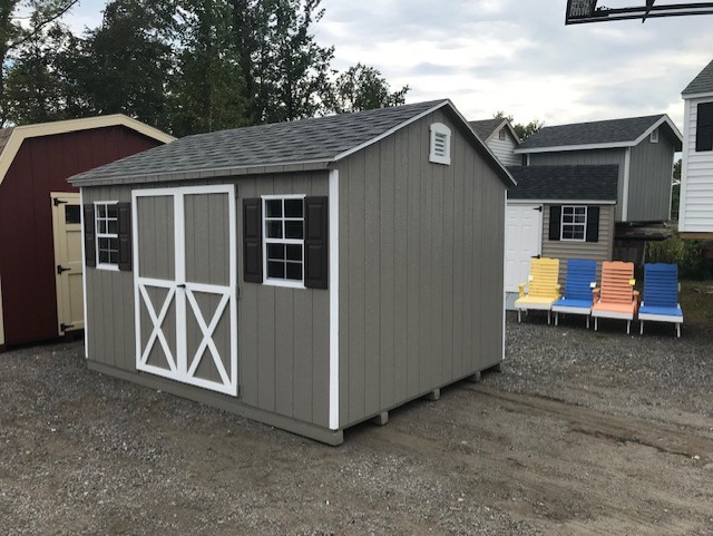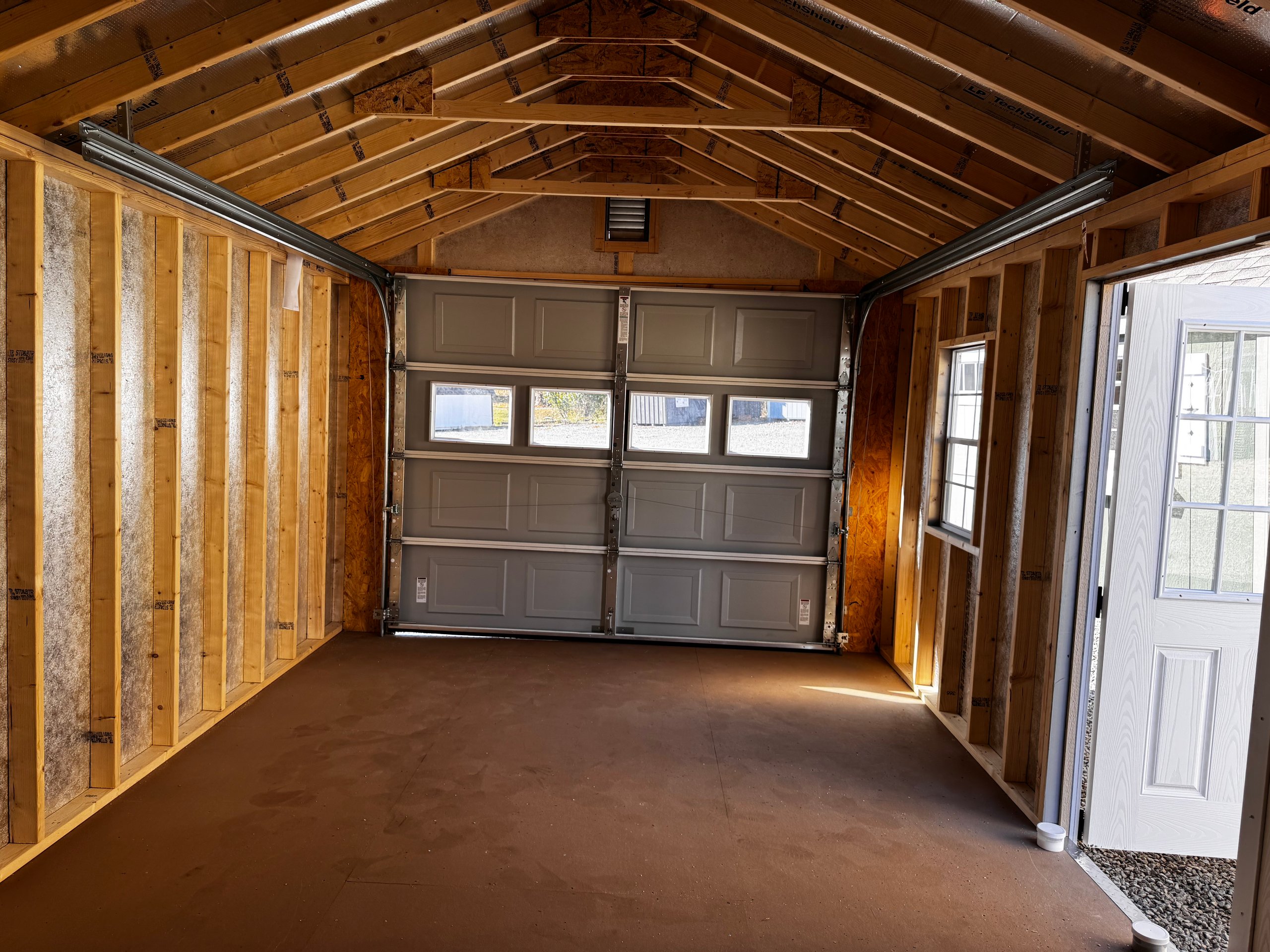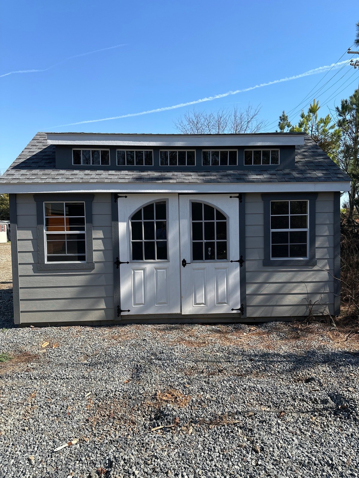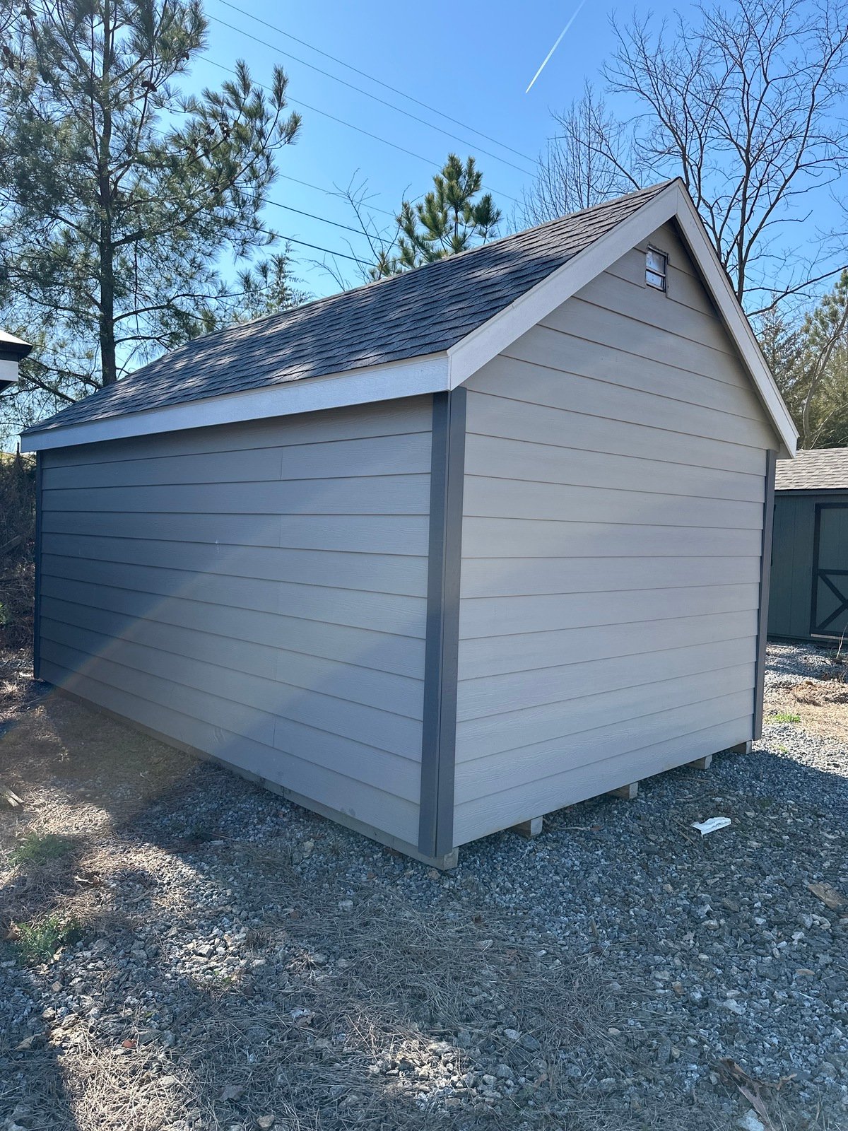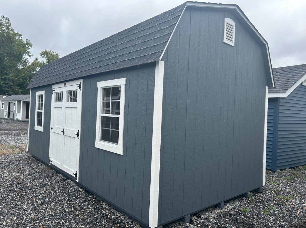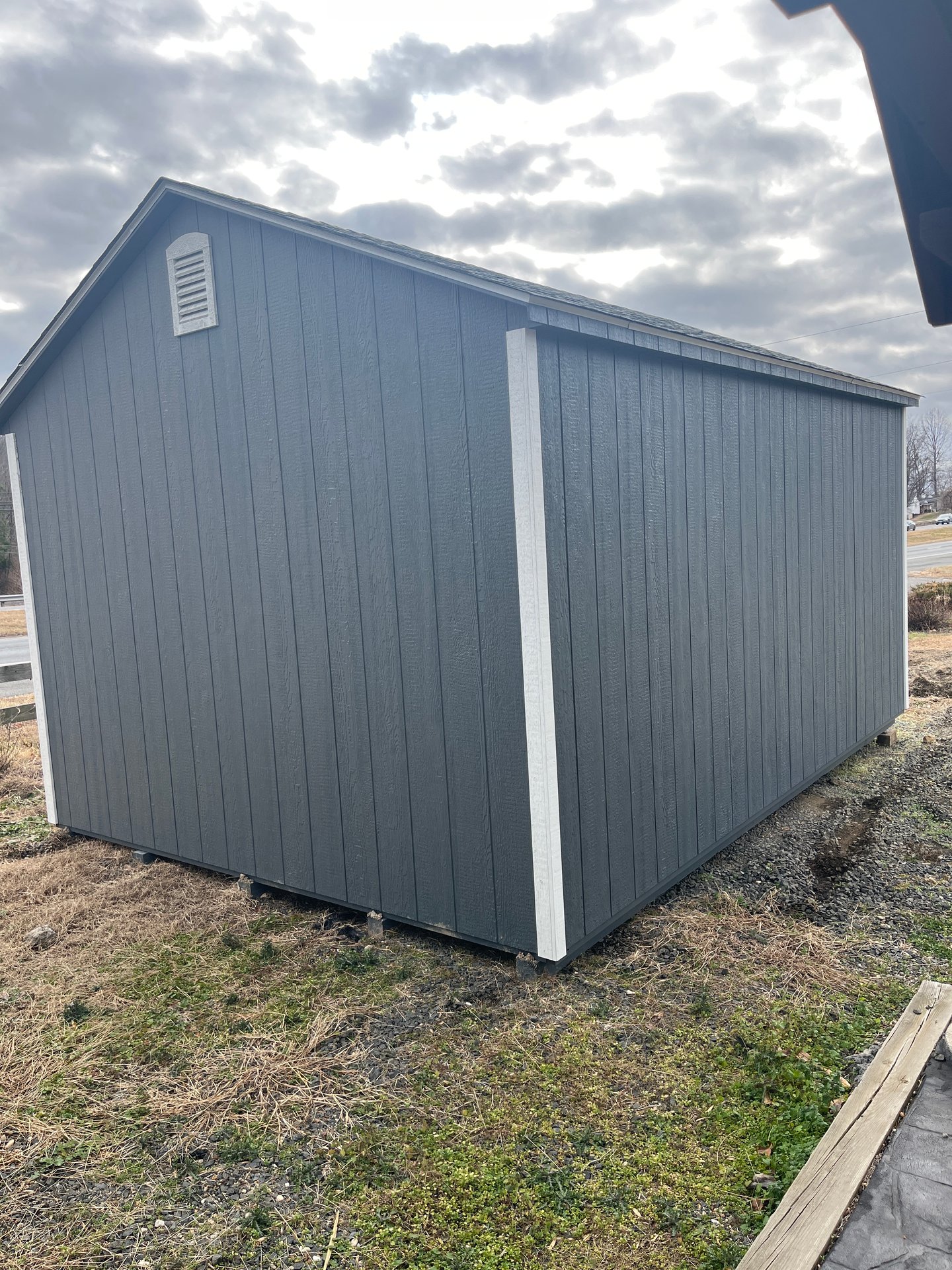 ???? Style Name: Hi Wall  A-Frame ???? Size: 12X16 ????️ Siding: LP Smart Panel ???? Main Color: Dark Gray ???? Trim Color: White ???? Roof Color: Black ???? Number of Windows: 2 ???? Flooring: 3/4″ LP Prostruct Flooring Included Upgrades: Garden/Transom DD Add 9X7 Overhead Door With Glass uPGRADE (2) 24×36 Windows Add Trim (2) Windows Add (2) Deluxe Garden Vents Add 4′ Deep Loft Add W@orkbench W/ Shelf Below