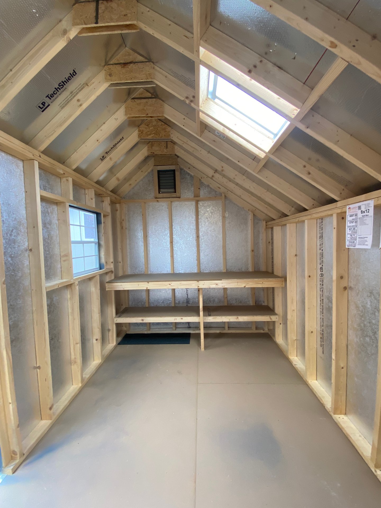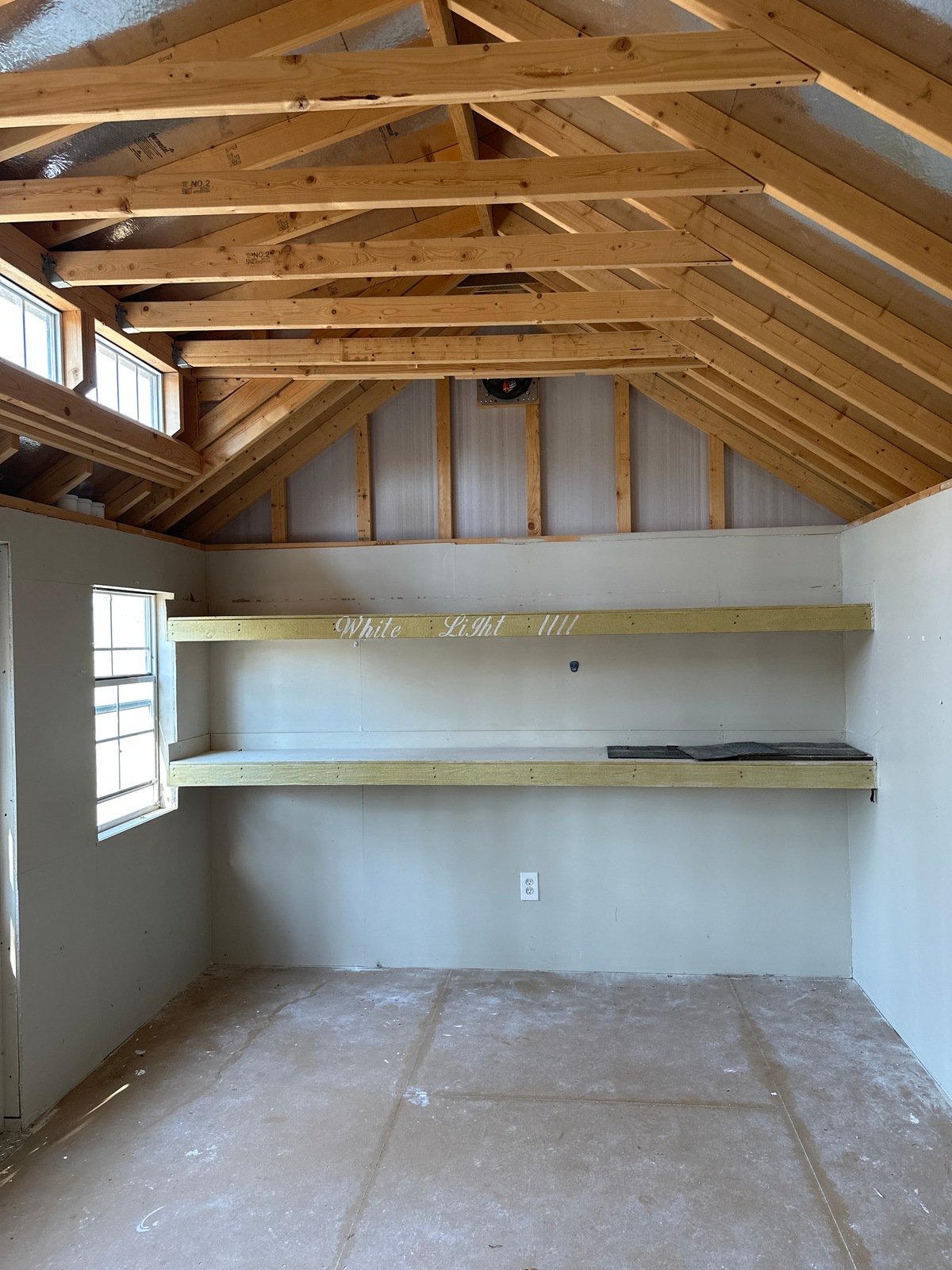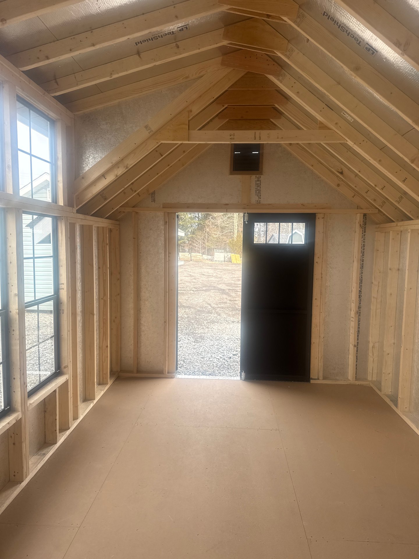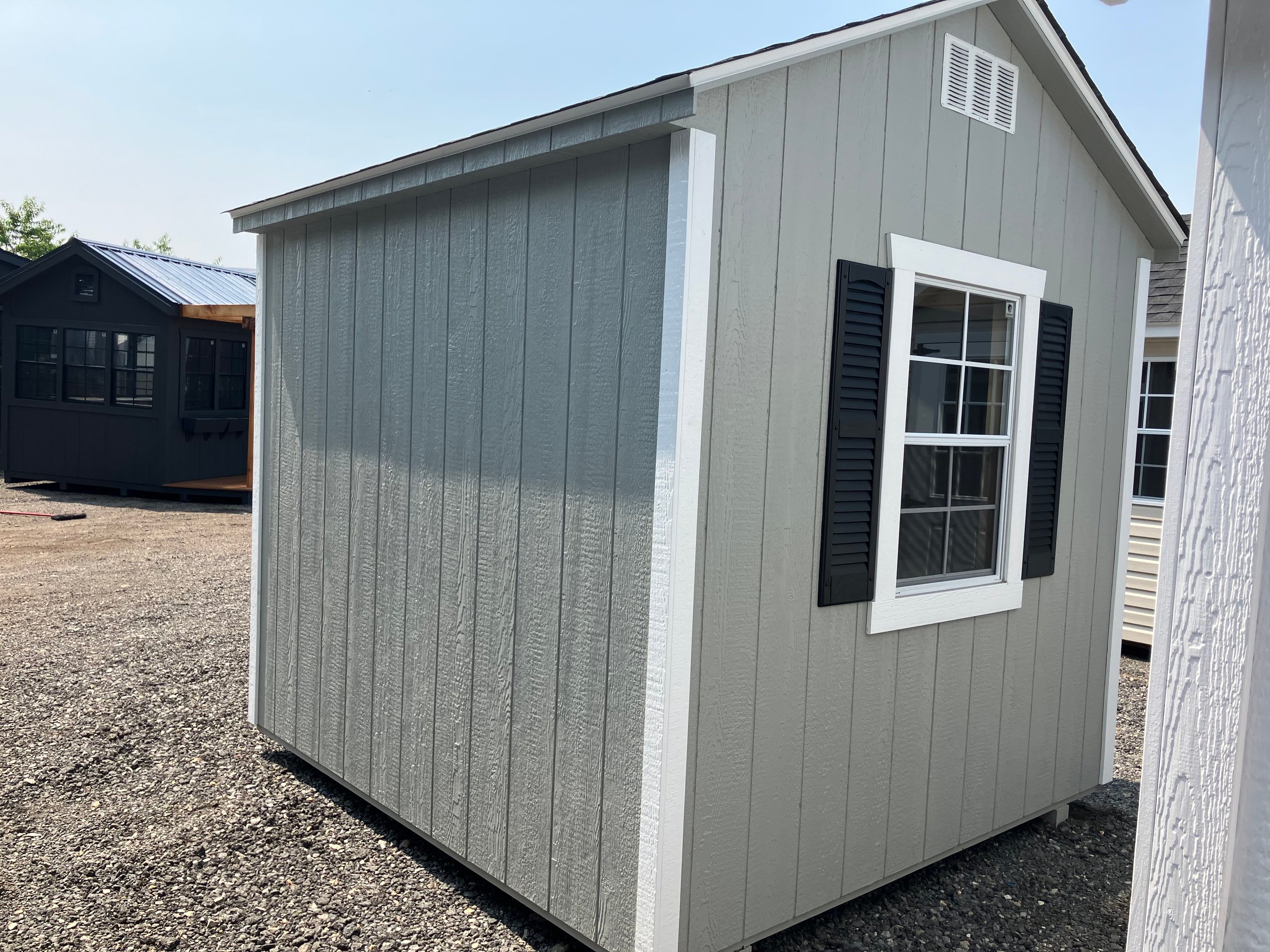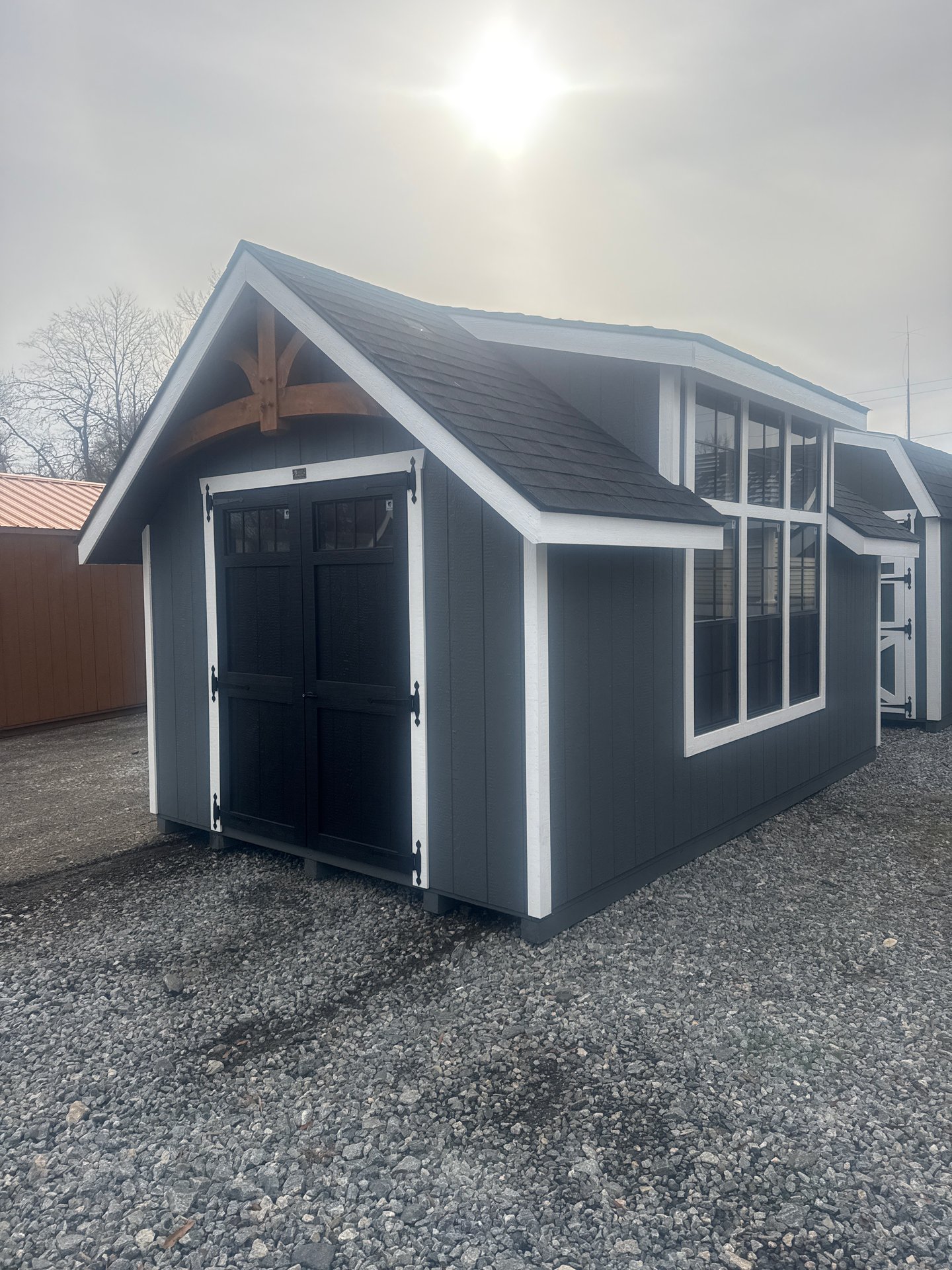 ???? Style Name: Hi Wall  A-Frame ???? Size: 12X16 ????️ Siding: LP Smart Panel ???? Main Color: Dark Gray ???? Trim Color: White ???? Roof Color: Black ???? Number of Windows: 2 ???? Flooring: 3/4″ LP Prostruct Flooring Included Upgrades: Garden/Transom DD Add 9X7 Overhead Door With Glass uPGRADE (2) 24×36 Windows Add Trim (2) Windows Add (2) Deluxe Garden Vents Add 4′ Deep Loft Add W@orkbench W/ Shelf Below