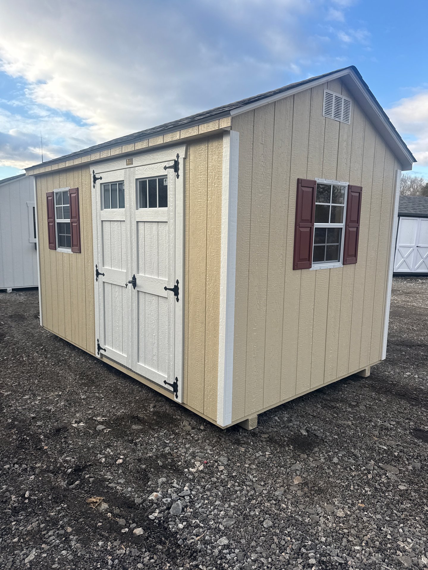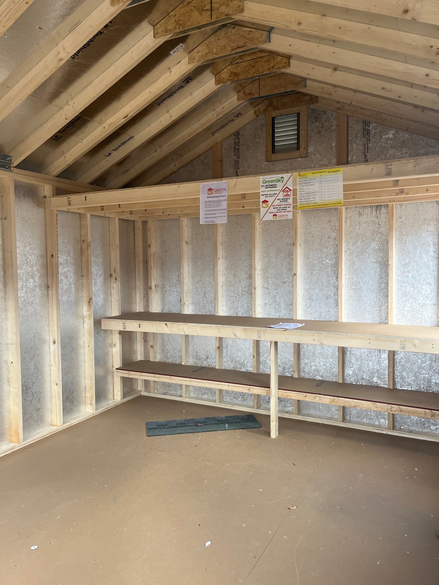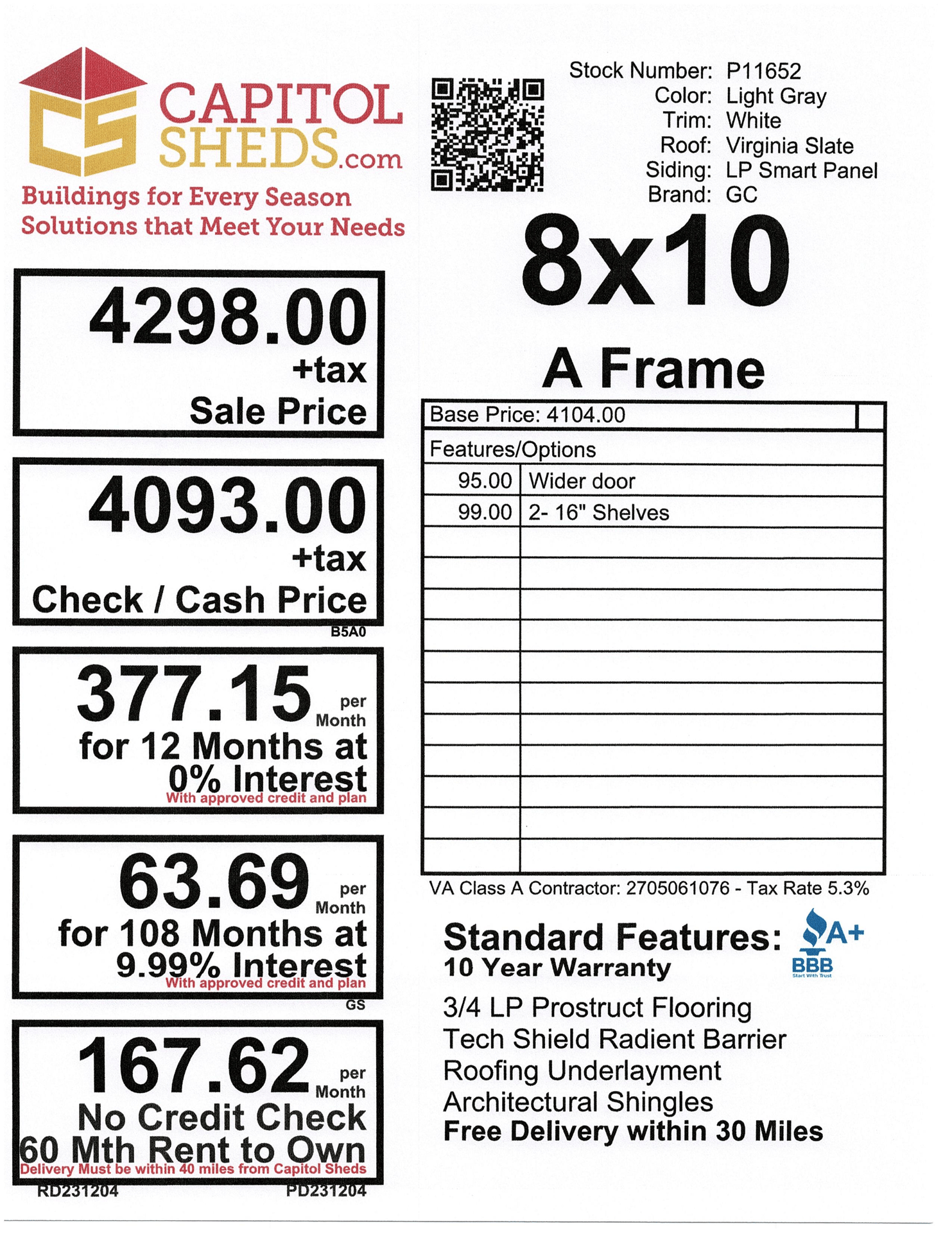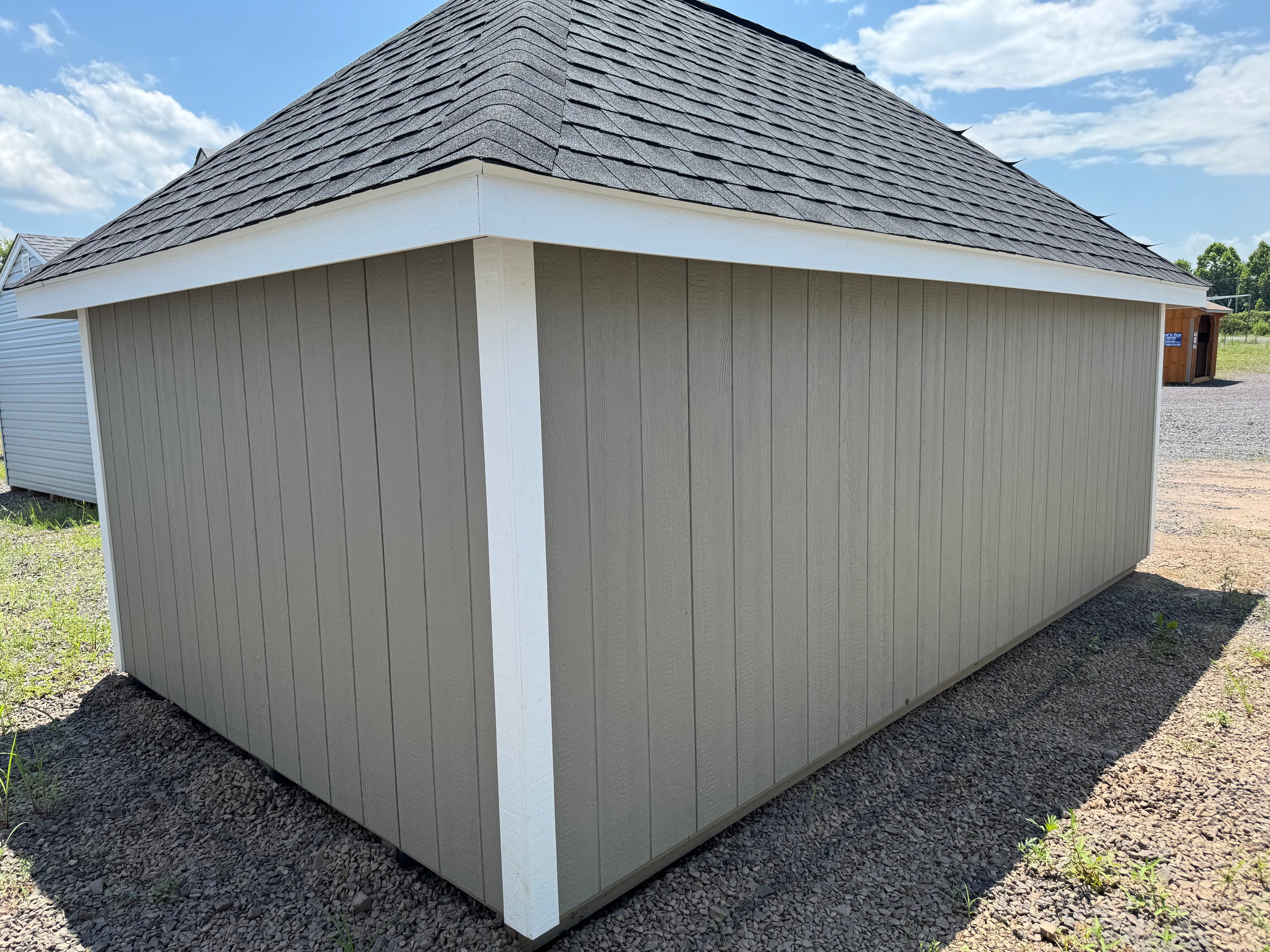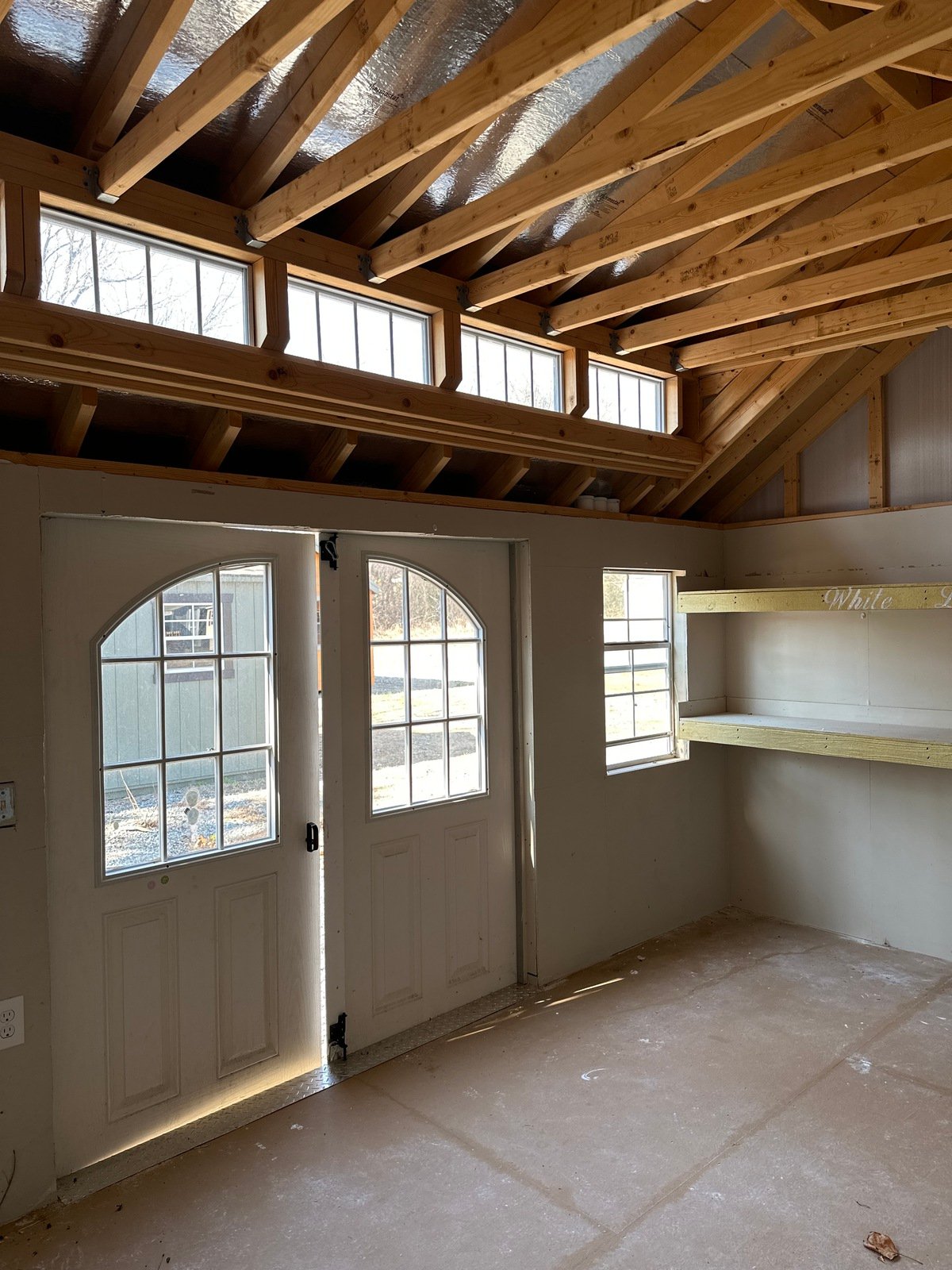 ???? Style Name: Hi Wall  A-Frame ???? Size: 12X16 ????️ Siding: LP Smart Panel ???? Main Color: Dark Gray ???? Trim Color: White ???? Roof Color: Black ???? Number of Windows: 2 ???? Flooring: 3/4″ LP Prostruct Flooring Included Upgrades: Garden/Transom DD Add 9X7 Overhead Door With Glass uPGRADE (2) 24×36 Windows Add Trim (2) Windows Add (2) Deluxe Garden Vents Add 4′ Deep Loft Add W@orkbench W/ Shelf Below