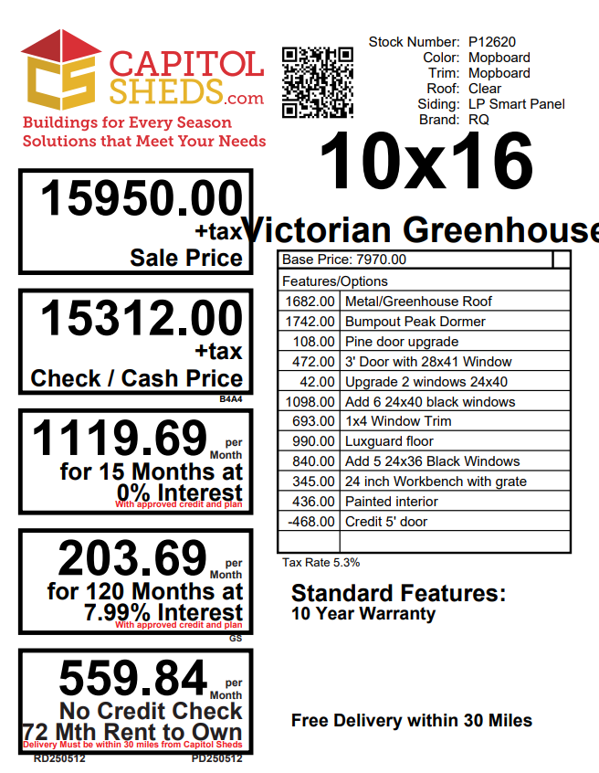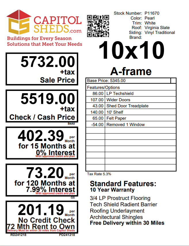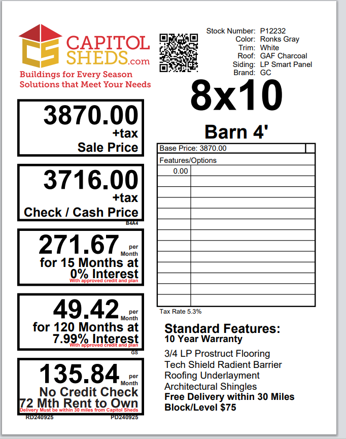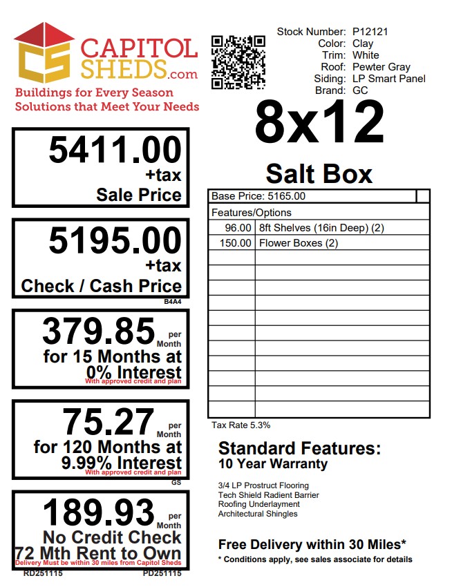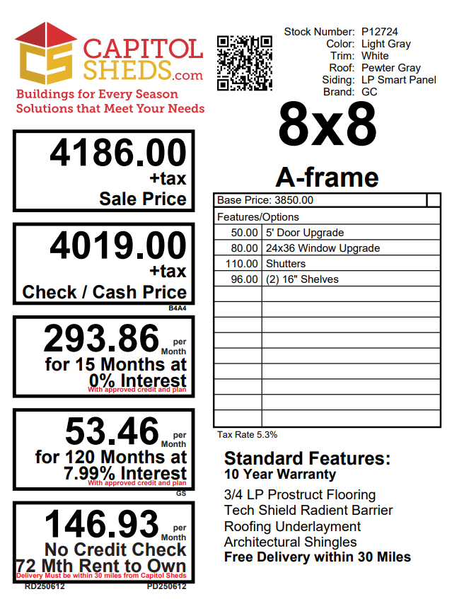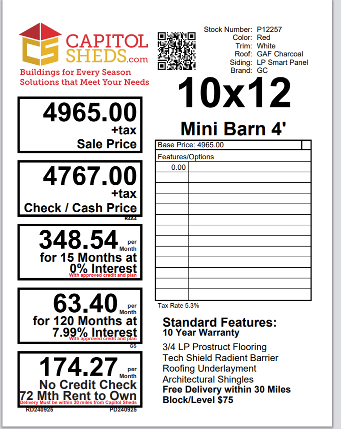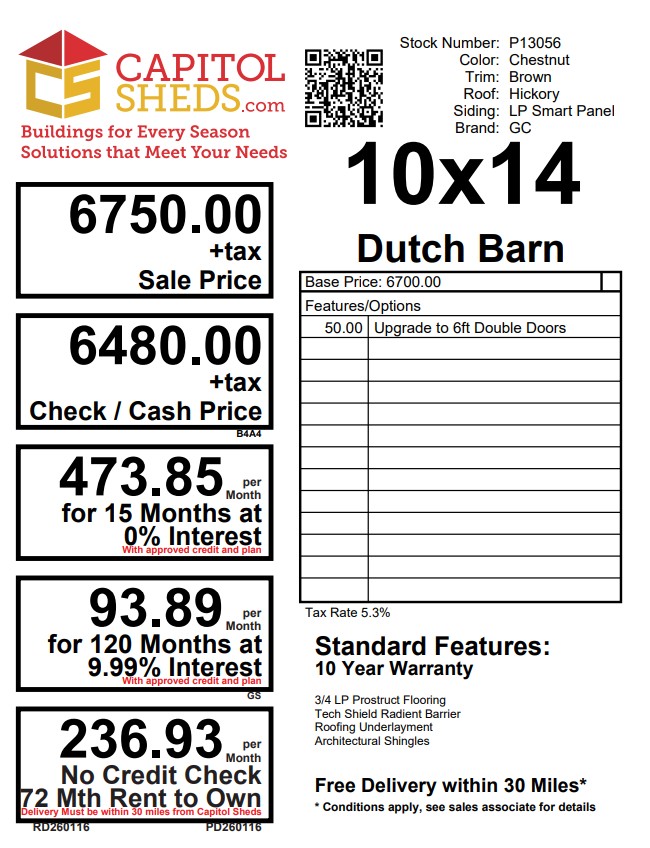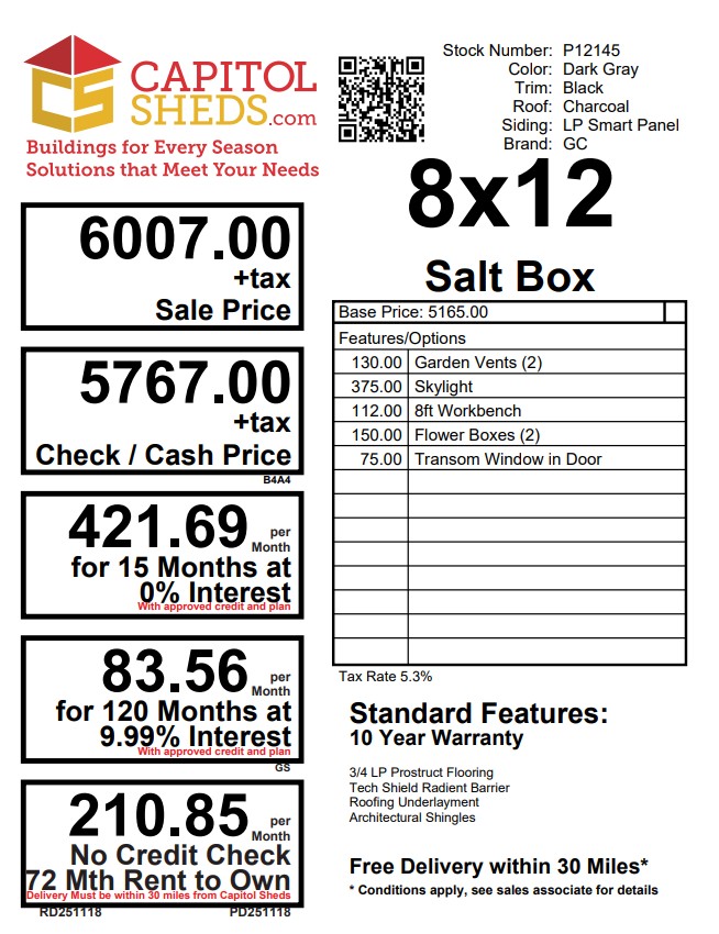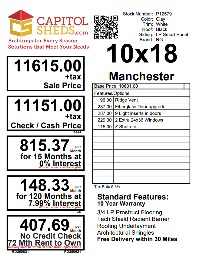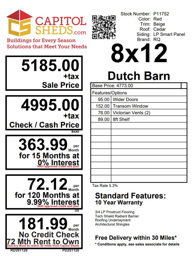 Reserve this building for a $500 deposit. Within 1 business day a rep will contact you to discuss delivery details and discounts you may qualify for such as cash/check, military/1st responder, etc. Don’t lose out on this beautiful building – Place your deposit today to hold it!