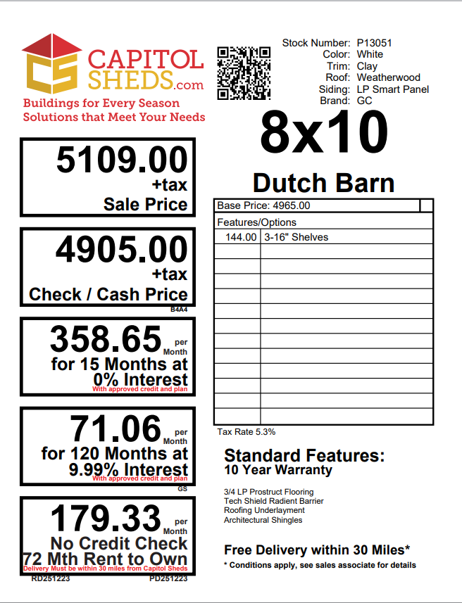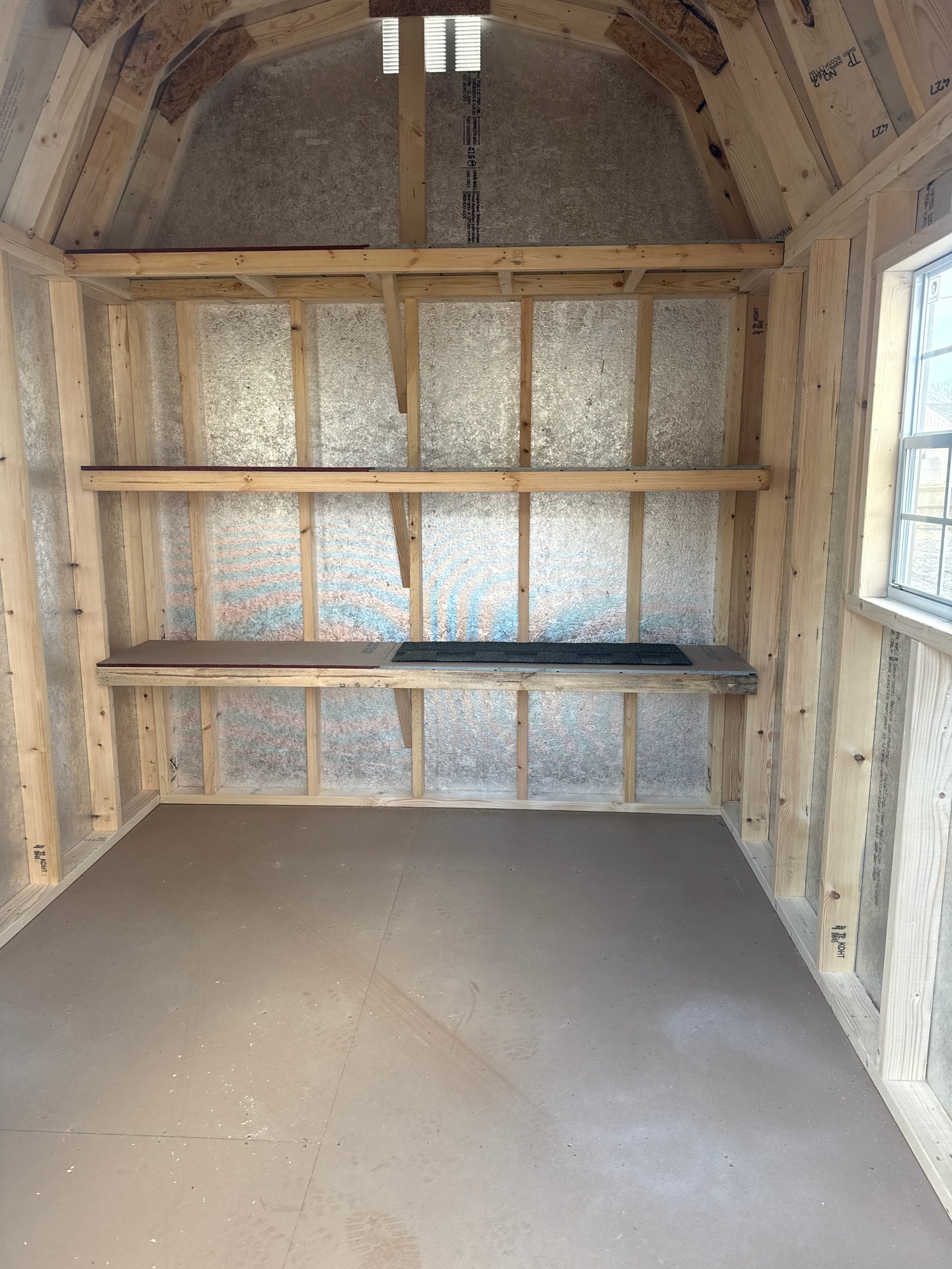 This 8×10 Dutch Barn in White with Clay trim combines classic charm with practical design. Constructed with durable Smart Panel siding, 2×4 wall and roof framing spaced 16″ on center, LP Tech Shield roof sheeting, and LP T&G Prostruct flooring on pressure-treated 2×4 joists 12″ on center, it’s built to last. Two windows bring in natural light, while the 4′ Double doors provide easy access and a stylish touch. Perfect for a storage shed, workshop, or small hobby space, this A-Frame offers a timeless design, high-quality construction, and functional features to fit any backyard or property.